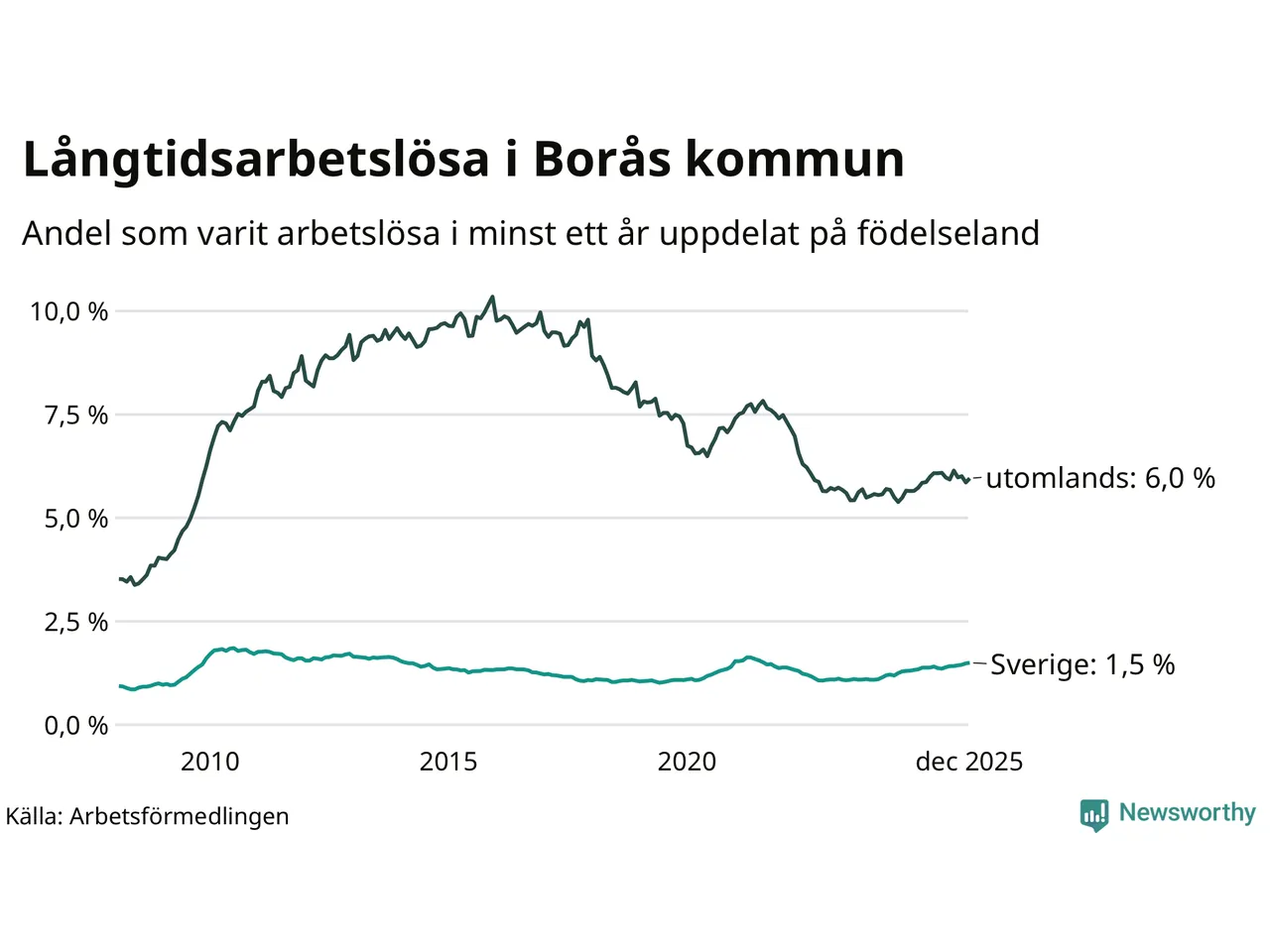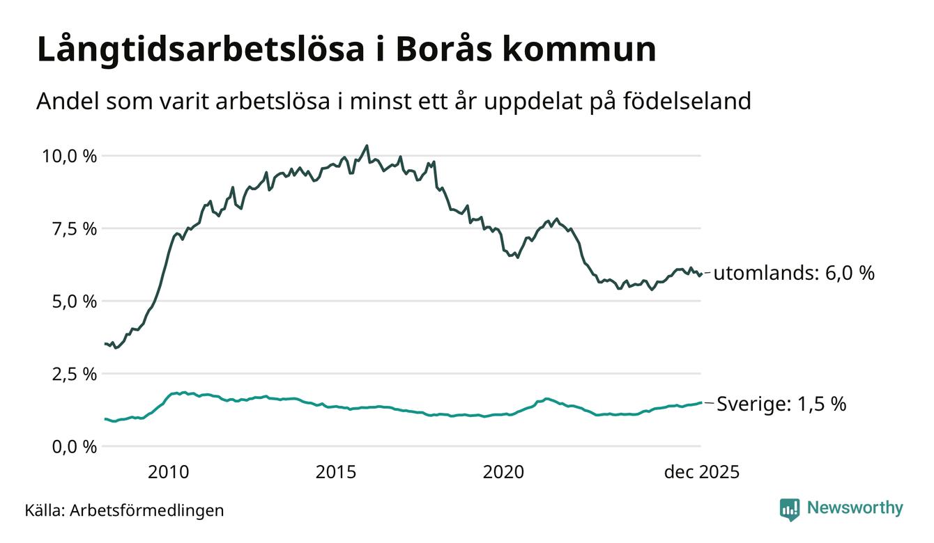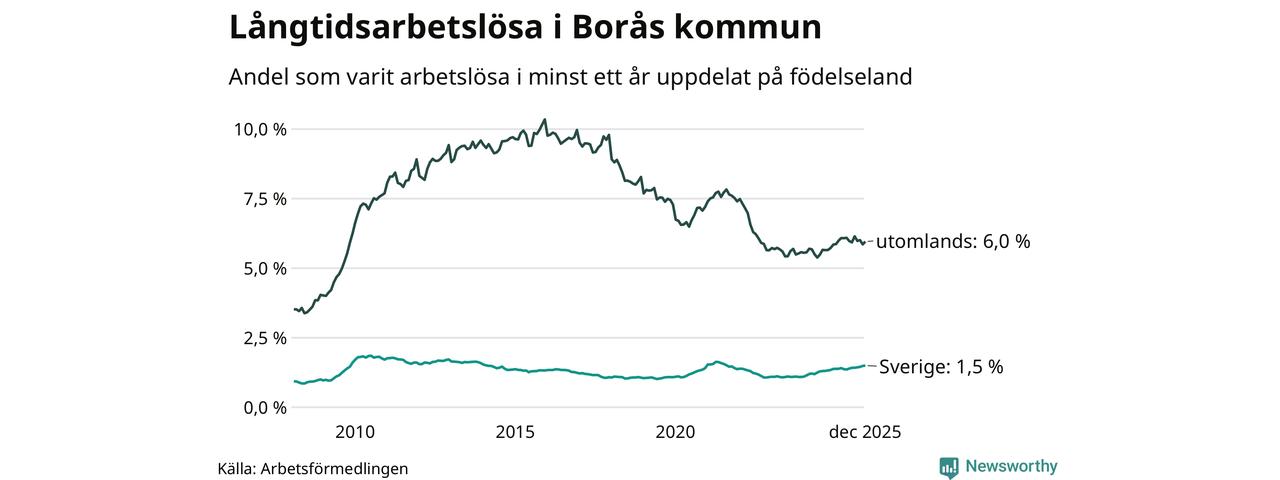 621 av de långtidsarbetslösa i Borås är födda i Sverige, medan 996 är födda utomlands. Det innebär att långtidsarbetslösheten bland Sverigefödda är 1,5 procent, medan den är fyra gånger så hög – 6,0 procent – bland födda utomlands. Även i riket som helhet är arbetslösheten högre bland utrikesfödda.