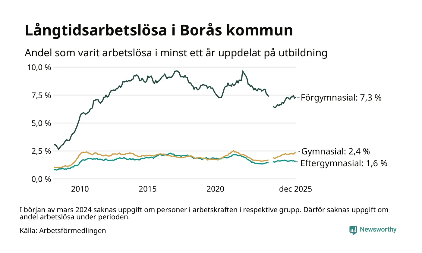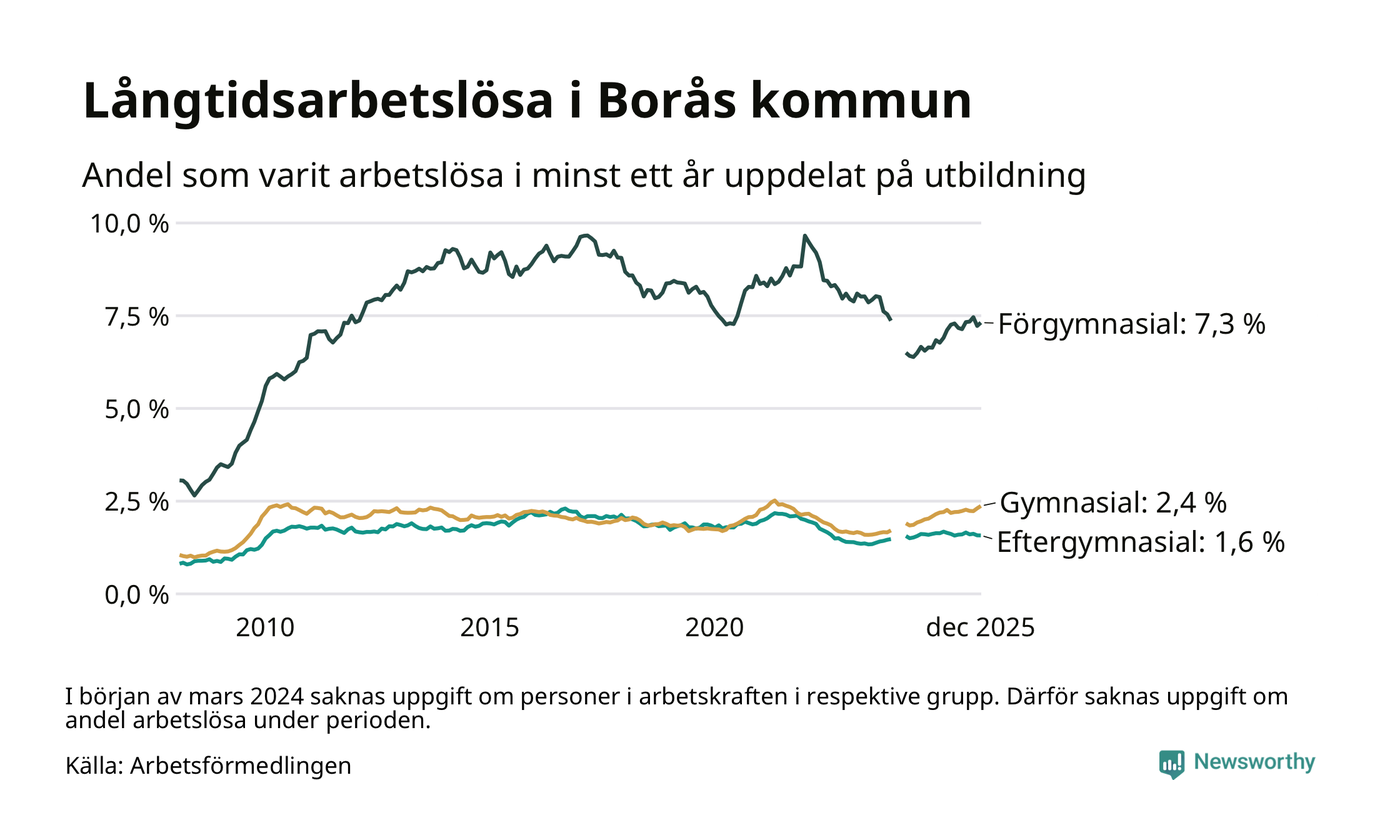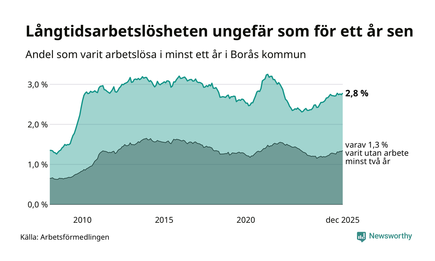 I december hade 1 617 Boråsbor varit arbetslösa i minst ett år, vilket är 23 fler än månaden innan. 1 617 personer motsvarar 2,8 procent av arbetskraften i kommunen – andelen långtidsarbetslösa är ungefär på samma nivå som för ett år sedan.