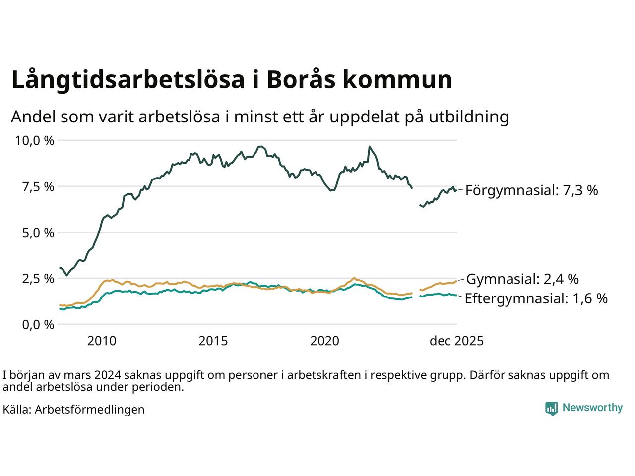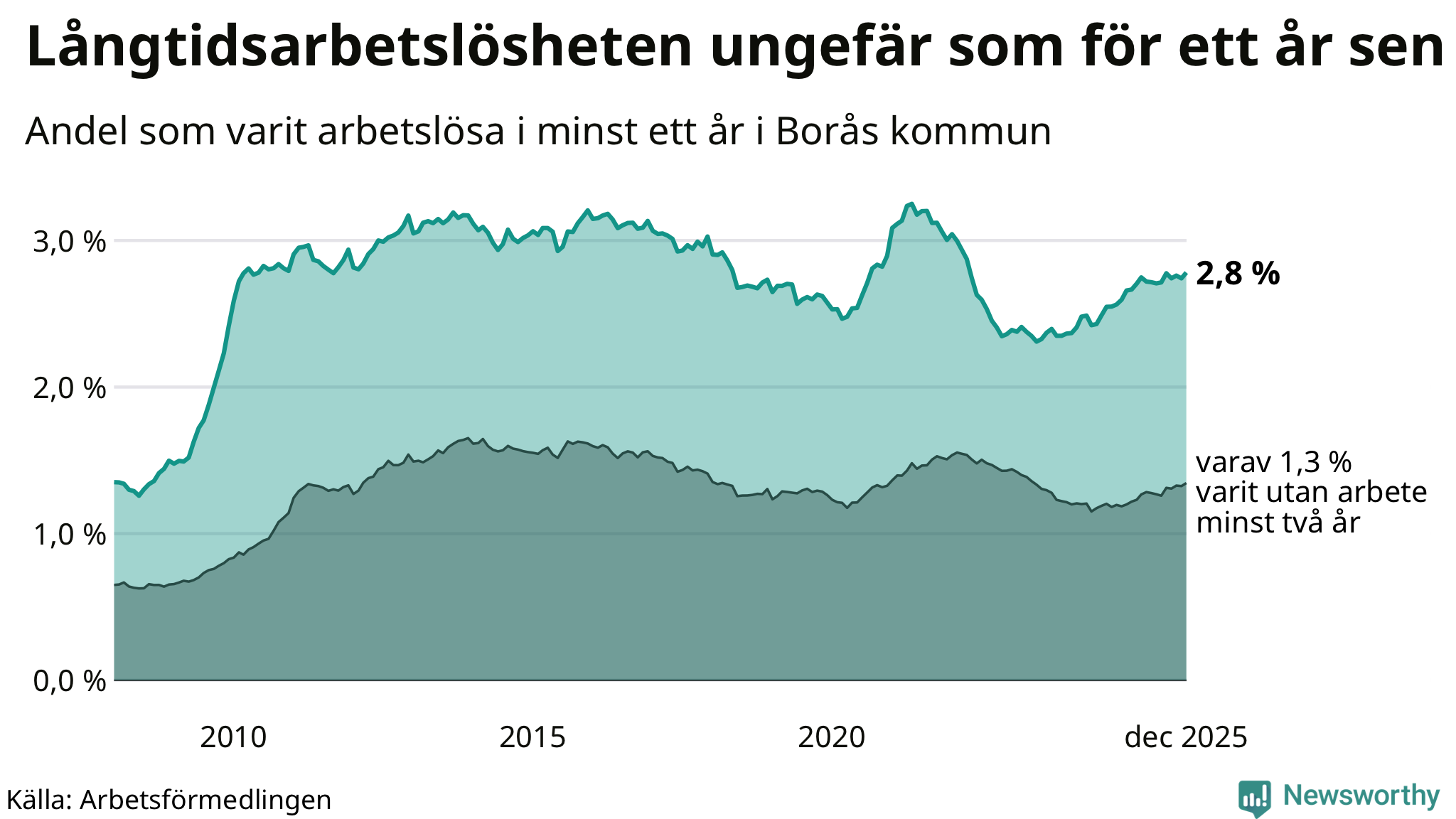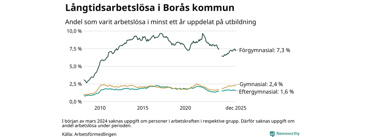I december hade 1 617 Boråsbor varit arbetslösa i minst ett år, vilket är 23 fler än månaden innan. 1 617 personer motsvarar 2,8 procent av arbetskraften i kommunen – andelen långtidsarbetslösa är ungefär på samma nivå som för ett år sedan.
