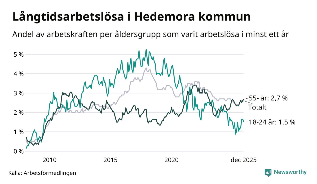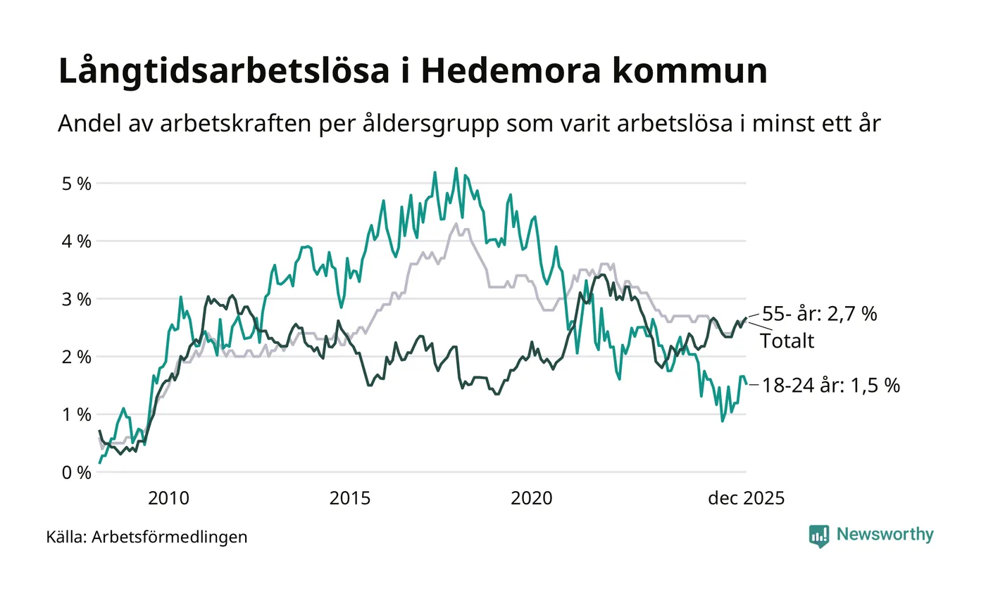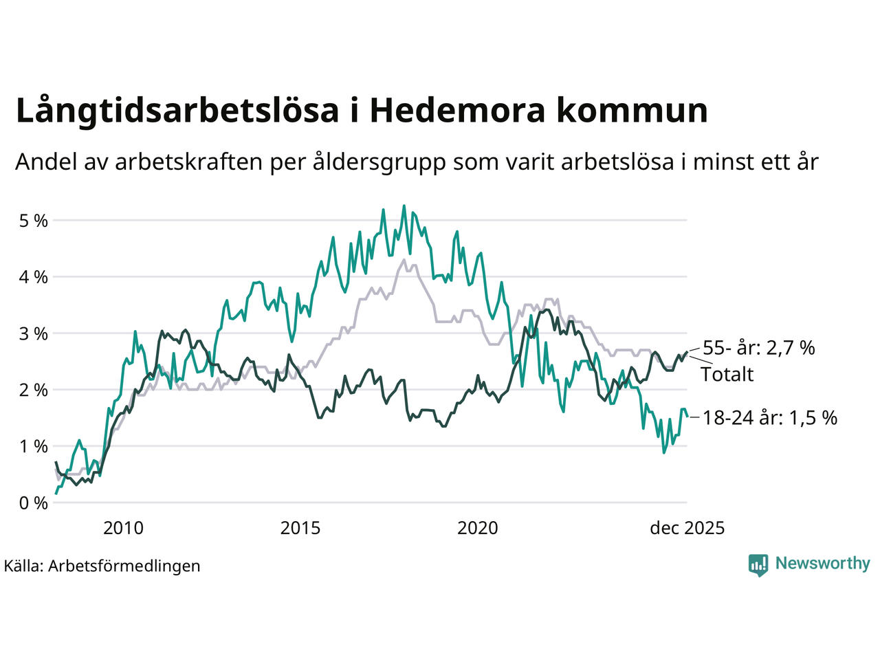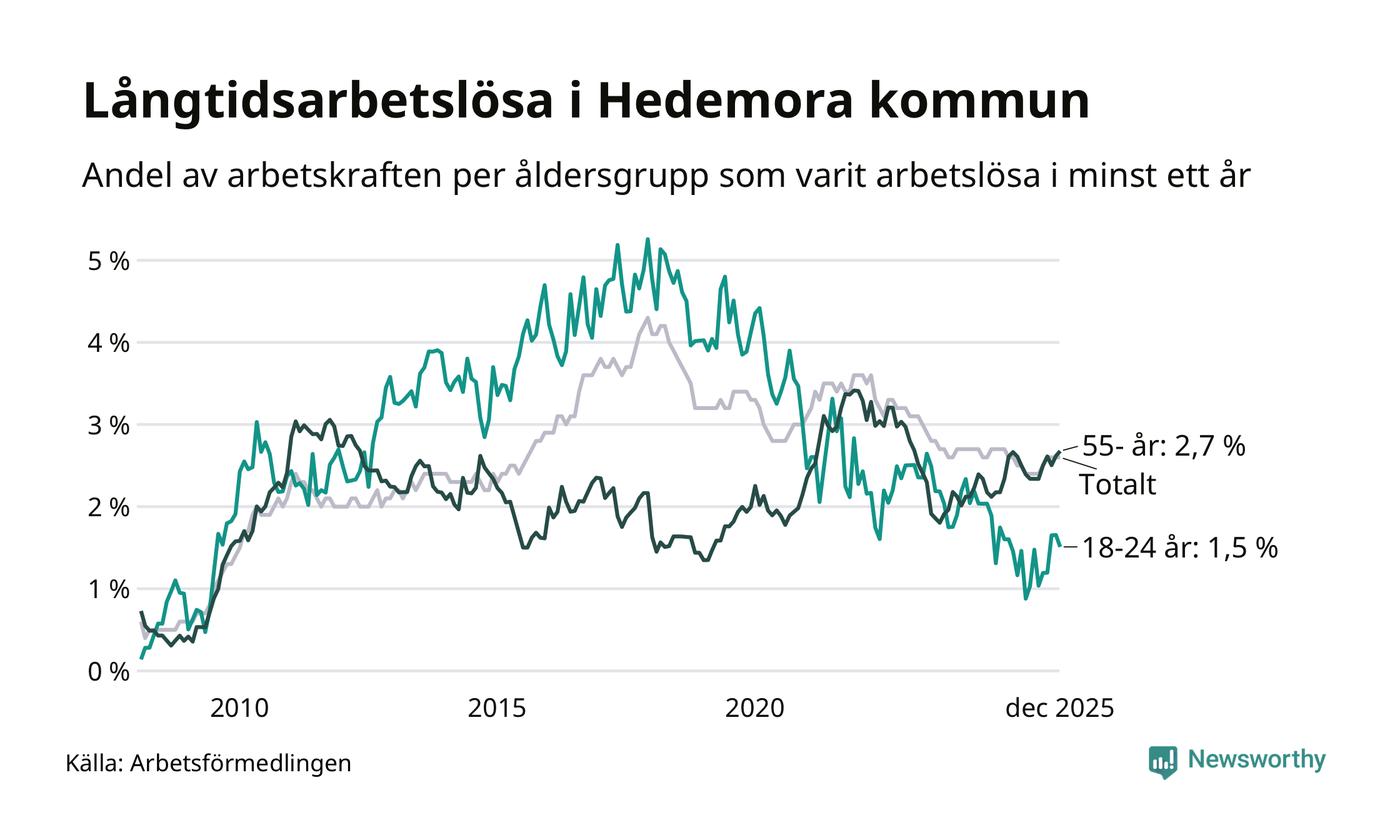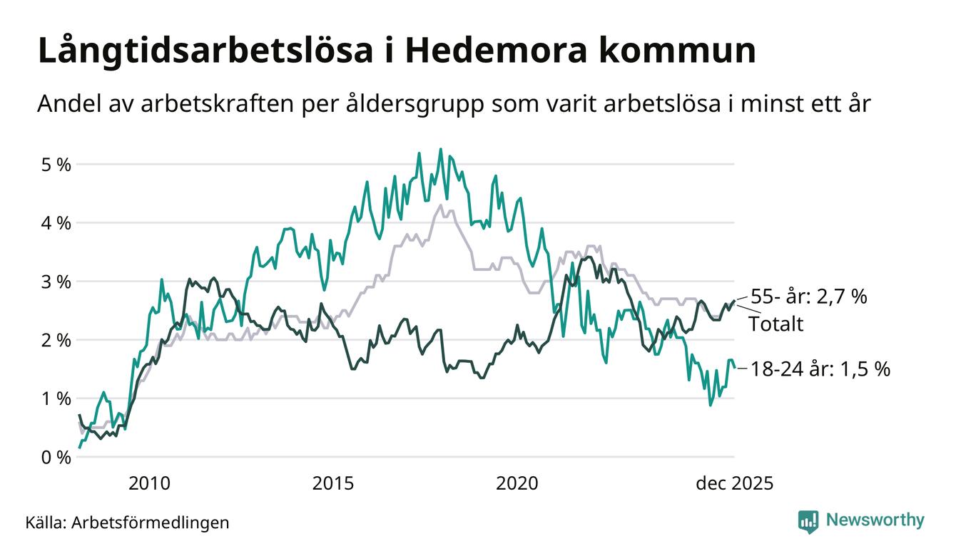 Av de 182 personerna som varit arbetslösa i mer än ett år i Hedemora kommun är 49 personer mellan 55 och 651 år och tio är mellan 18 och 24 år. För den äldre gruppen är andelen arbetslösa 2,7 procent medan den i den yngre gruppen är 1,5 procent. Även i riket som helhet är långtidsarbetslösheten högre i gruppen äldre.