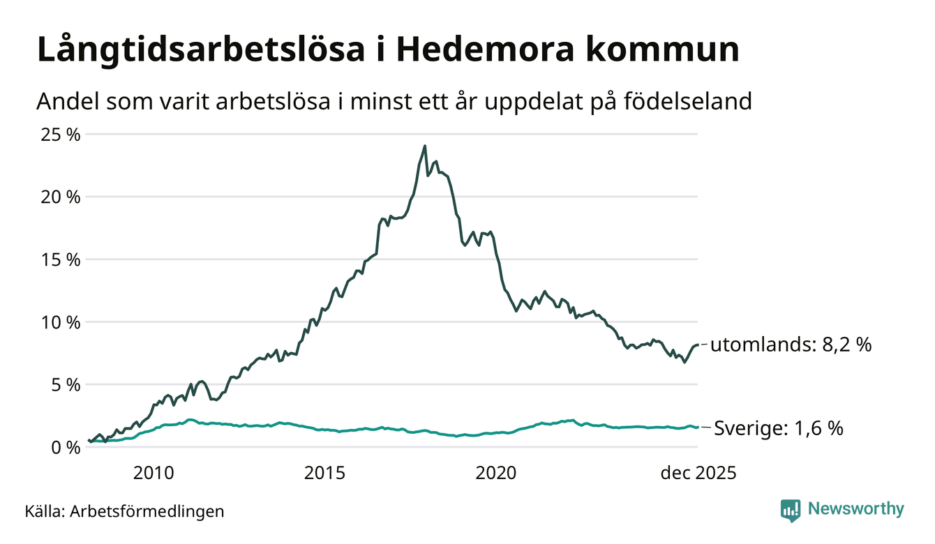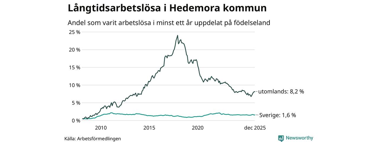 93 av de långtidsarbetslösa i Hedemora är födda i Sverige, medan 89 är födda utomlands. Det innebär att långtidsarbetslösheten bland Sverigefödda är 1,6 procent, medan den är fem gånger så hög – 8,2 procent – bland födda utomlands. Även i riket som helhet är arbetslösheten högre bland utrikesfödda.