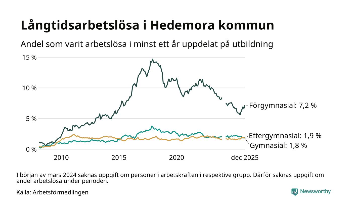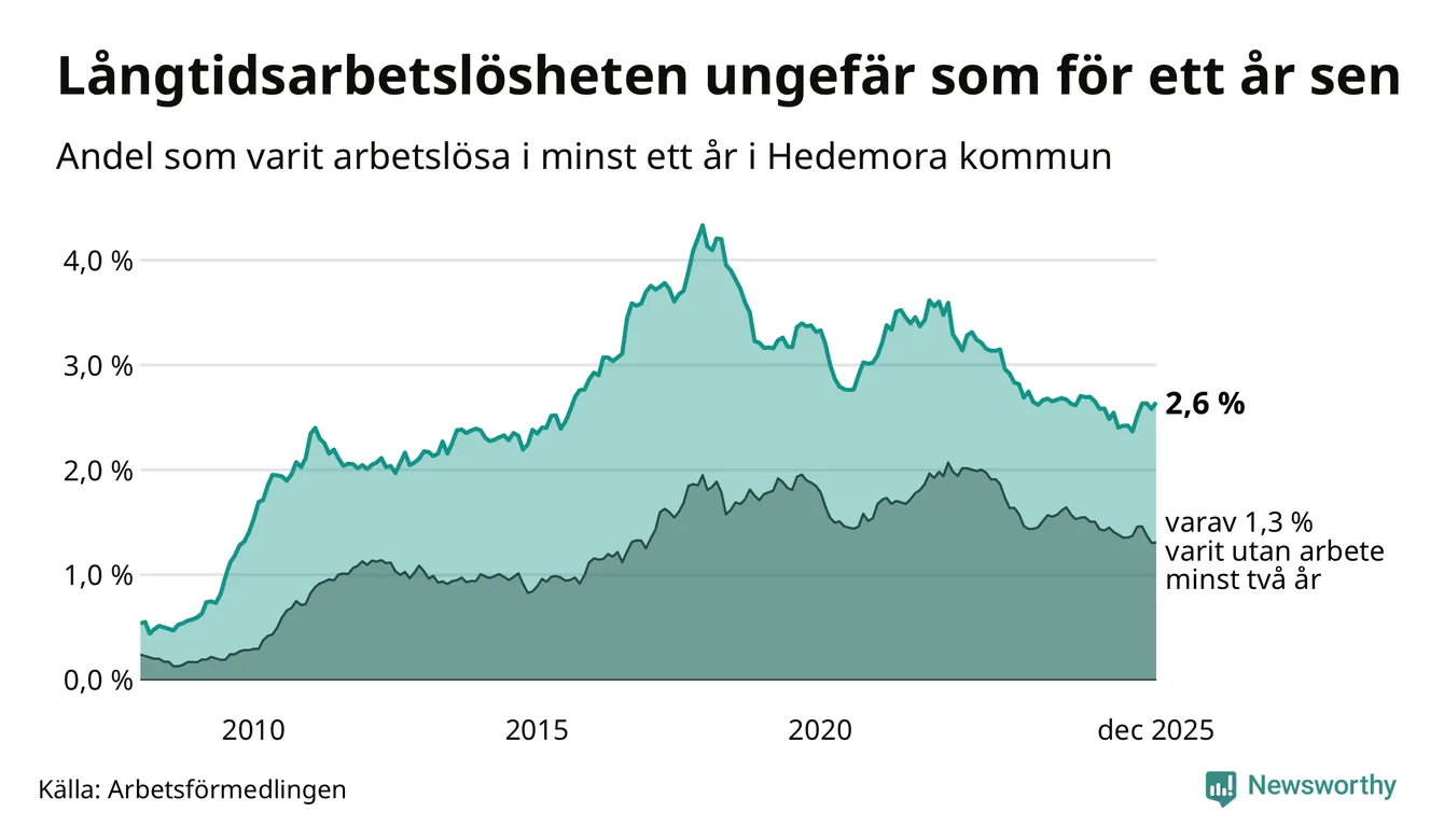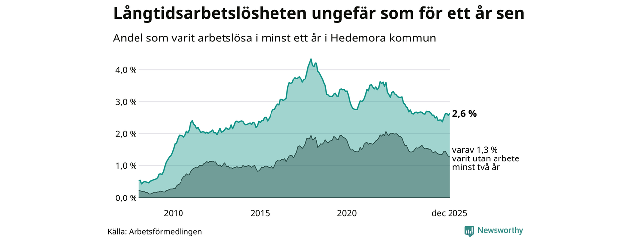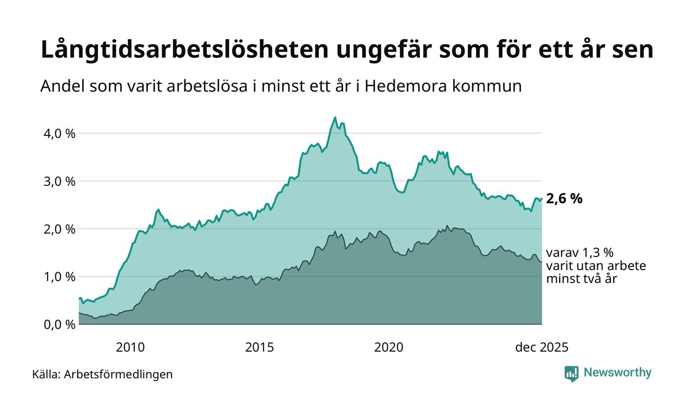 I december hade 182 Hedemorabor varit arbetslösa i minst ett år, vilket är fyra fler än månaden innan. 182 personer motsvarar 2,6 procent av arbetskraften i kommunen – andelen långtidsarbetslösa är ungefär på samma nivå som för ett år sedan.