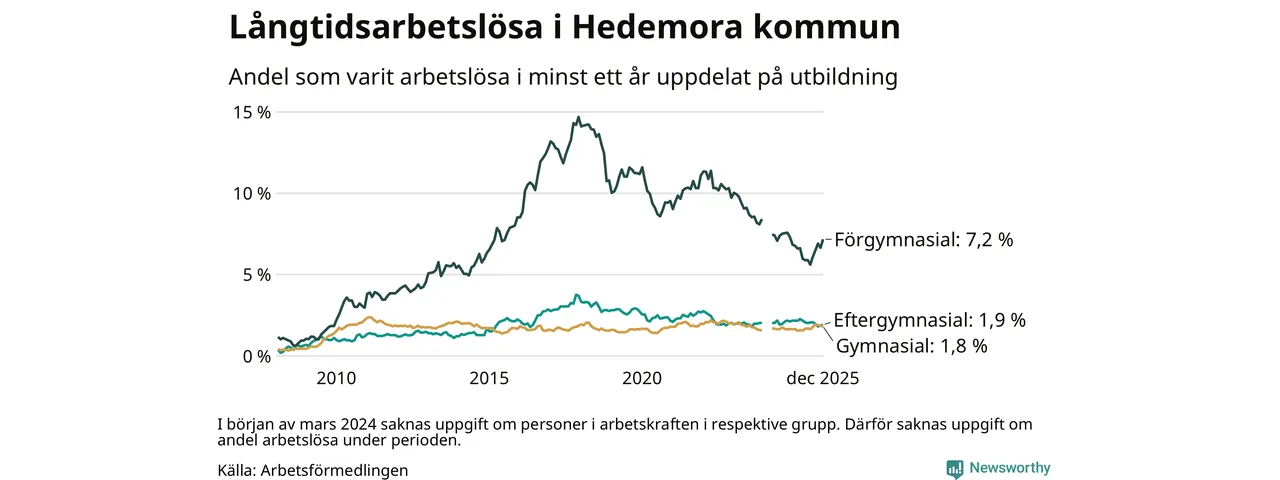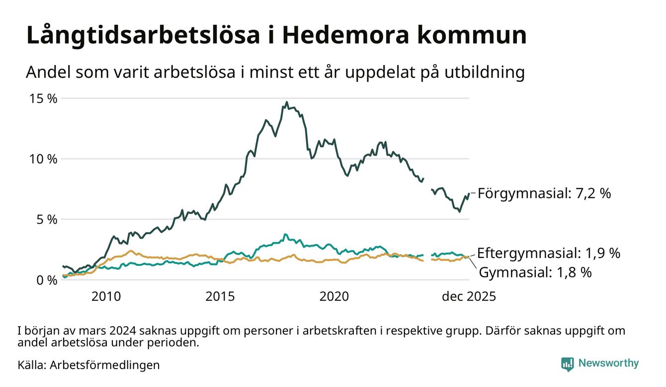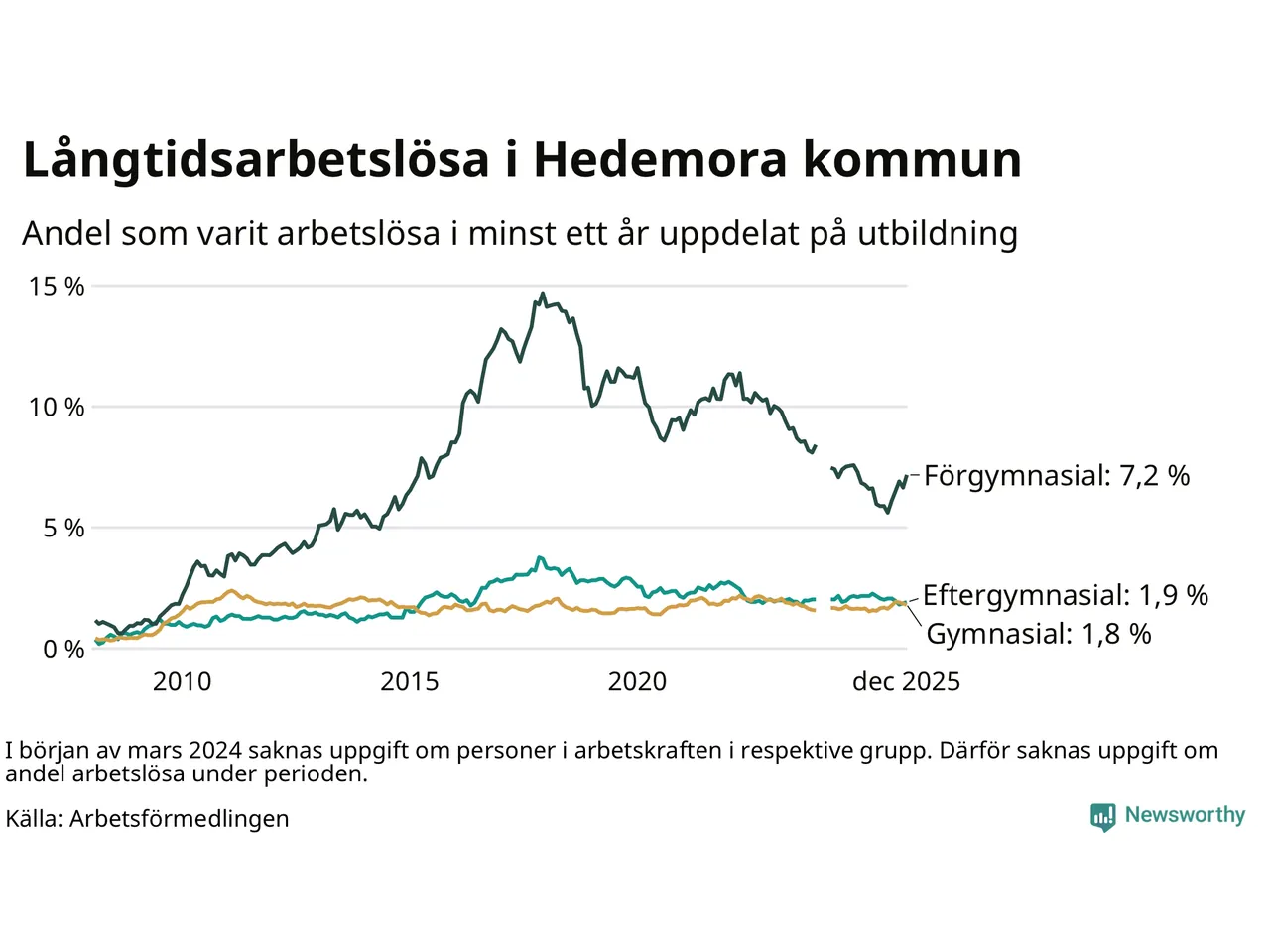 I december hade 182 Hedemorabor varit arbetslösa i minst ett år, vilket är fyra fler än månaden innan. 182 personer motsvarar 2,6 procent av arbetskraften i kommunen – andelen långtidsarbetslösa är ungefär på samma nivå som för ett år sedan.