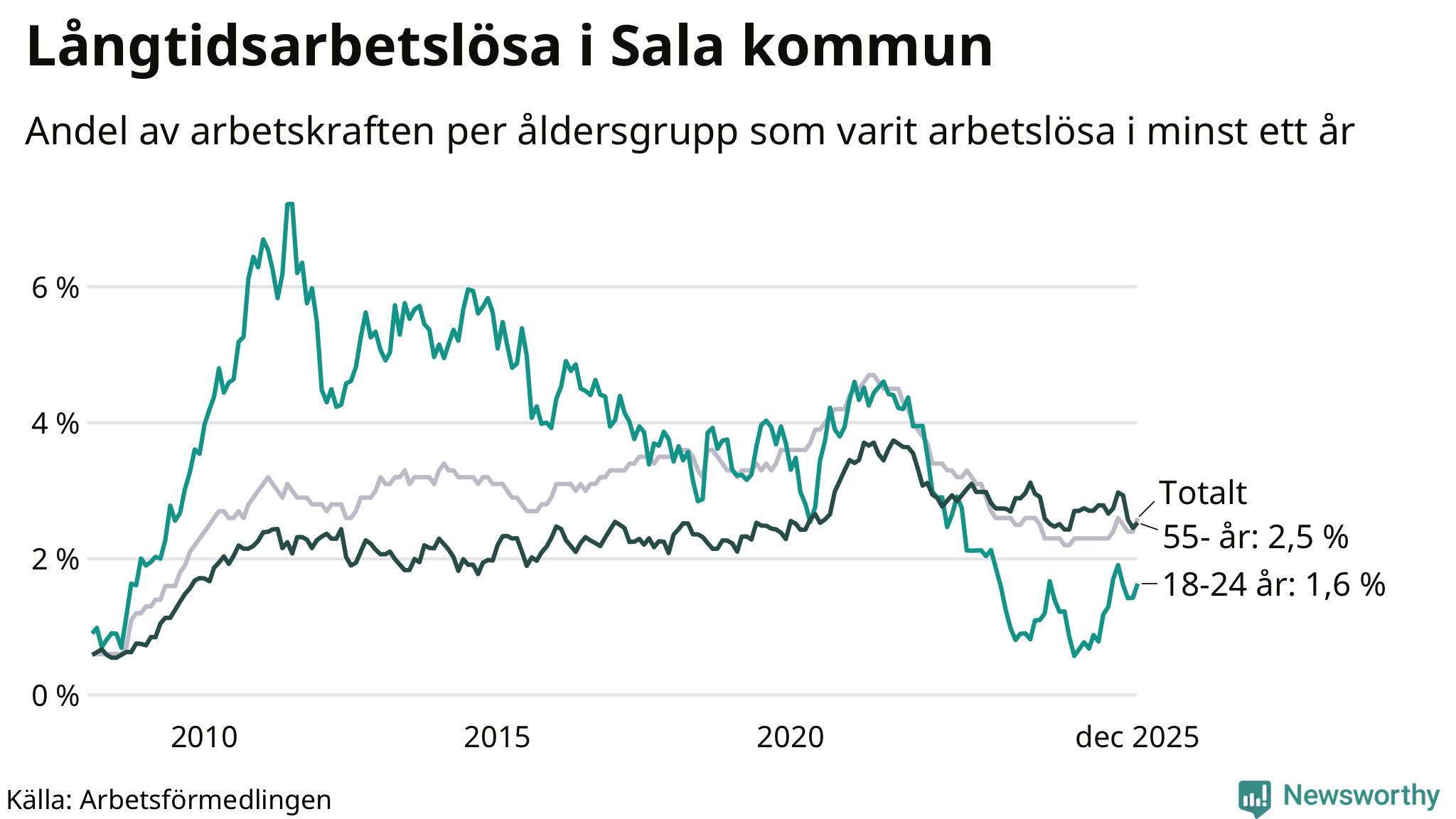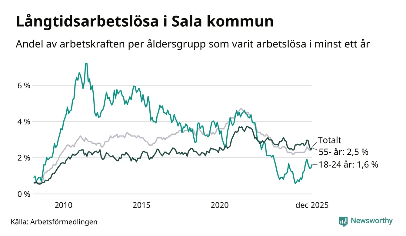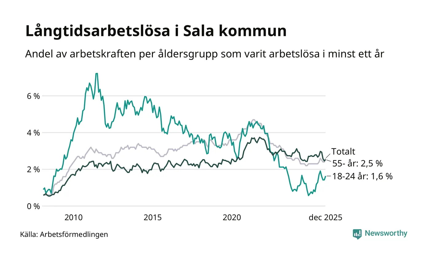 Andelen långtidsarbetslösa i Sala är den näst lägsta i Västmanlands län, bara i Surahammar är andelen lägre (2,4 procent). I Fagersta finns länets högsta långtidsarbetslöshet, 4,2 procent. I Västmanland som helhet hade 4 962 personer (3,6 procent) varit arbetslösa i minst ett år i december. Det är 13 personer fler än månaden innan.