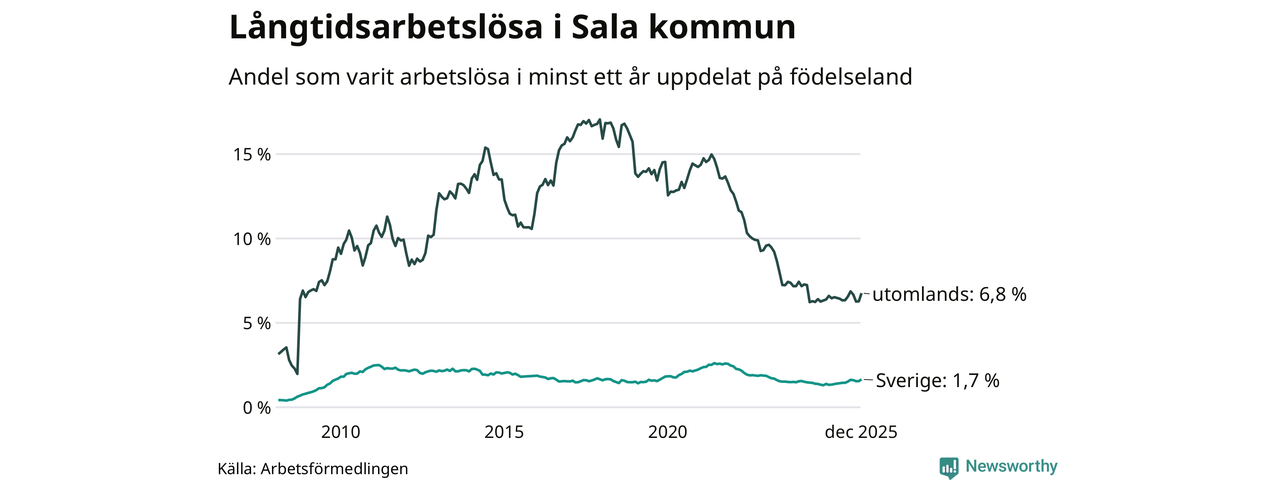 142 av de långtidsarbetslösa i Sala är födda i Sverige, medan 130 är födda utomlands. Det innebär att långtidsarbetslösheten bland Sverigefödda är 1,7 procent, medan den är fyra gånger så hög – 6,8 procent – bland födda utomlands. Även i riket som helhet är arbetslösheten högre bland utrikesfödda.