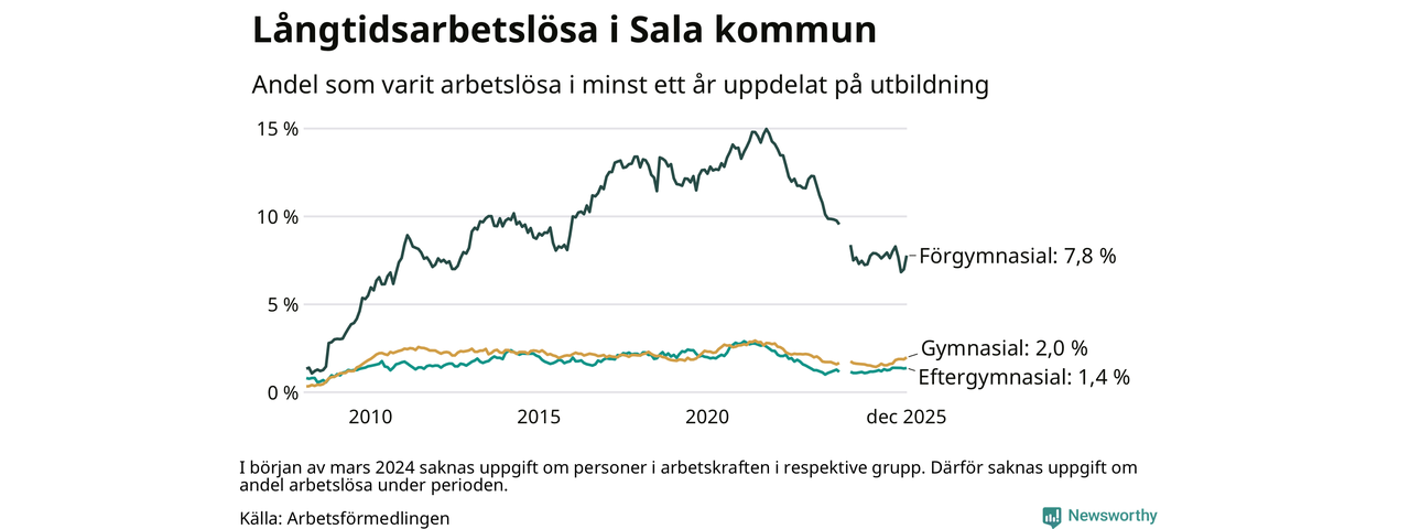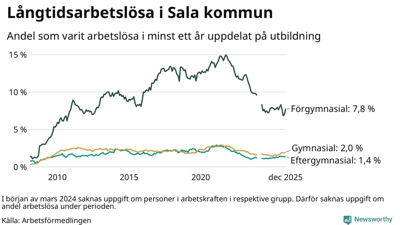 Andelen som varit utan arbete i minst ett år i Sala var högre i december jämfört med samma månad för ett år sedan. Det visar Arbetsfömedlingens senaste månadsstatistik.