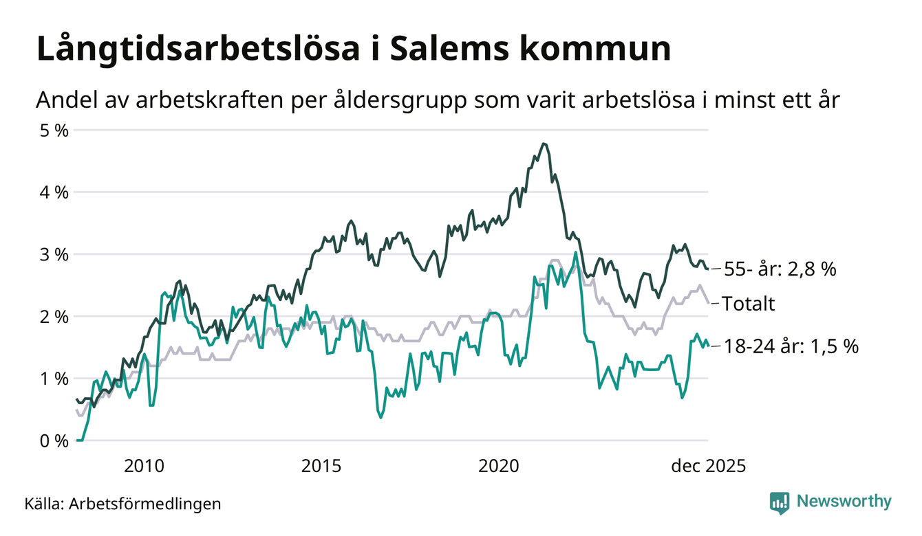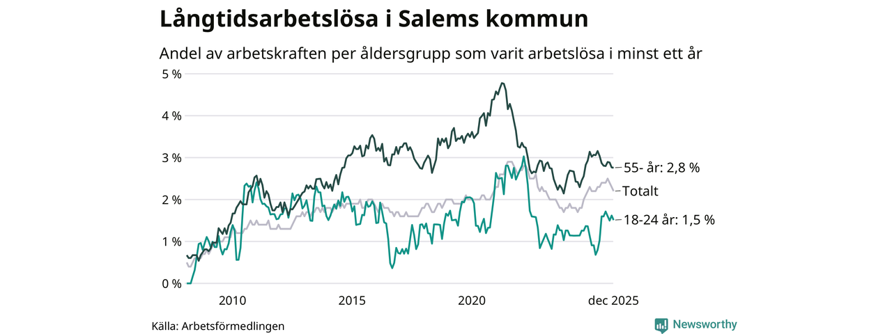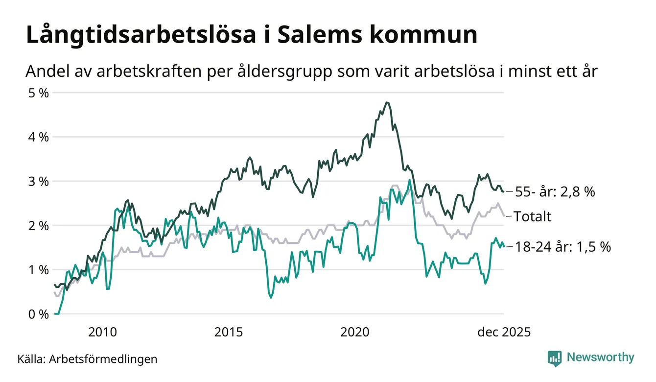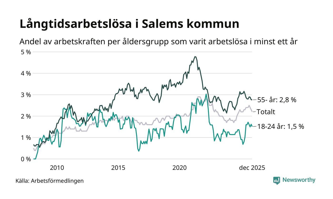 Av de 192 personerna som varit arbetslösa i mer än ett år i Salems kommun är 52 personer mellan 55 och 651 år och 13 är mellan 18 och 24 år. För den äldre gruppen är andelen arbetslösa 2,8 procent medan den i den yngre gruppen är 1,5 procent. Även i riket som helhet är långtidsarbetslösheten högre i gruppen äldre.