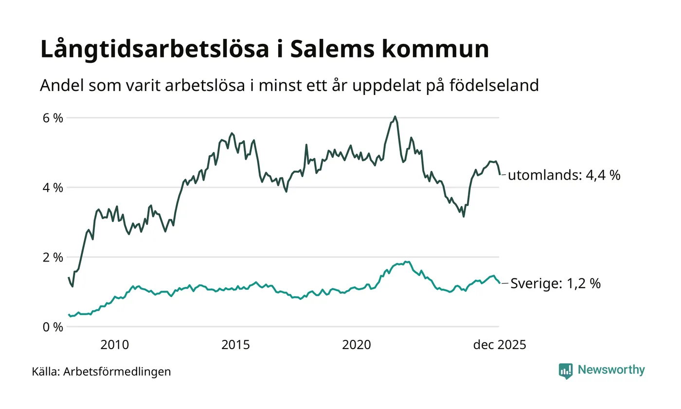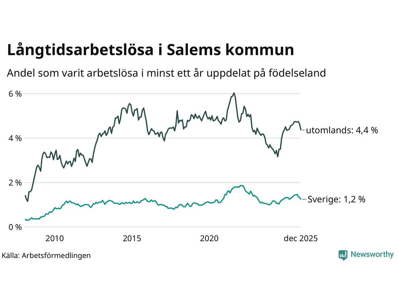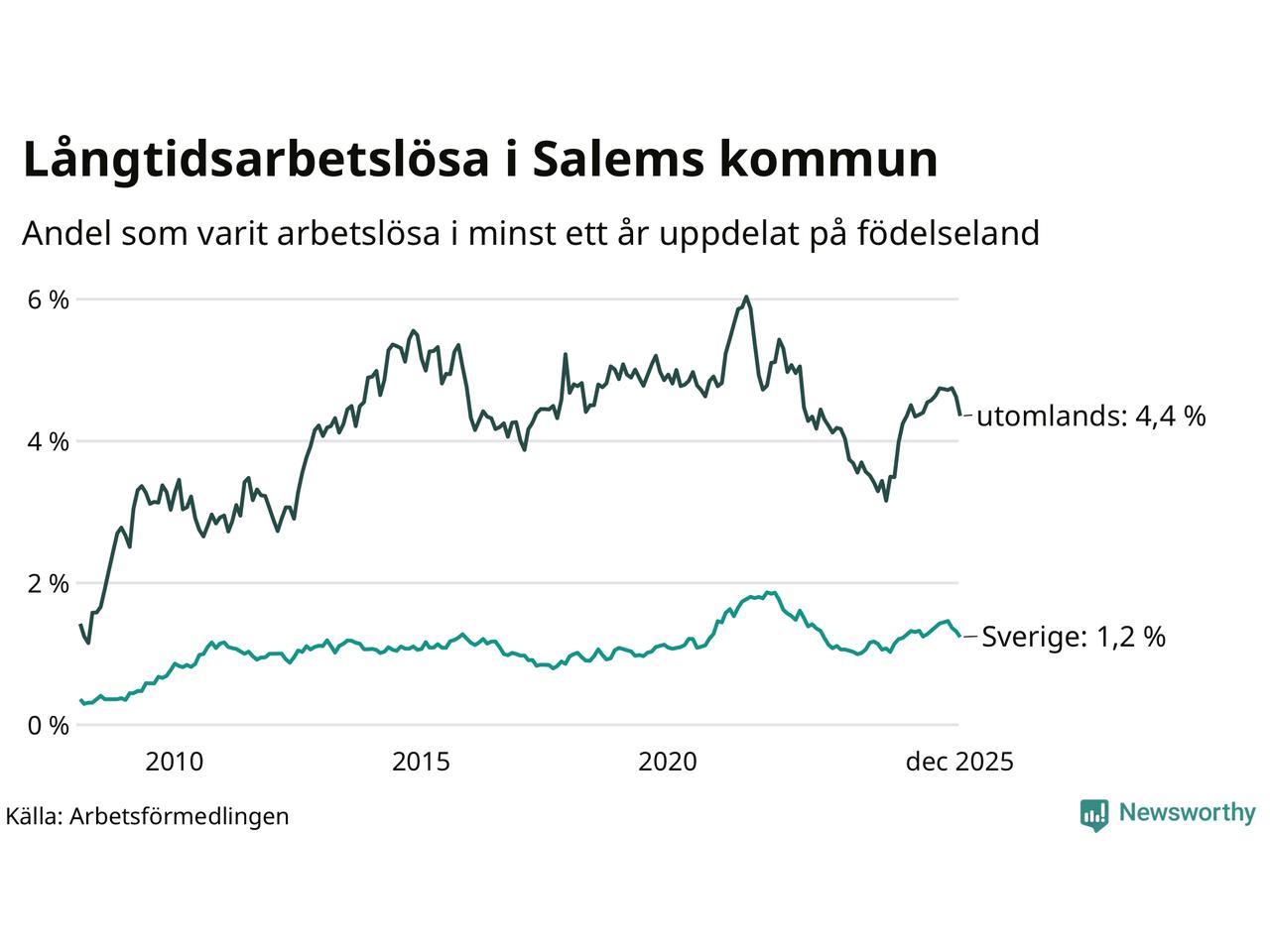 75 av de långtidsarbetslösa i Salem är födda i Sverige, medan 117 är födda utomlands. Det innebär att långtidsarbetslösheten bland Sverigefödda är 1,2 procent, medan den är fyra gånger så hög – 4,4 procent – bland födda utomlands. Även i riket som helhet är arbetslösheten högre bland utrikesfödda.