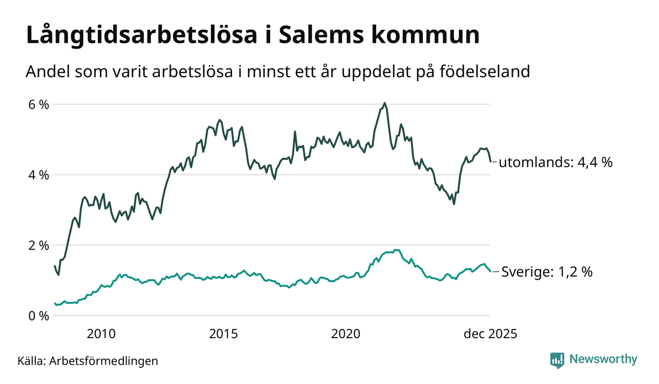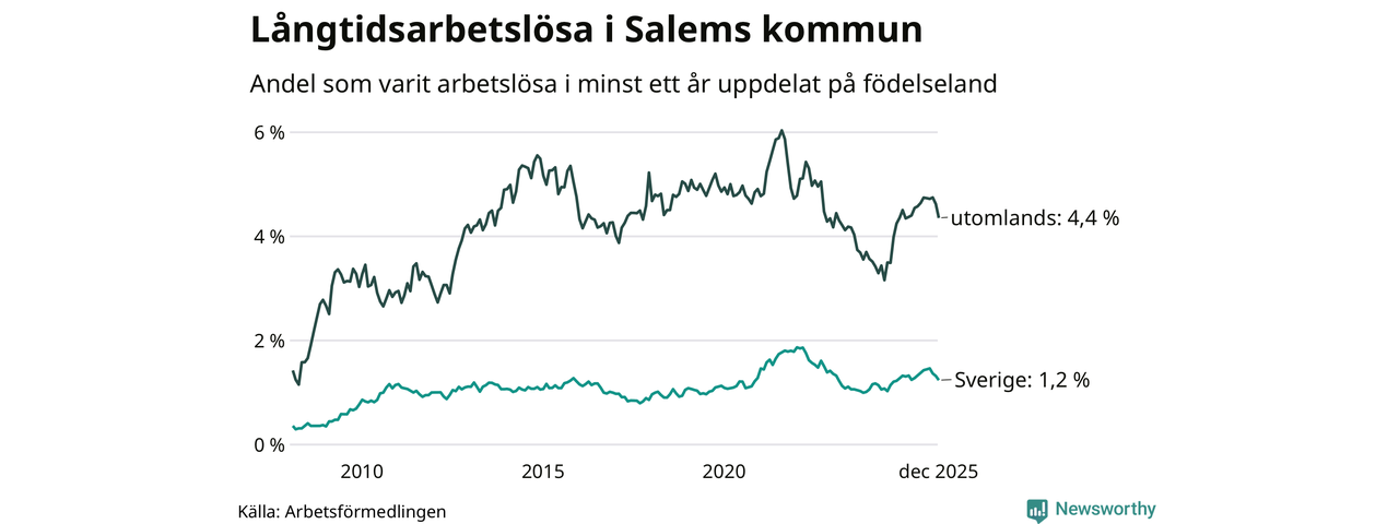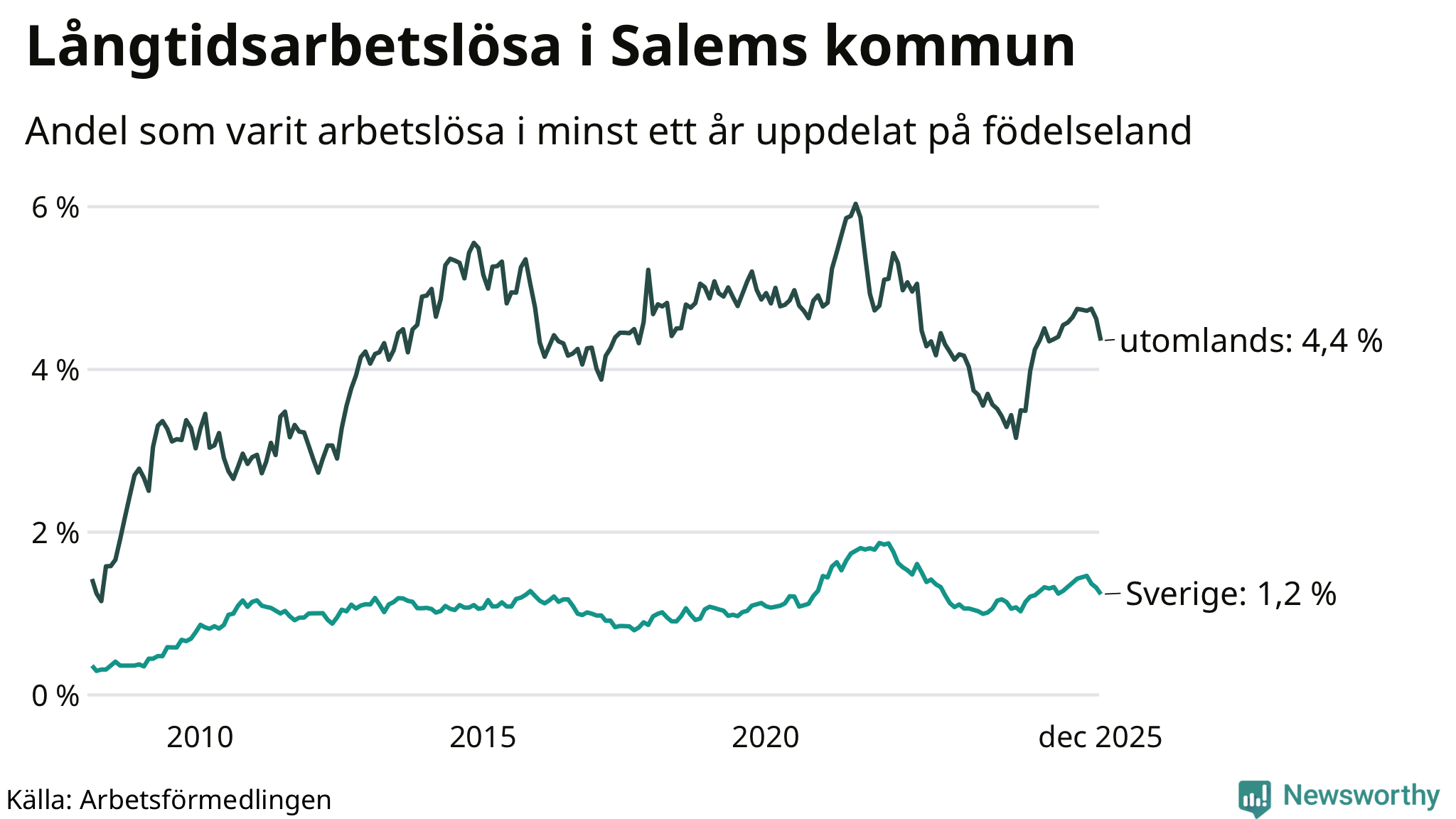 75 av de långtidsarbetslösa i Salem är födda i Sverige, medan 117 är födda utomlands. Det innebär att långtidsarbetslösheten bland Sverigefödda är 1,2 procent, medan den är fyra gånger så hög – 4,4 procent – bland födda utomlands. Även i riket som helhet är arbetslösheten högre bland utrikesfödda.