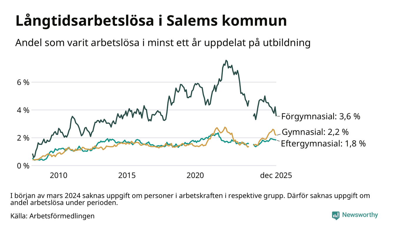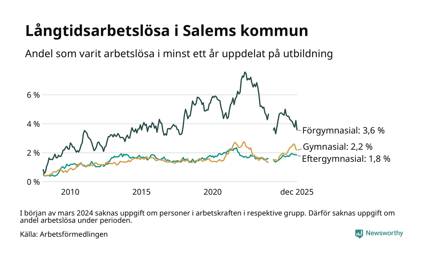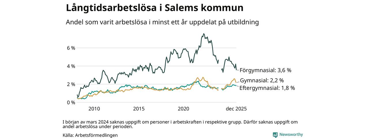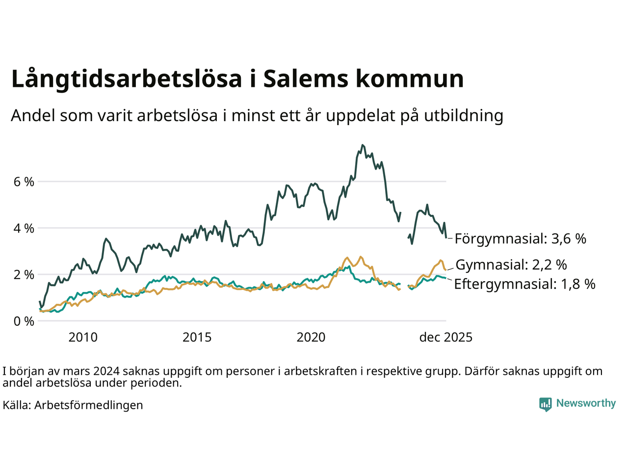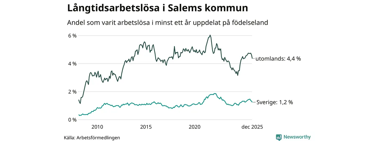 Andelen som varit utan arbete i minst ett år i Salem var ungefär lika stor i december jämfört med samma månad för ett år sedan. Det visar Arbetsfömedlingens senaste månadsstatistik.