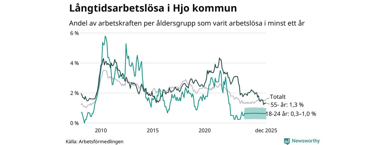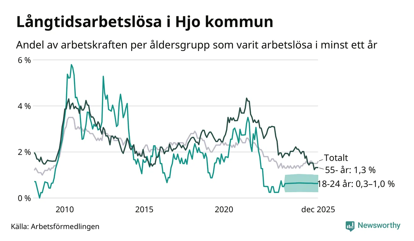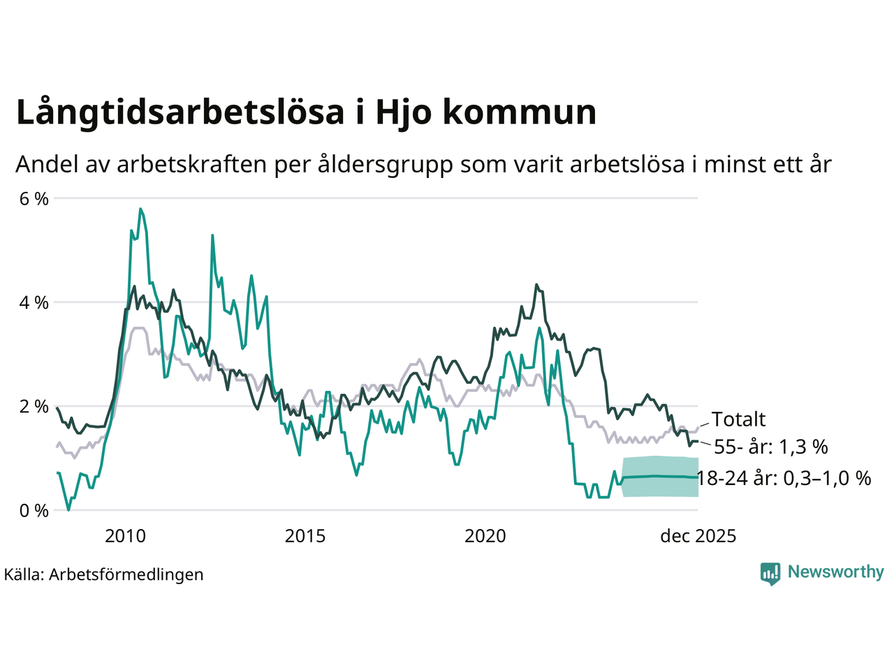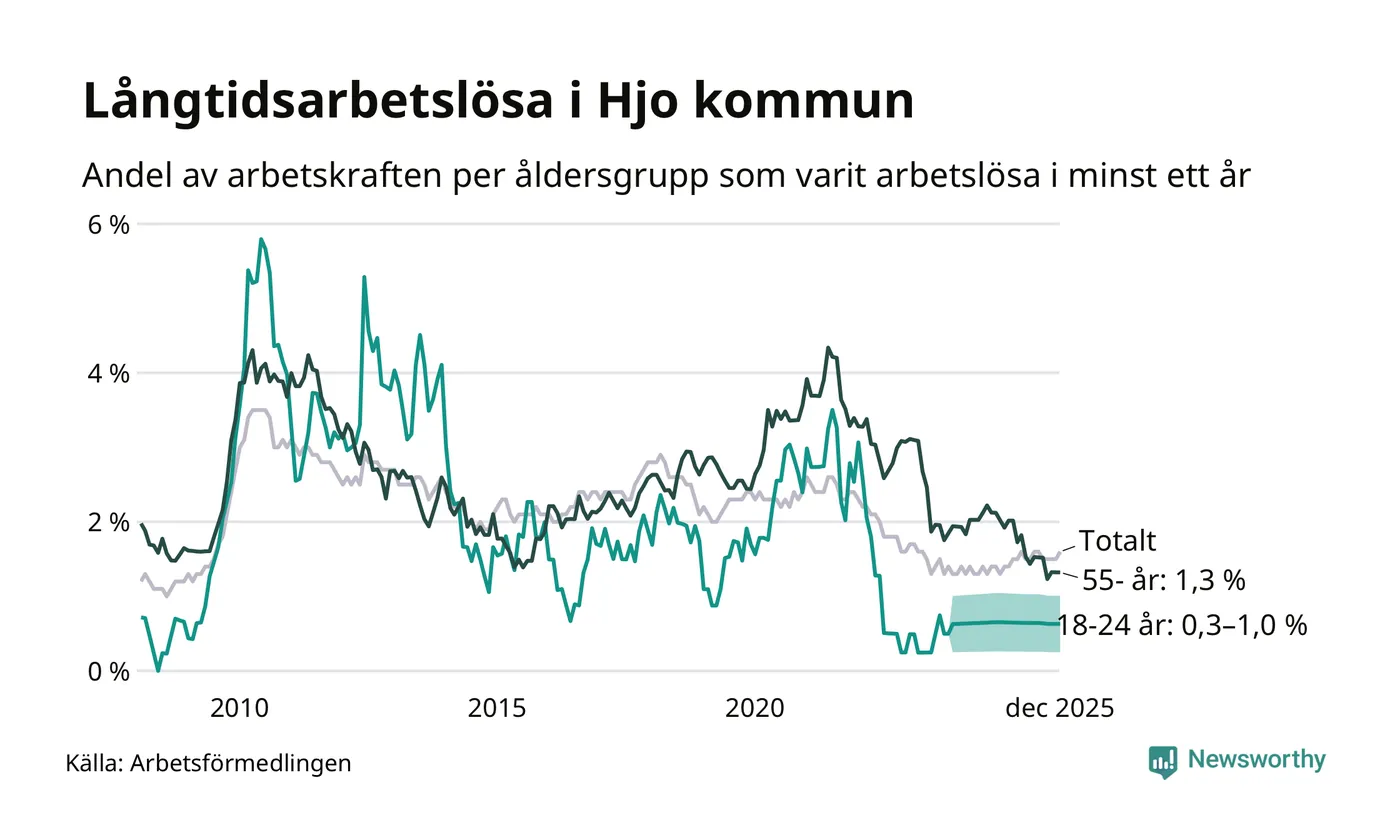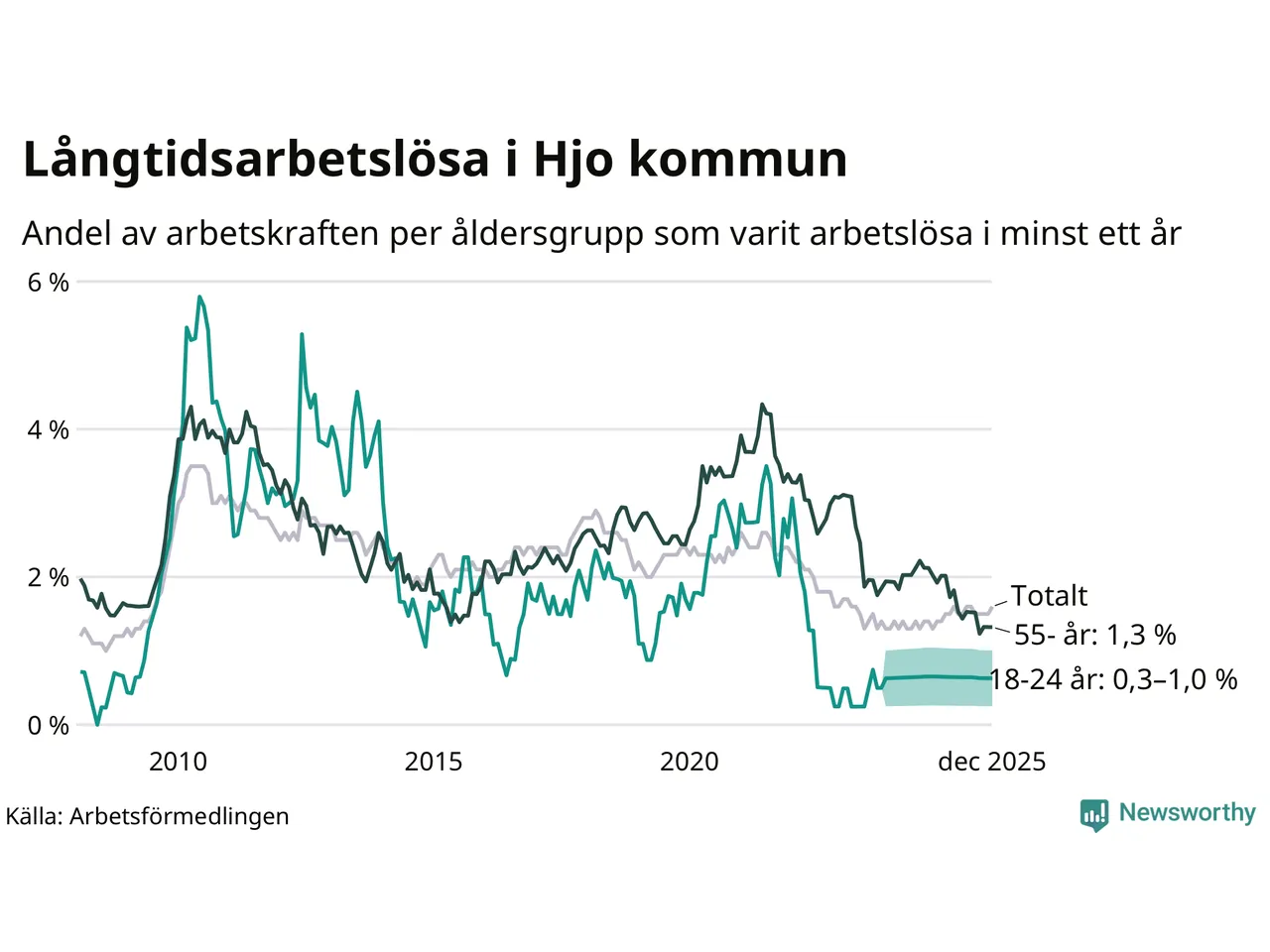 Av de 70 personerna som varit arbetslösa i mer än ett år i Hjo kommun är 14 personer mellan 55 och 651 år och mellan en och fyra är mellan 18 och 24 år. Som andel av arbetskraften innebär det att långtidsarbetslöheten är lägre i de båda grupperna än i arbetskraften totalt. I riket som helhet är andelen långtidsarbetslösa högre i den äldre gruppen.
