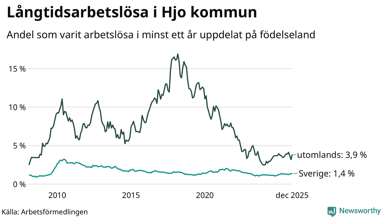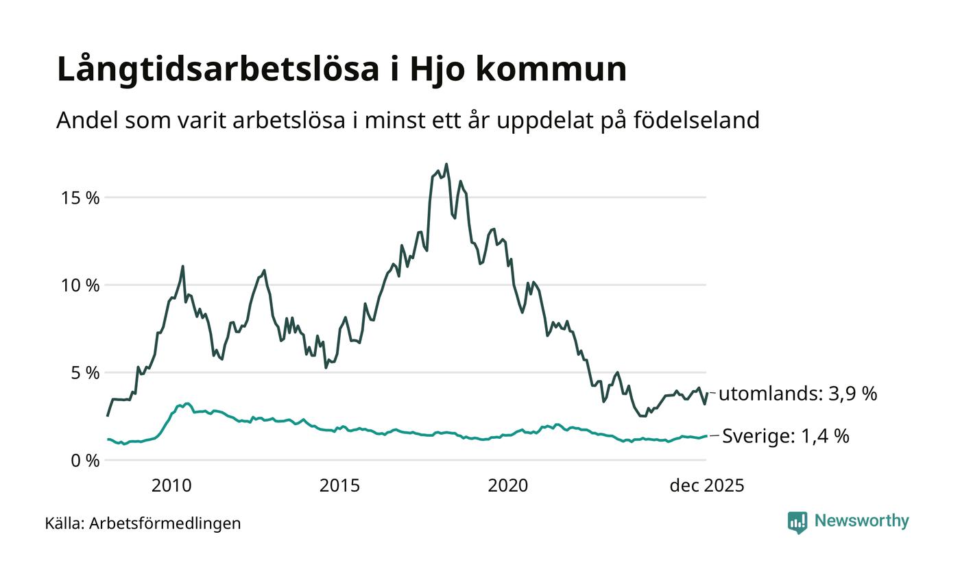 53 av de långtidsarbetslösa i Hjo är födda i Sverige, medan 17 är födda utomlands. Det innebär att långtidsarbetslösheten bland Sverigefödda är 1,4 procent, medan den är tre gånger så hög – 3,9 procent – bland födda utomlands. Även i riket som helhet är arbetslösheten högre bland utrikesfödda.