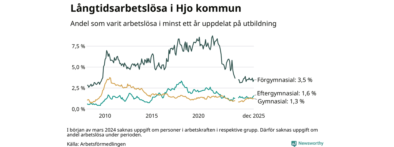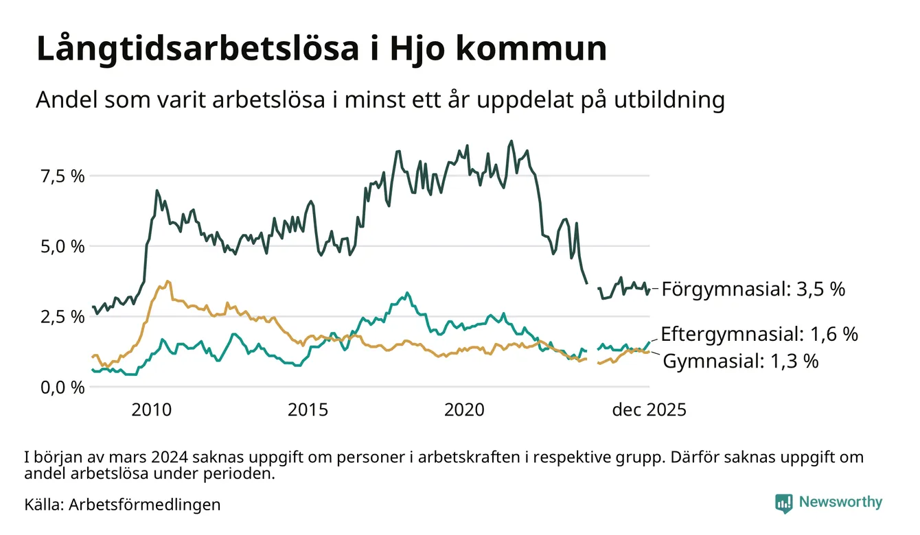 | Andel arbetslösa i minst ett år | 1,6 % | 2,5 % | 2,9 % |