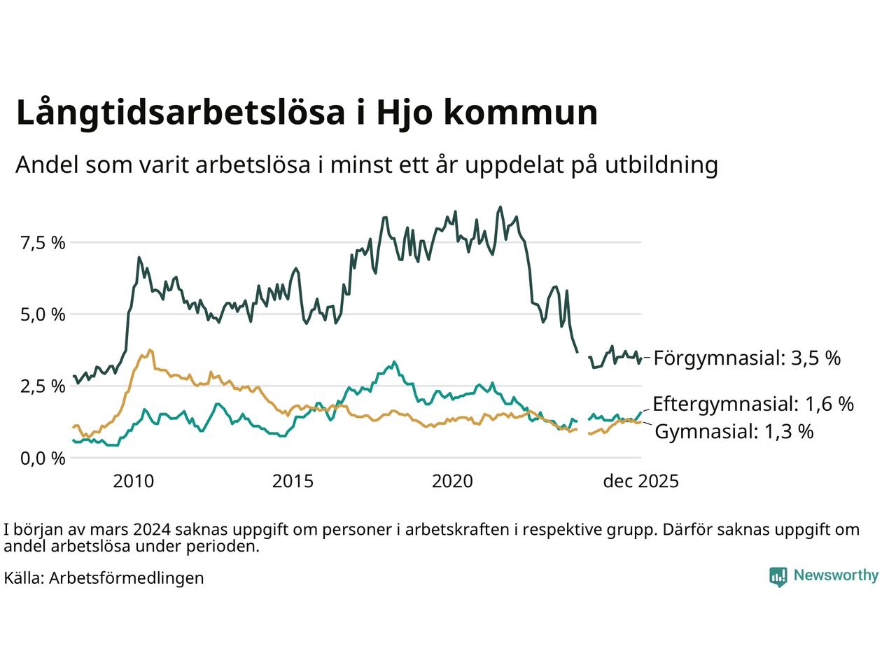 I december hade 70 Hjobor varit arbetslösa i minst ett år, vilket är fyra fler än månaden innan. 70 personer motsvarar 1,6 procent av arbetskraften i kommunen – andelen långtidsarbetslösa är ungefär på samma nivå som för ett år sedan.
