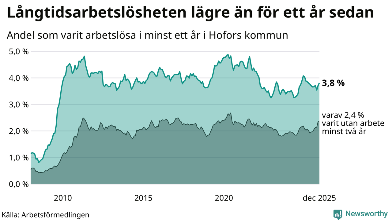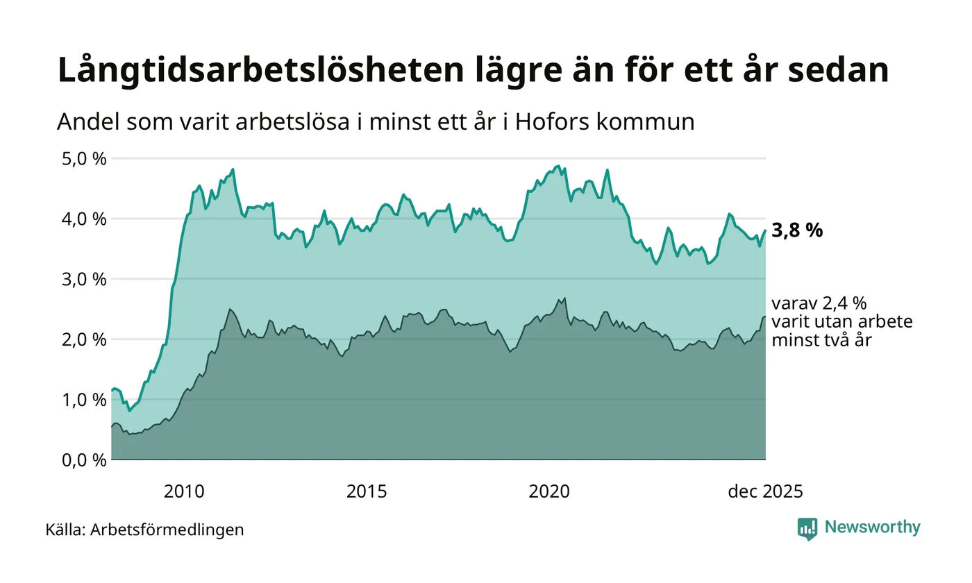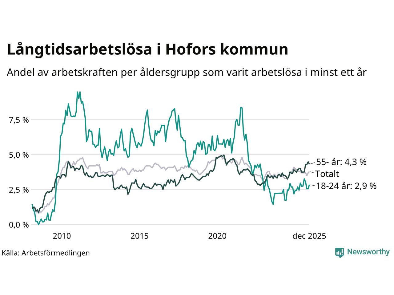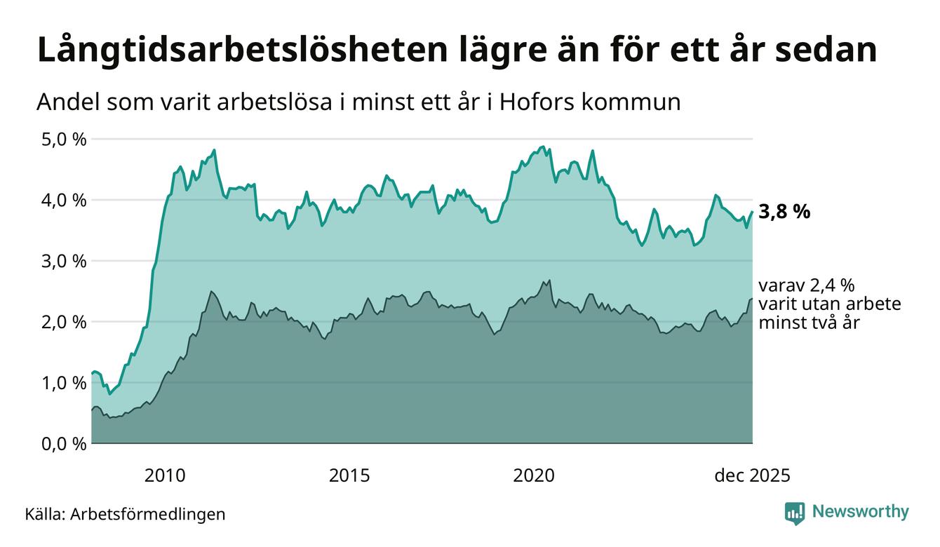 I december hade 165 Hoforsbor varit arbetslösa i minst ett år, vilket är fyra fler än månaden innan. 165 personer motsvarar 3,8 procent av arbetskraften i kommunen – andelen långtidsarbetslösa är 0,3 procentenheter lägre än samma månad för ett år sedan.