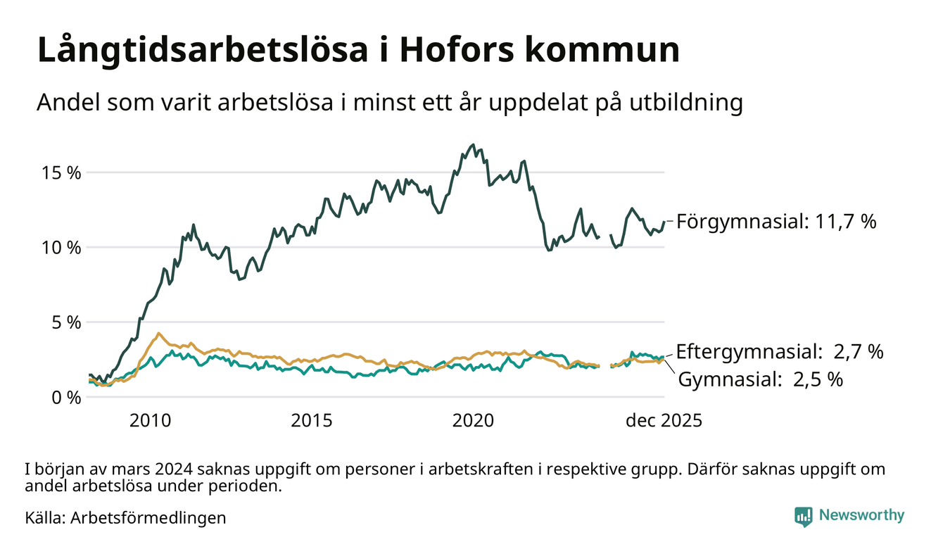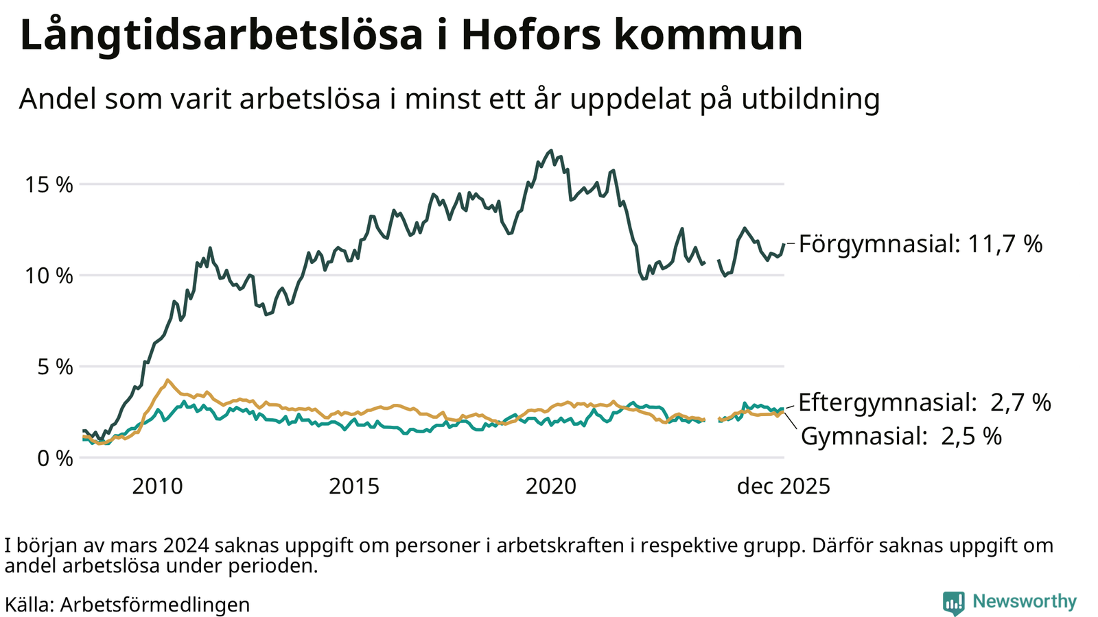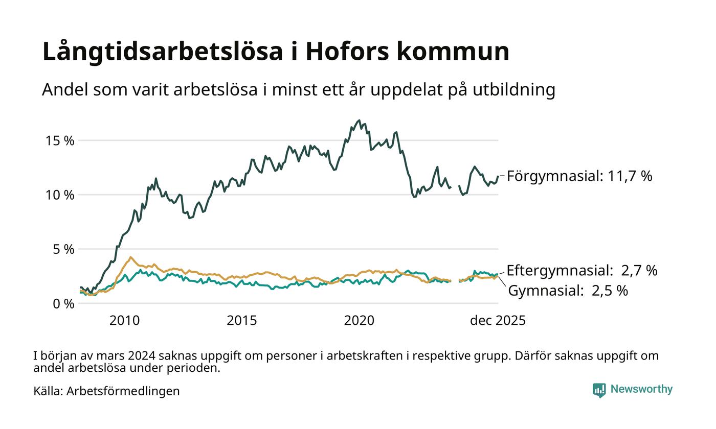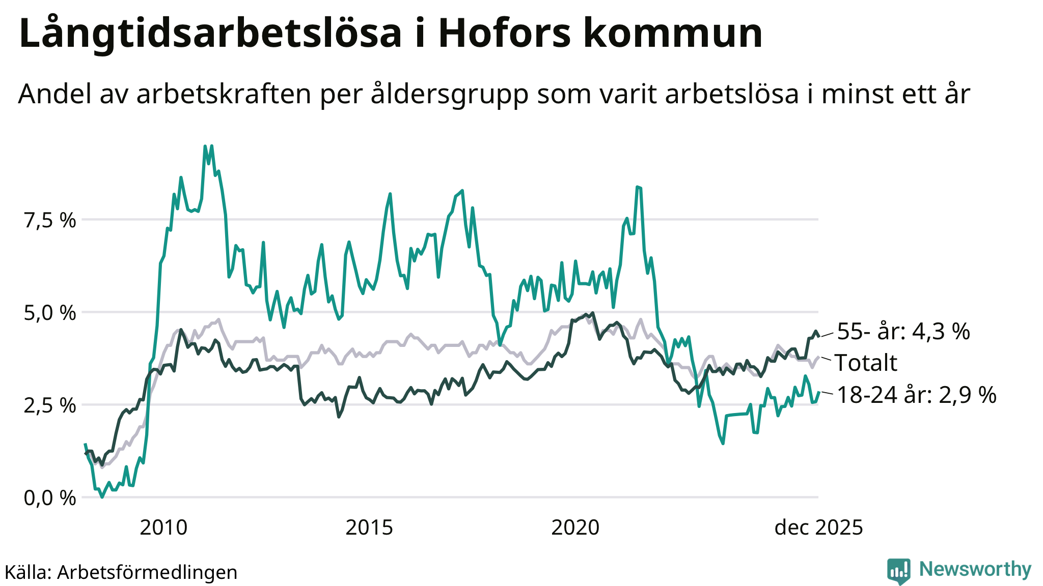 I december hade 165 Hoforsbor varit arbetslösa i minst ett år, vilket är fyra fler än månaden innan. 165 personer motsvarar 3,8 procent av arbetskraften i kommunen – andelen långtidsarbetslösa är 0,3 procentenheter lägre än samma månad för ett år sedan.