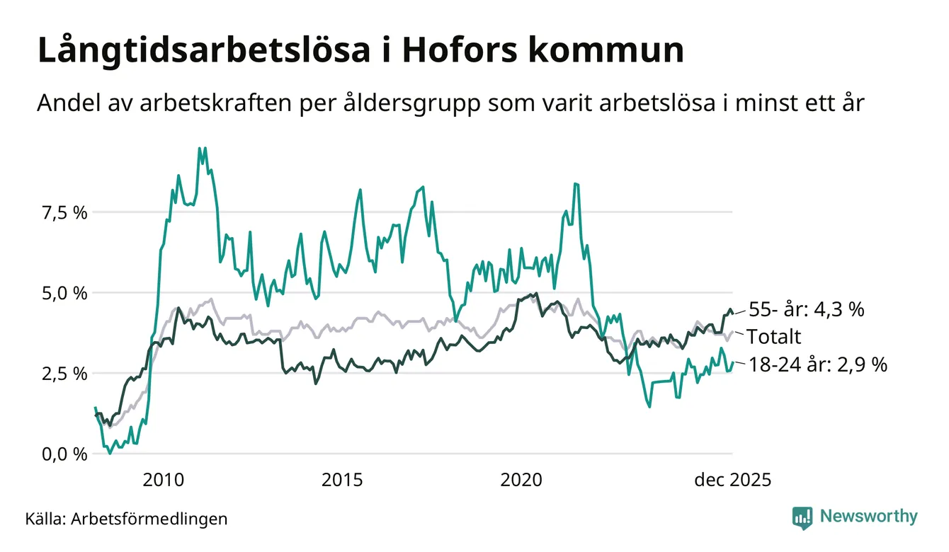 Av de 165 personerna som varit arbetslösa i mer än ett år i Hofors kommun är 50 personer mellan 55 och 651 år och elva är mellan 18 och 24 år. För den äldre gruppen är andelen arbetslösa 4,3 procent medan den i den yngre gruppen är 2,9 procent. Även i riket som helhet är långtidsarbetslösheten högre i gruppen äldre.