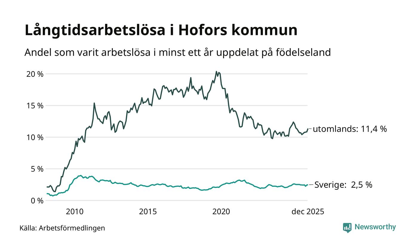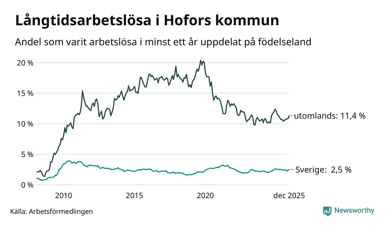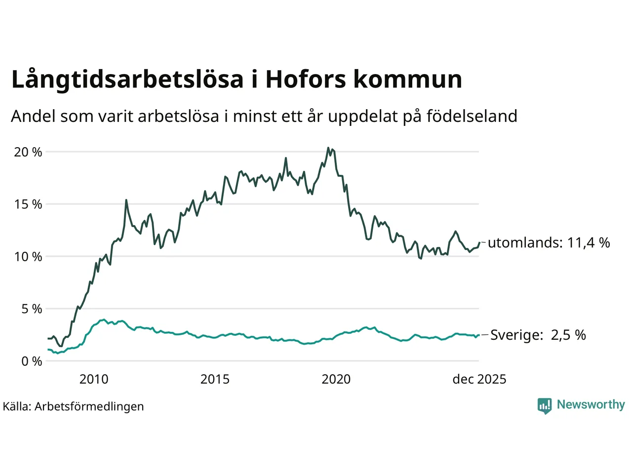 91 av de långtidsarbetslösa i Hofors är födda i Sverige, medan 74 är födda utomlands. Det innebär att långtidsarbetslösheten bland Sverigefödda är 2,5 procent, medan den är fem gånger så hög – 11,4 procent – bland födda utomlands. Även i riket som helhet är arbetslösheten högre bland utrikesfödda.