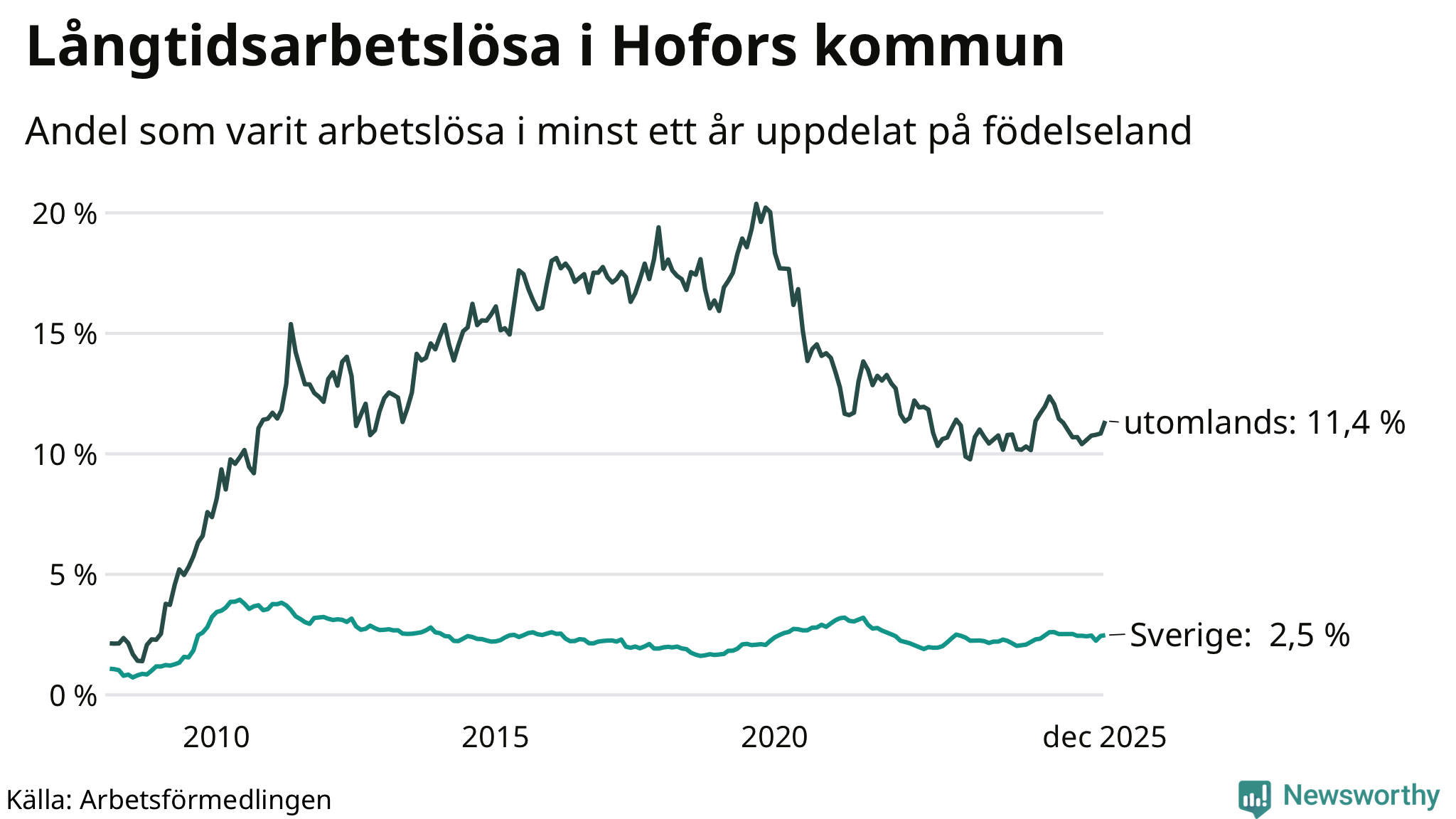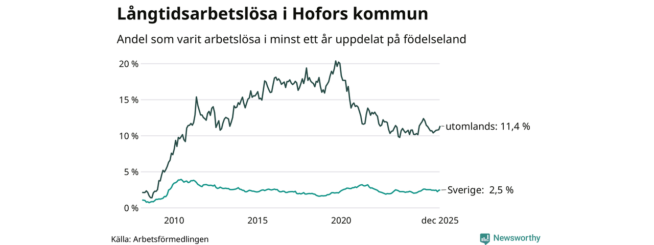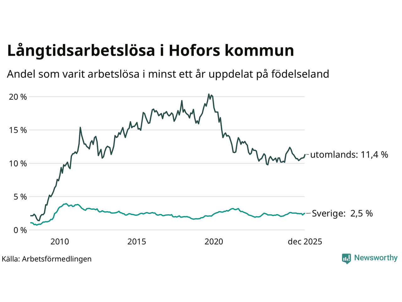 91 av de långtidsarbetslösa i Hofors är födda i Sverige, medan 74 är födda utomlands. Det innebär att långtidsarbetslösheten bland Sverigefödda är 2,5 procent, medan den är fem gånger så hög – 11,4 procent – bland födda utomlands. Även i riket som helhet är arbetslösheten högre bland utrikesfödda.