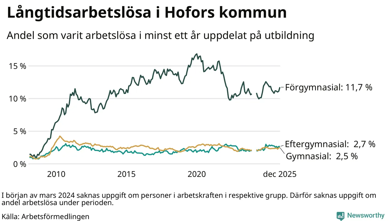 Andelen som varit utan arbete i minst ett år i Hofors i december var lägre än för ett år sedan. Men jämfört med i november har antalet långtidsarbetslösa ökat.