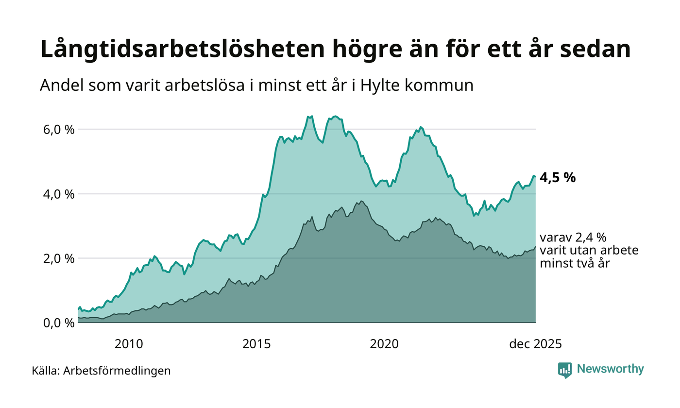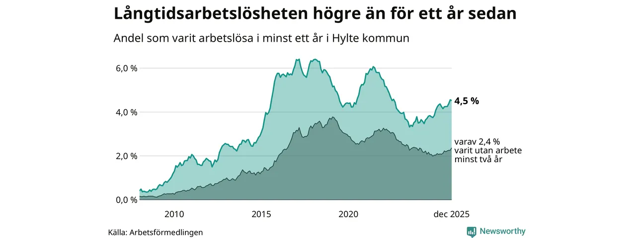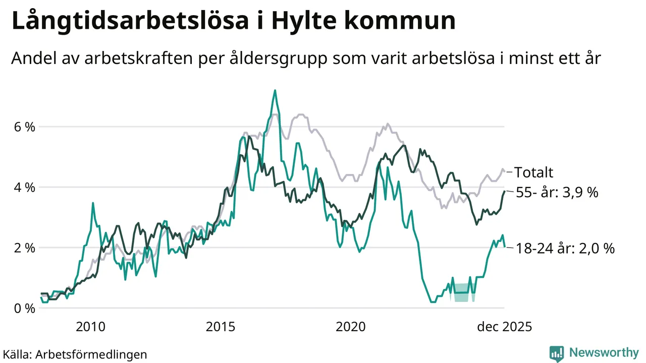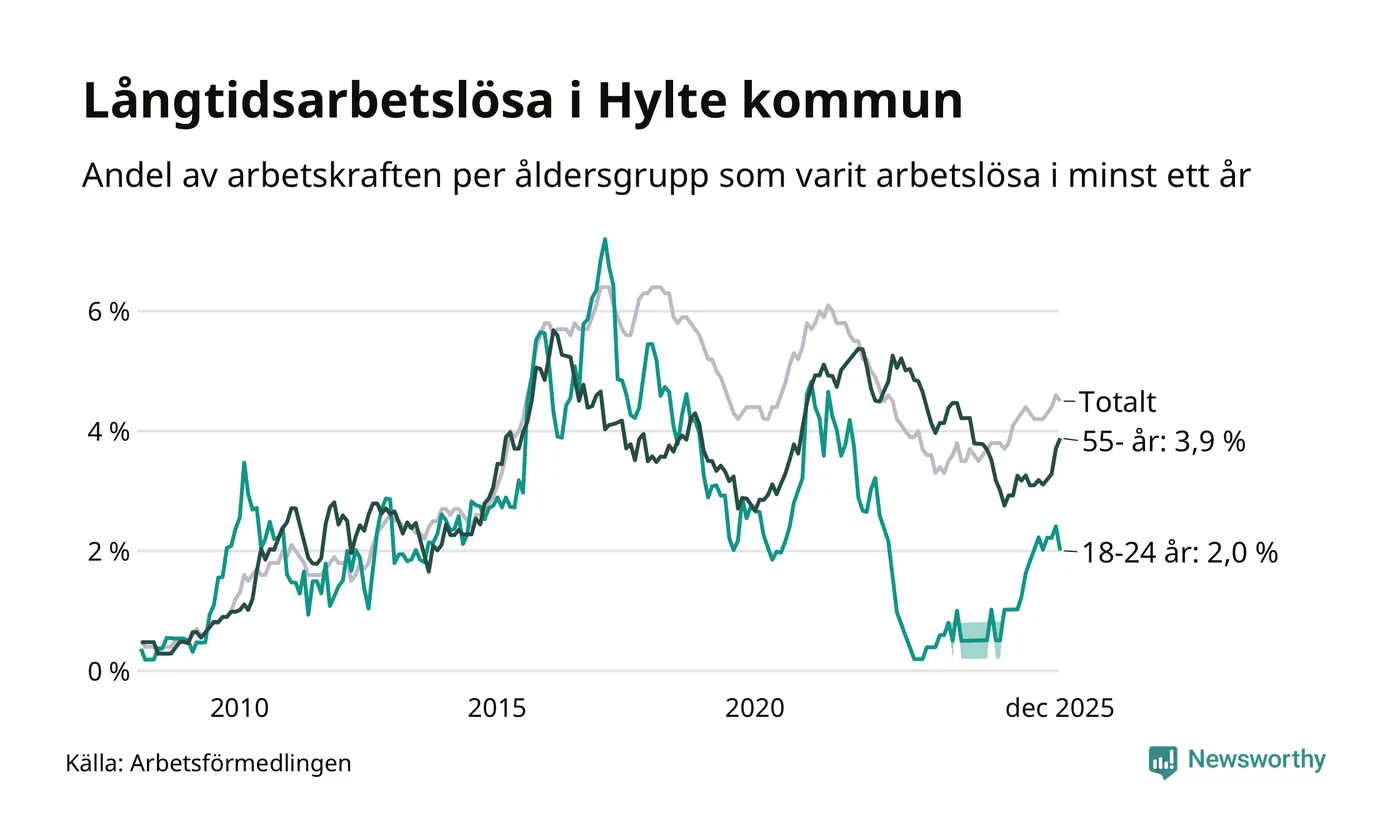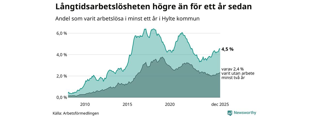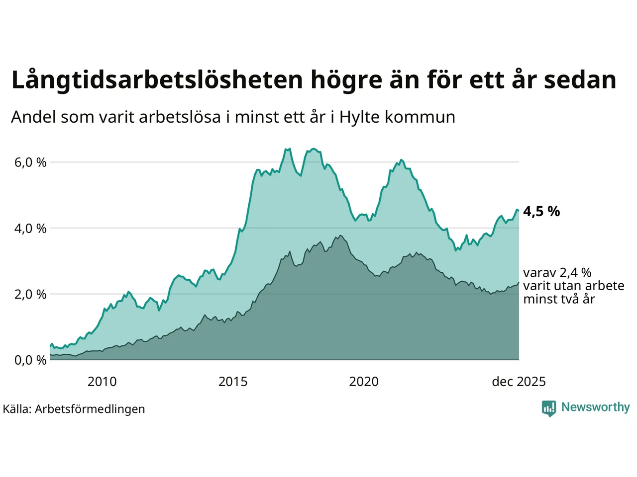 Andelen långtidsarbetslösa i Hylte är den högsta i Hallands län. I Kungsbacka finns länets lägsta långtidsarbetslöshet, 1,1 procent. I Halland som helhet hade 3 706 personer (2,2 procent) varit arbetslösa i minst ett år i december. Det är 19 personer fler än månaden innan.