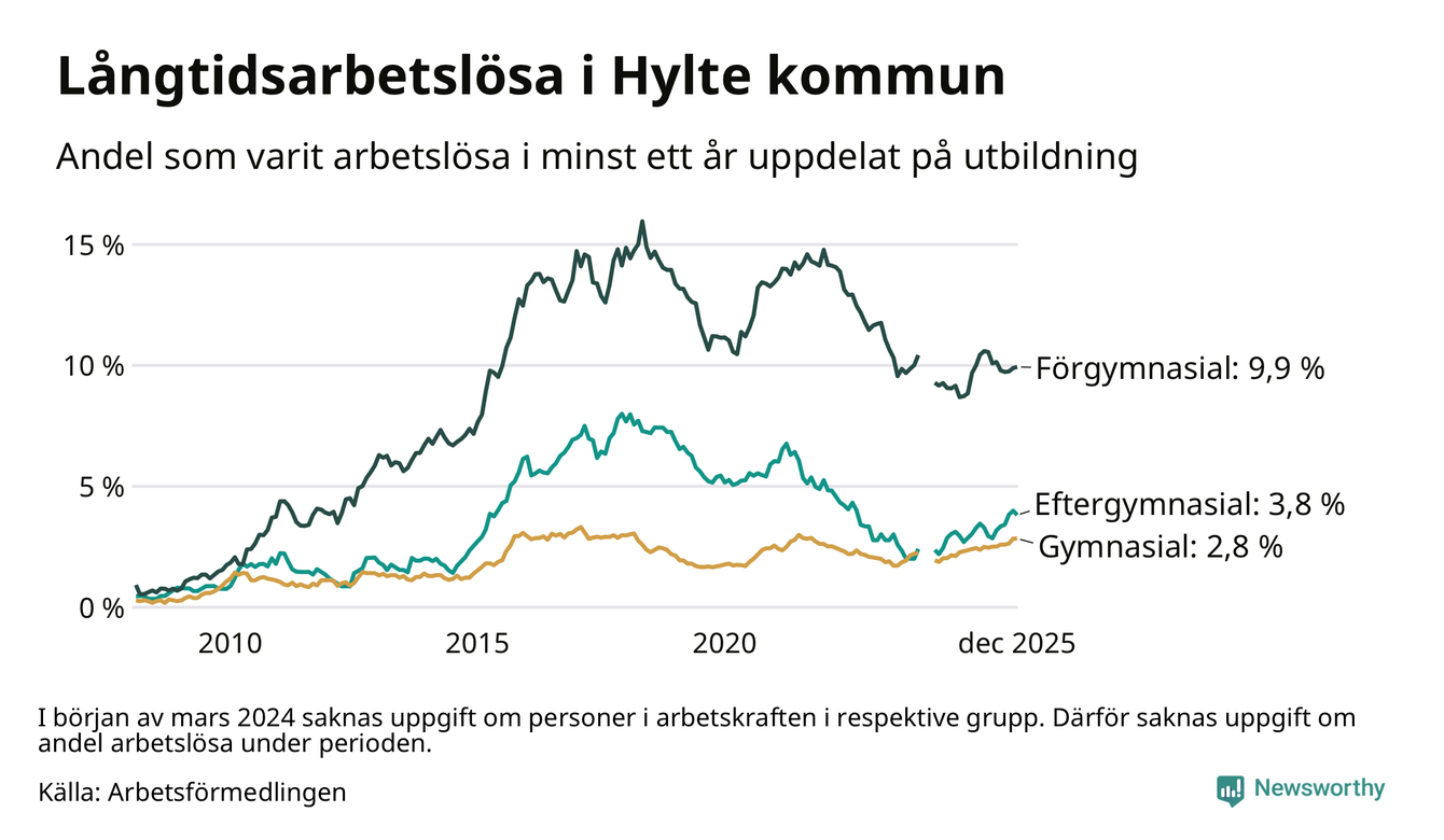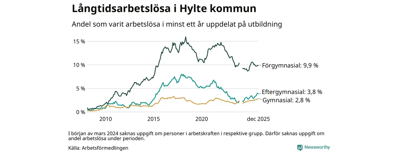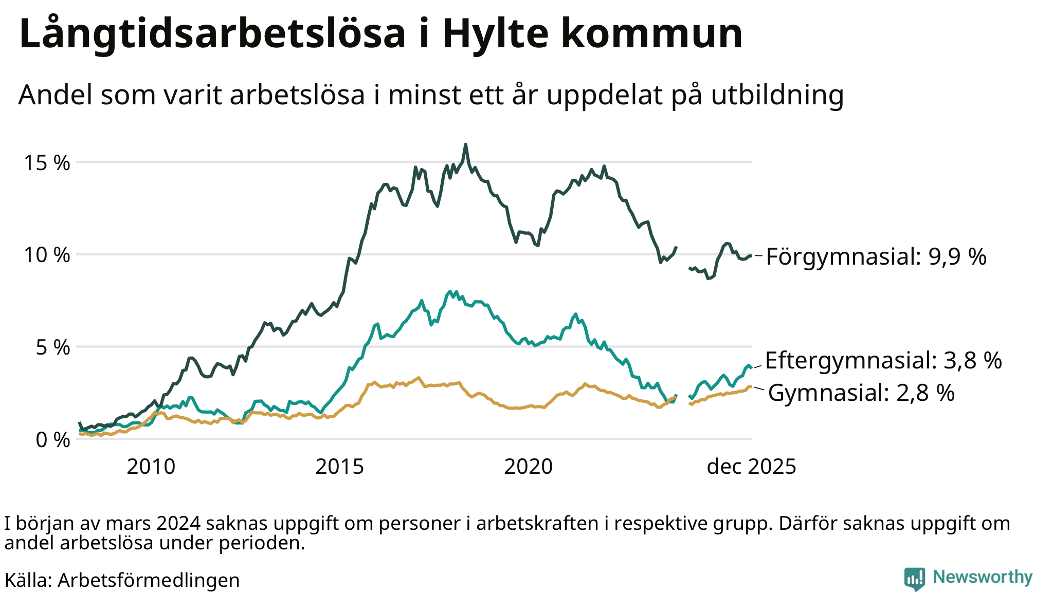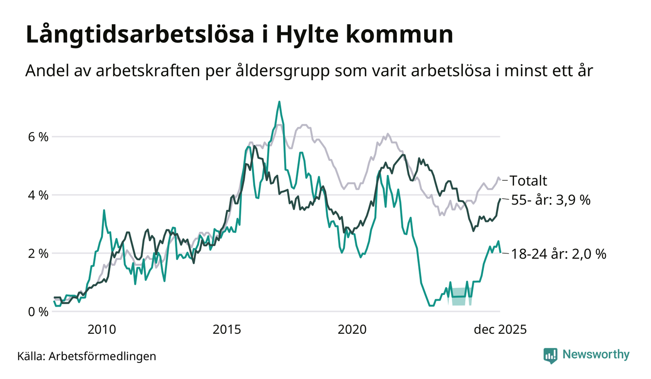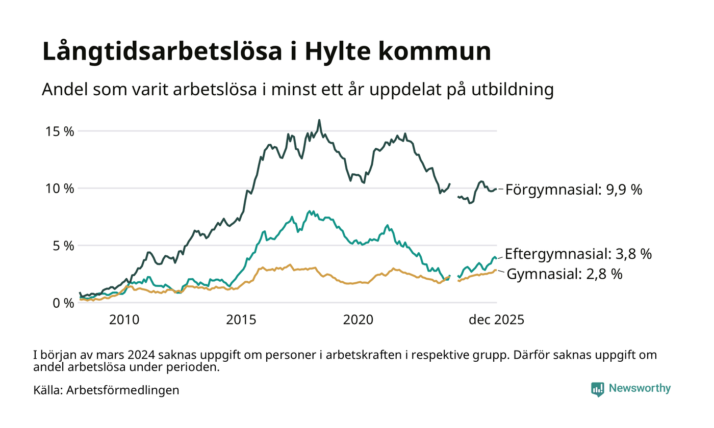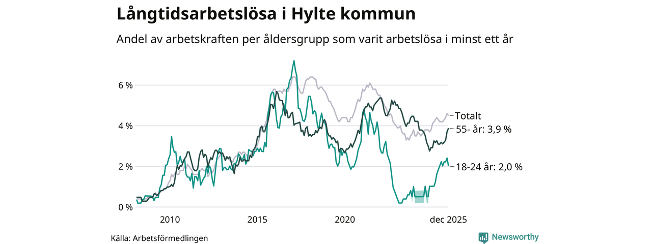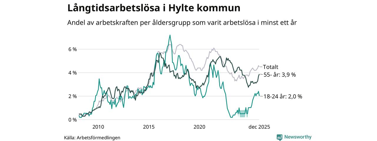 Andelen långtidsarbetslösa i Hylte är den högsta i Hallands län. I Kungsbacka finns länets lägsta långtidsarbetslöshet, 1,1 procent. I Halland som helhet hade 3 706 personer (2,2 procent) varit arbetslösa i minst ett år i december. Det är 19 personer fler än månaden innan.