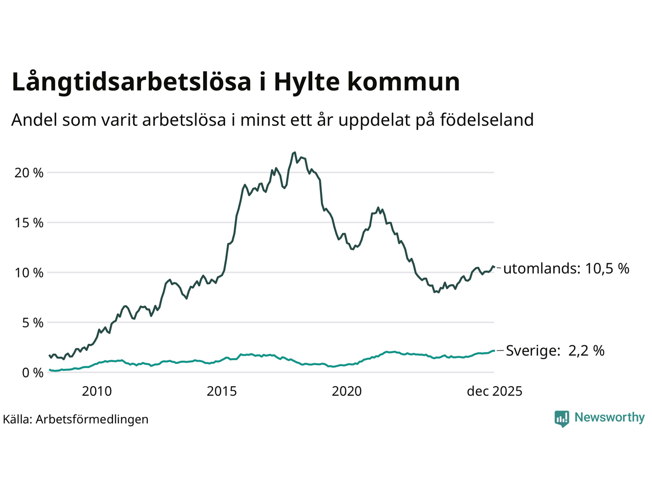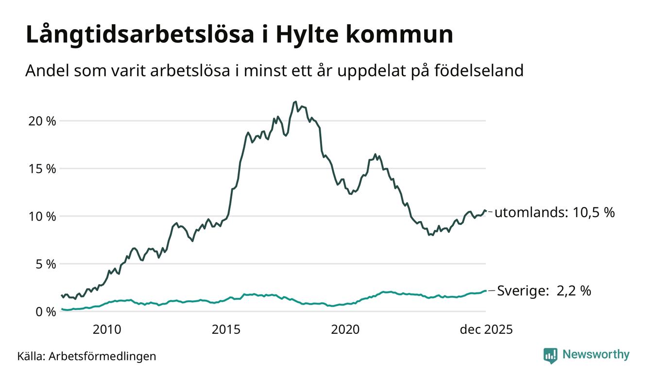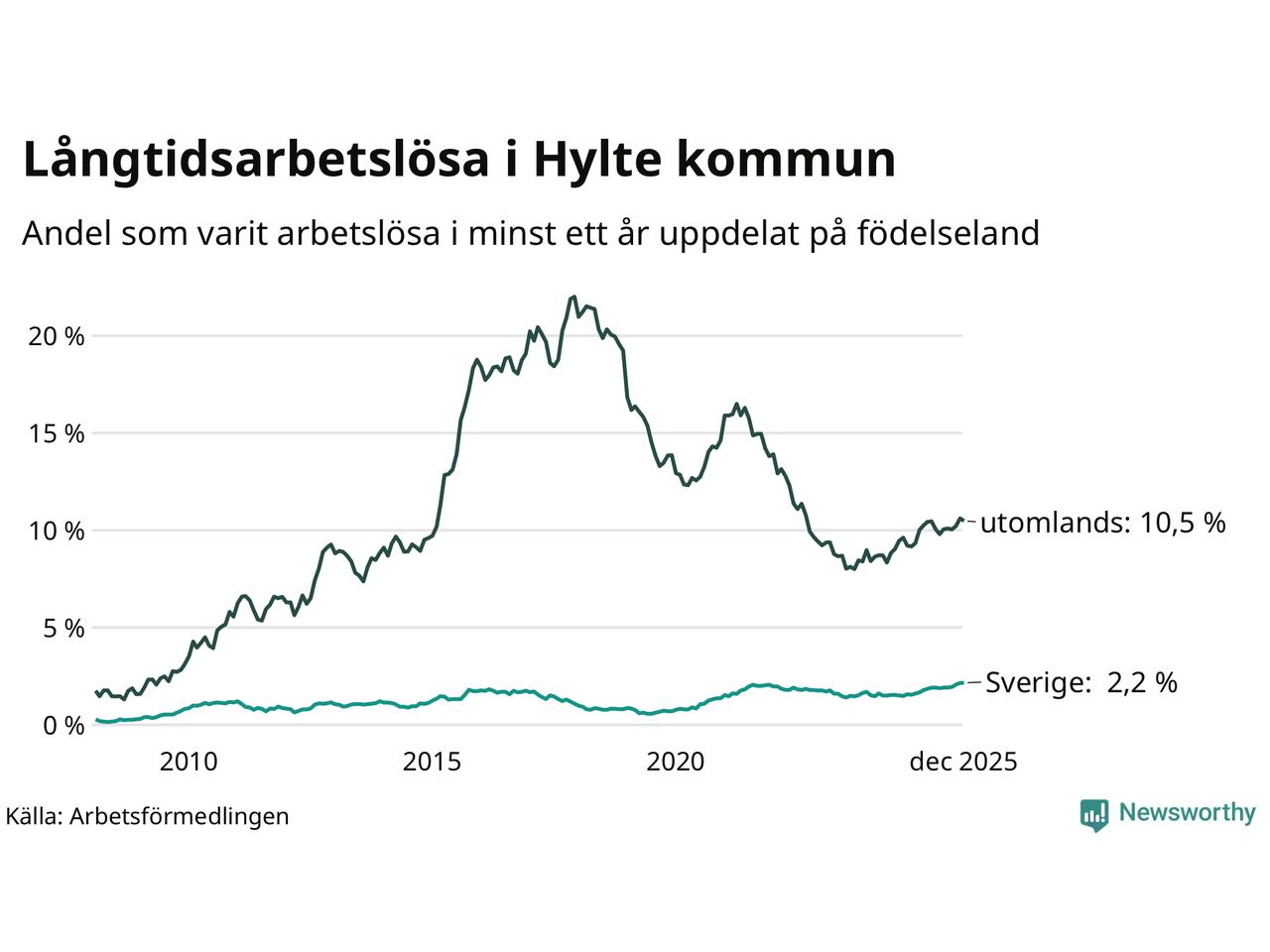 73 av de långtidsarbetslösa i Hylte är födda i Sverige, medan 141 är födda utomlands. Det innebär att långtidsarbetslösheten bland Sverigefödda är 2,2 procent, medan den är fem gånger så hög – 10,5 procent – bland födda utomlands. Även i riket som helhet är arbetslösheten högre bland utrikesfödda.