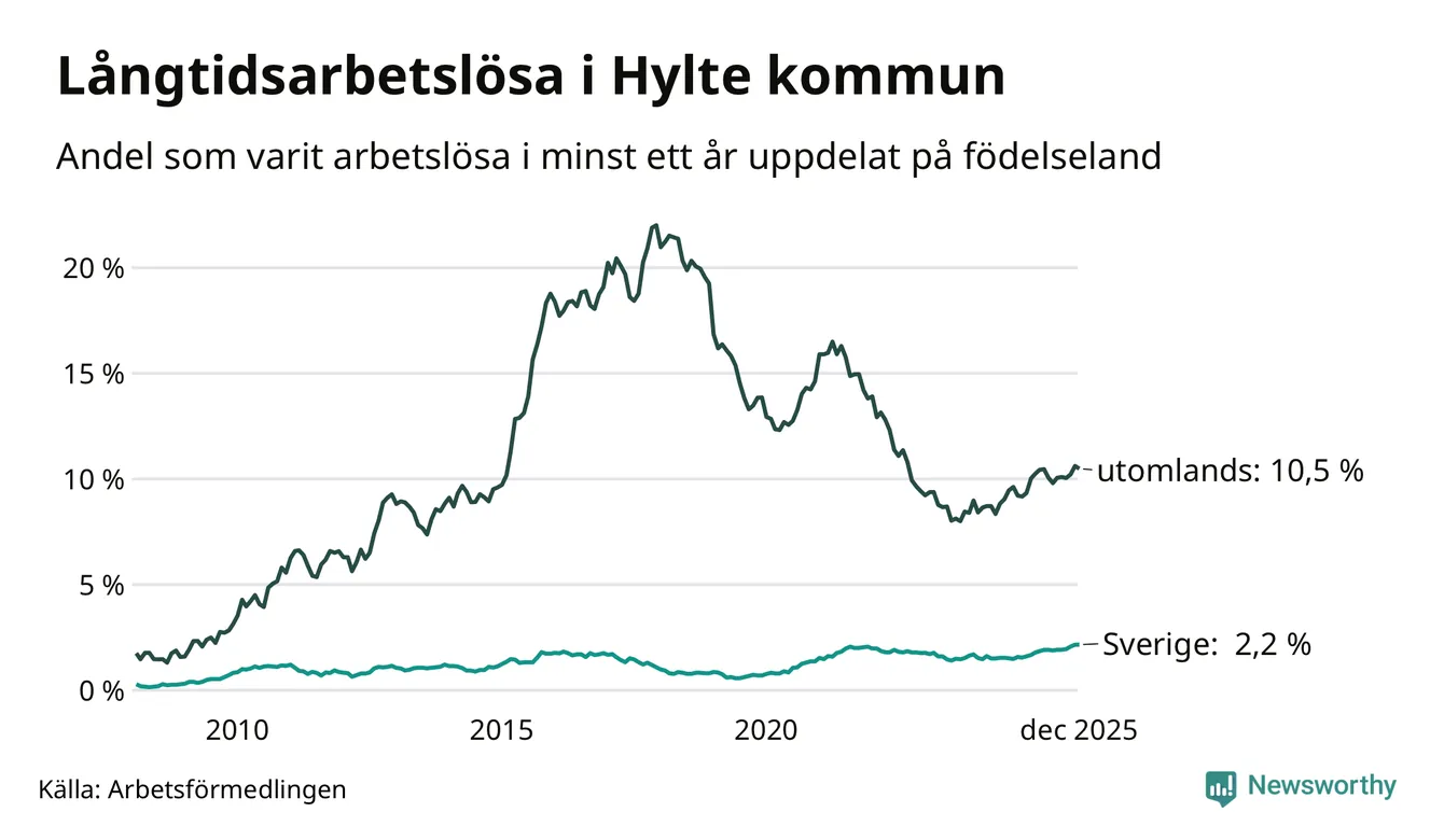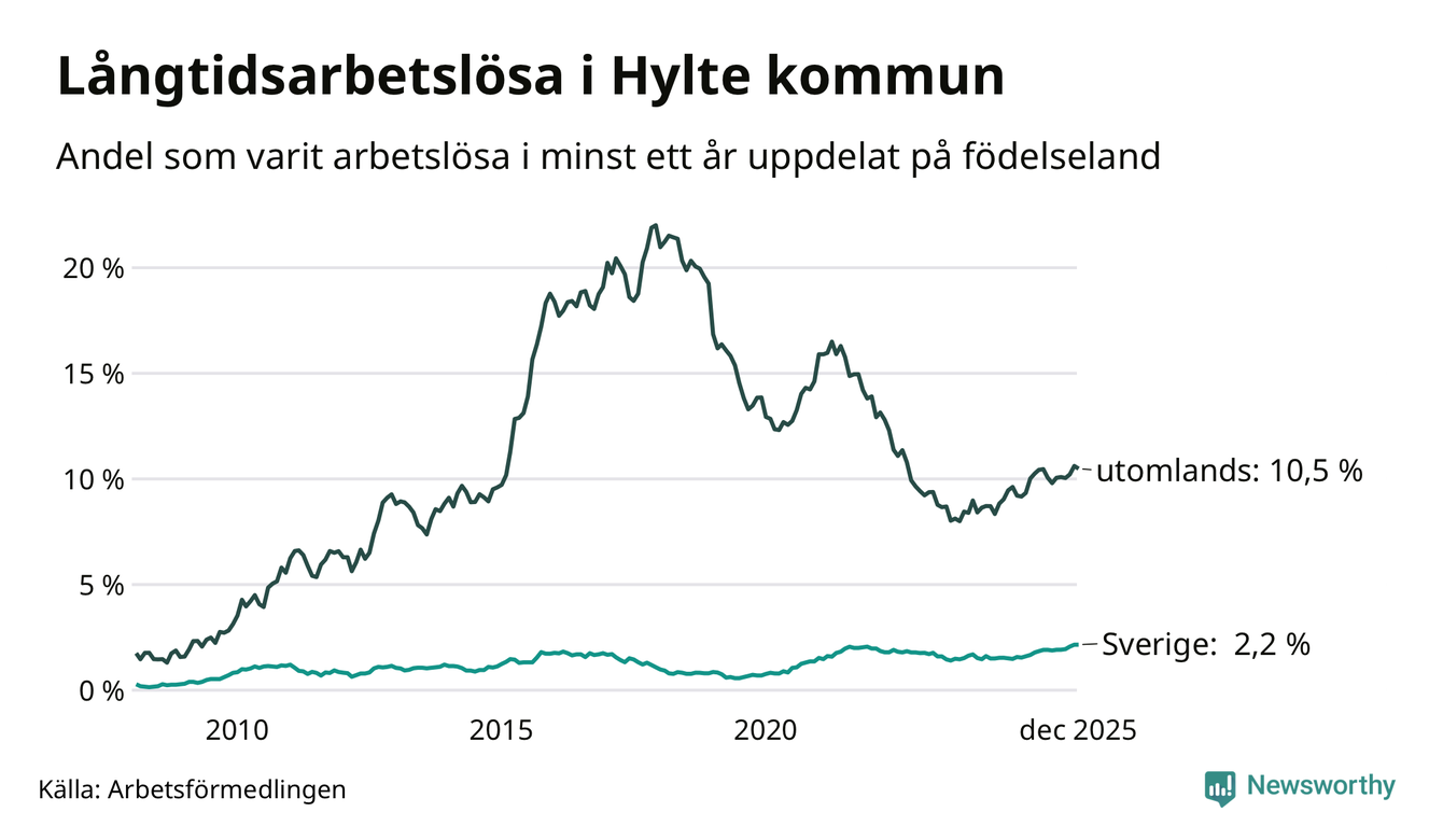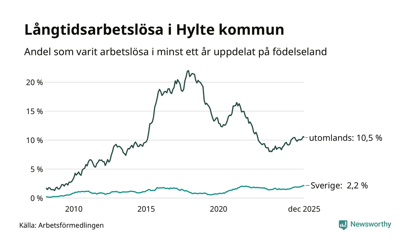 73 av de långtidsarbetslösa i Hylte är födda i Sverige, medan 141 är födda utomlands. Det innebär att långtidsarbetslösheten bland Sverigefödda är 2,2 procent, medan den är fem gånger så hög – 10,5 procent – bland födda utomlands. Även i riket som helhet är arbetslösheten högre bland utrikesfödda.
