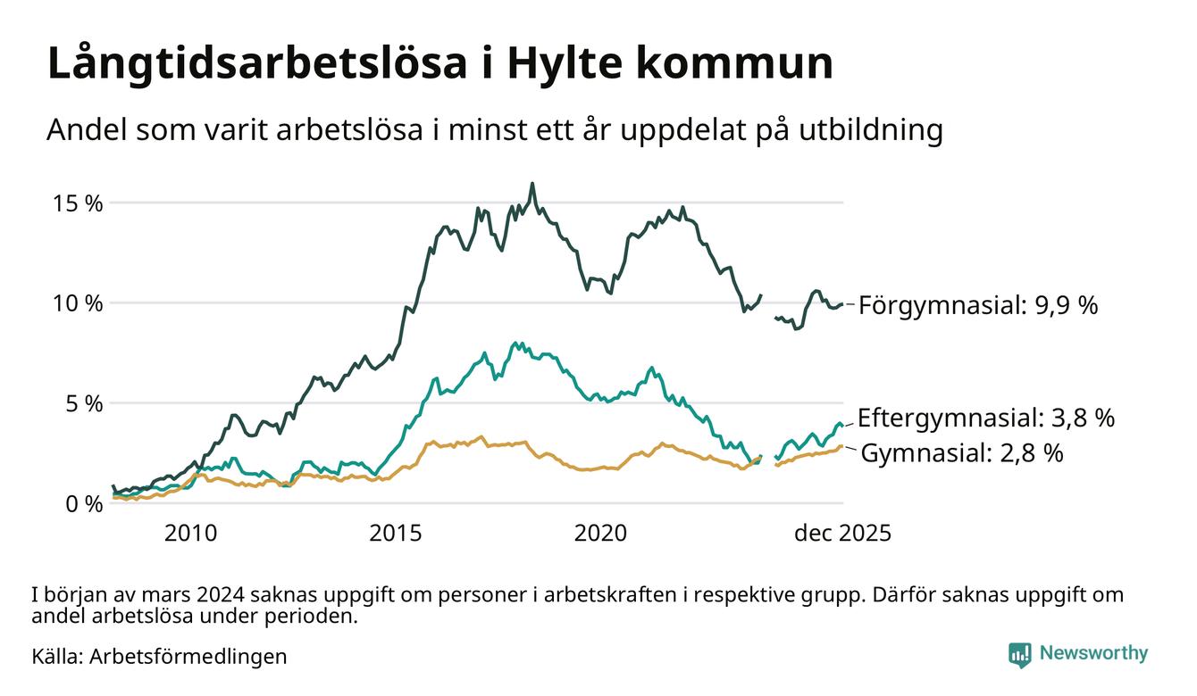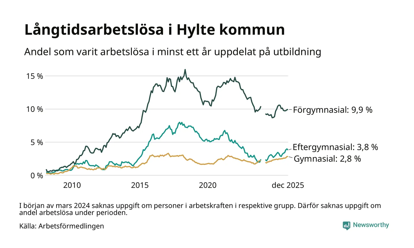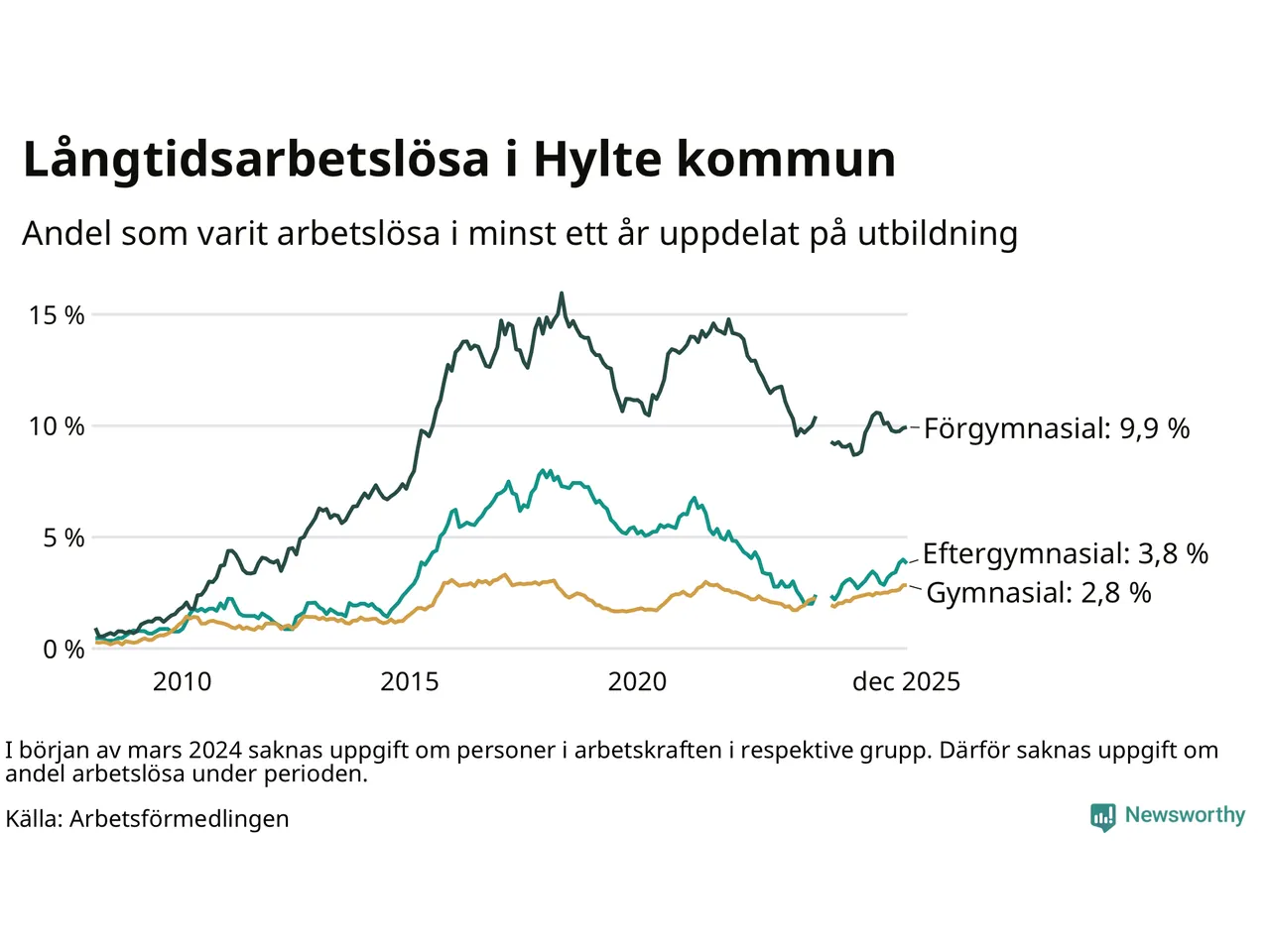 I december hade 214 Hyltebor varit arbetslösa i minst ett år, vilket är två färre än månaden innan. 214 personer motsvarar 4,5 procent av arbetskraften i kommunen – andelen långtidsarbetslösa är 0,7 procentenheter högre än samma månad för ett år sedan. Hylte tillhör de kommuner som har högst andel långtidsarbetslösa i hela landet just nu.