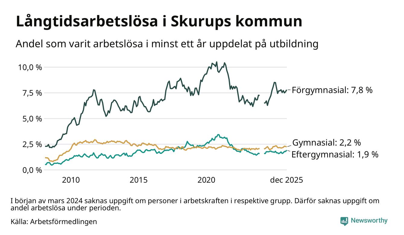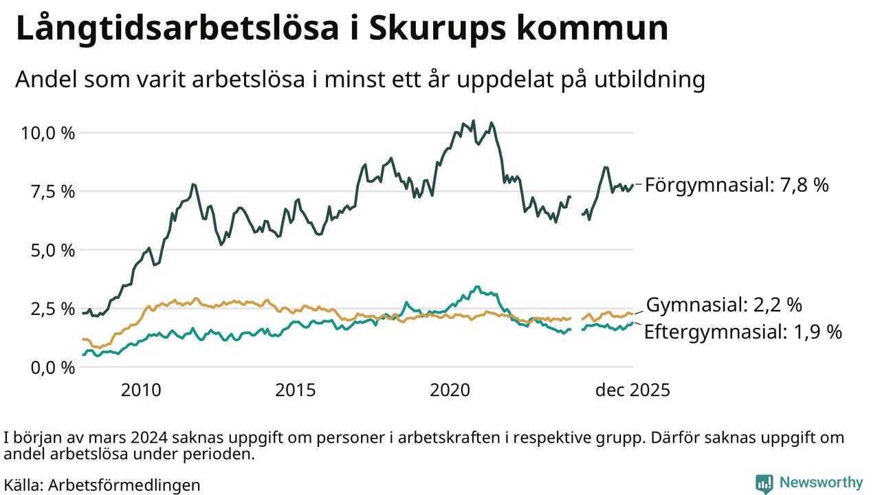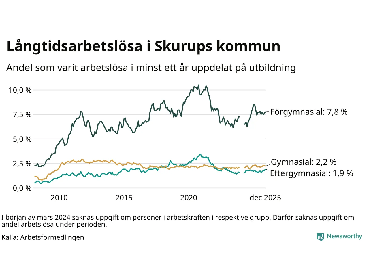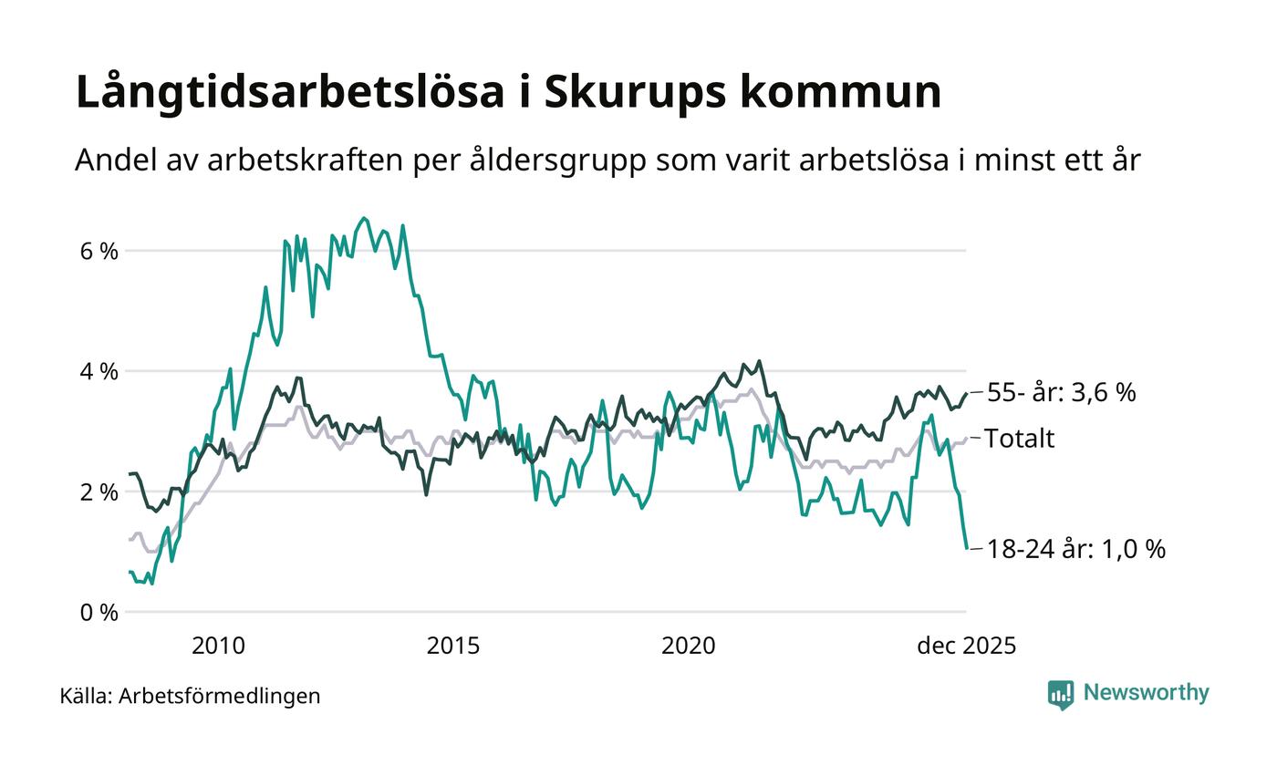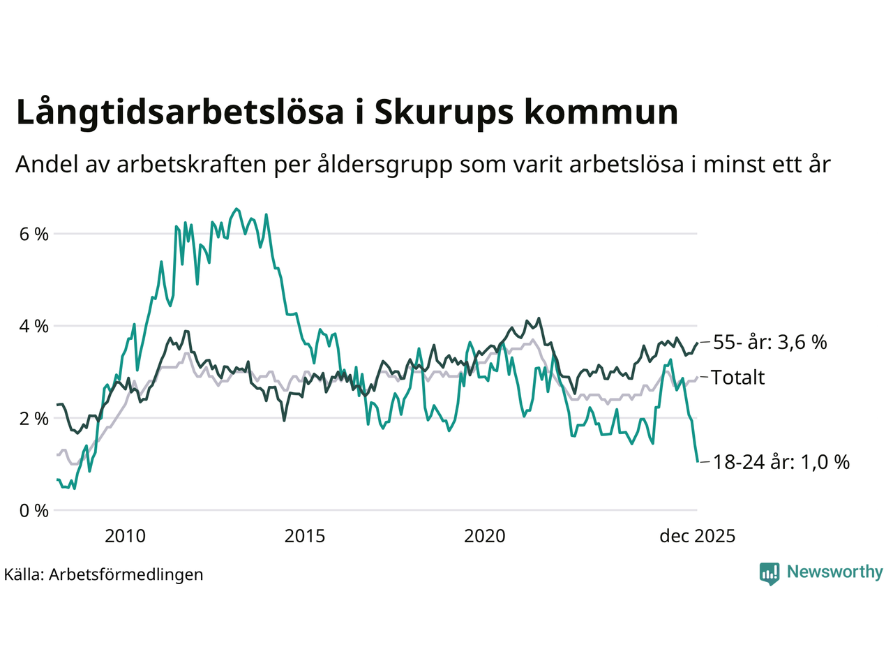 Av de 244 personerna som varit arbetslösa i mer än ett år i Skurups kommun är 72 personer mellan 55 och 651 år och åtta är mellan 18 och 24 år. För den äldre gruppen är andelen arbetslösa 3,6 procent medan den i den yngre gruppen är 1,0 procent. Även i riket som helhet är långtidsarbetslösheten högre i gruppen äldre.