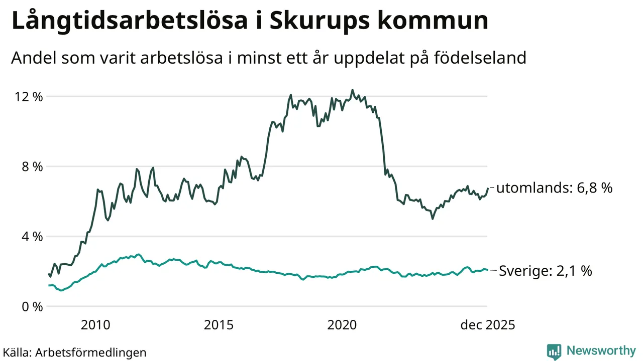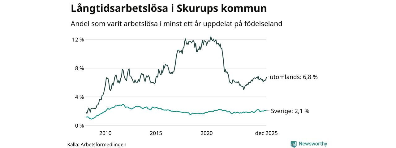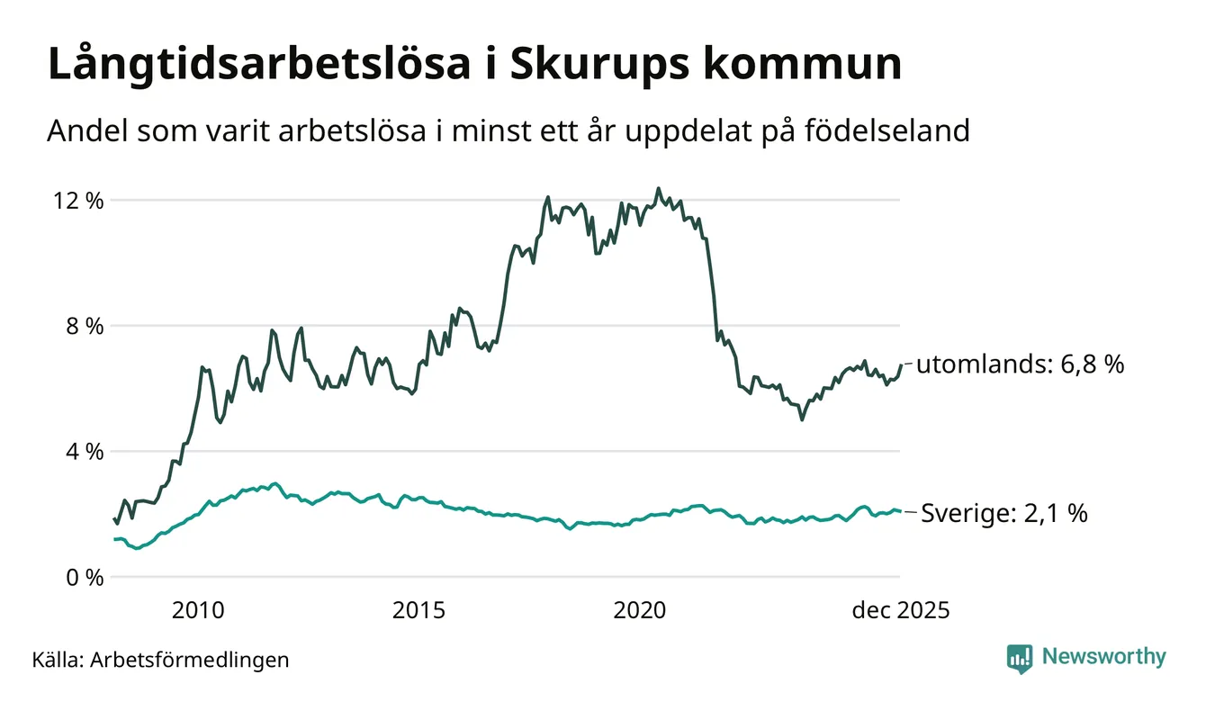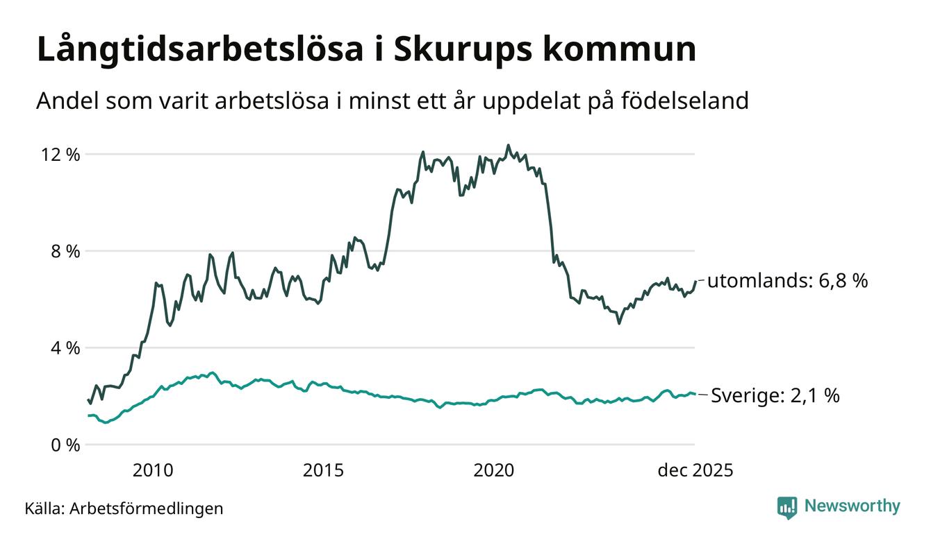 145 av de långtidsarbetslösa i Skurup är födda i Sverige, medan 99 är födda utomlands. Det innebär att långtidsarbetslösheten bland Sverigefödda är 2,1 procent, medan den är tre gånger så hög – 6,8 procent – bland födda utomlands. Även i riket som helhet är arbetslösheten högre bland utrikesfödda.