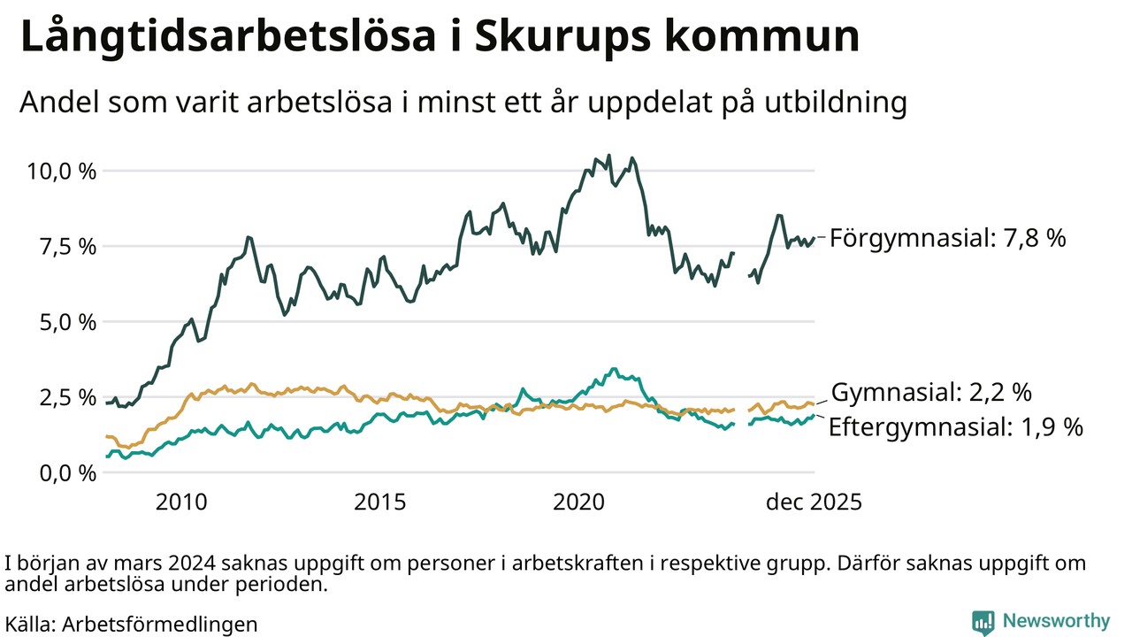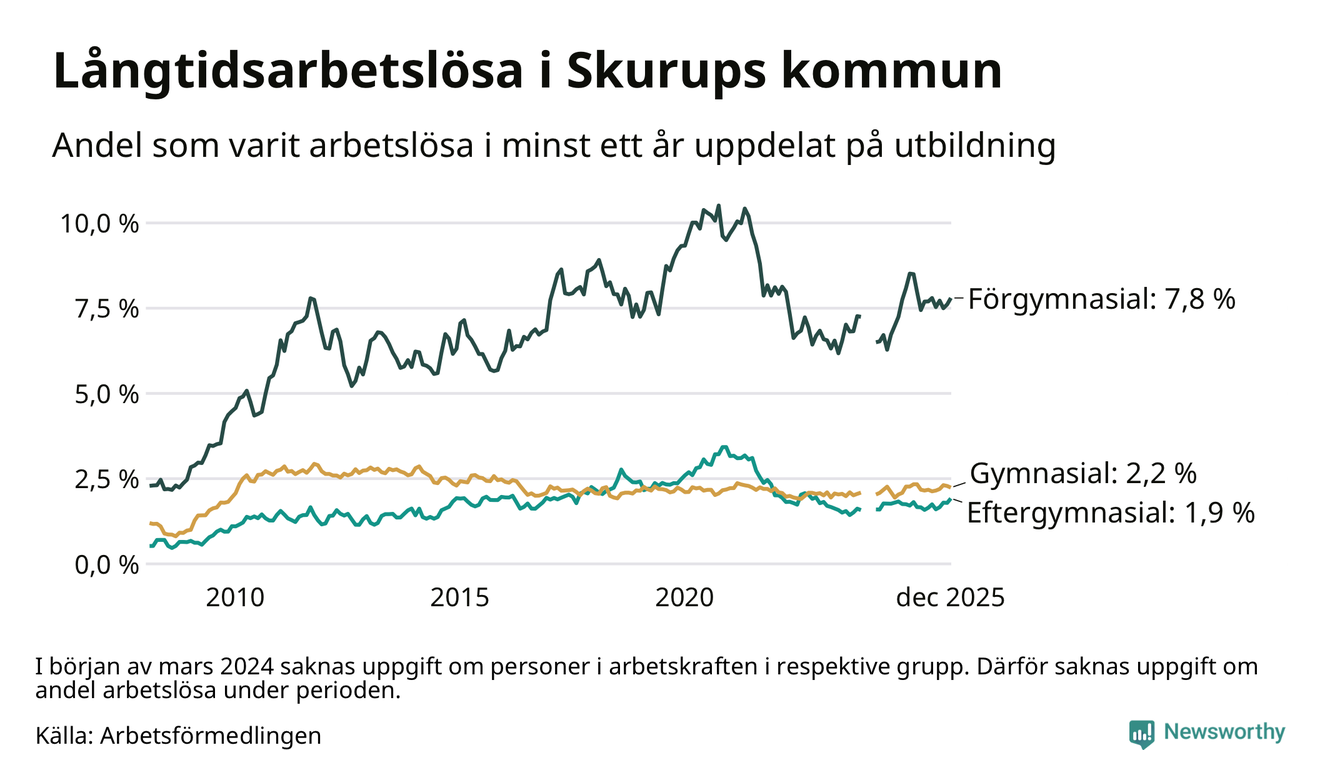 Andelen som varit utan arbete i minst ett år i Skurup var ungefär lika stor i december jämfört med samma månad för ett år sedan. Det visar Arbetsfömedlingens senaste månadsstatistik.