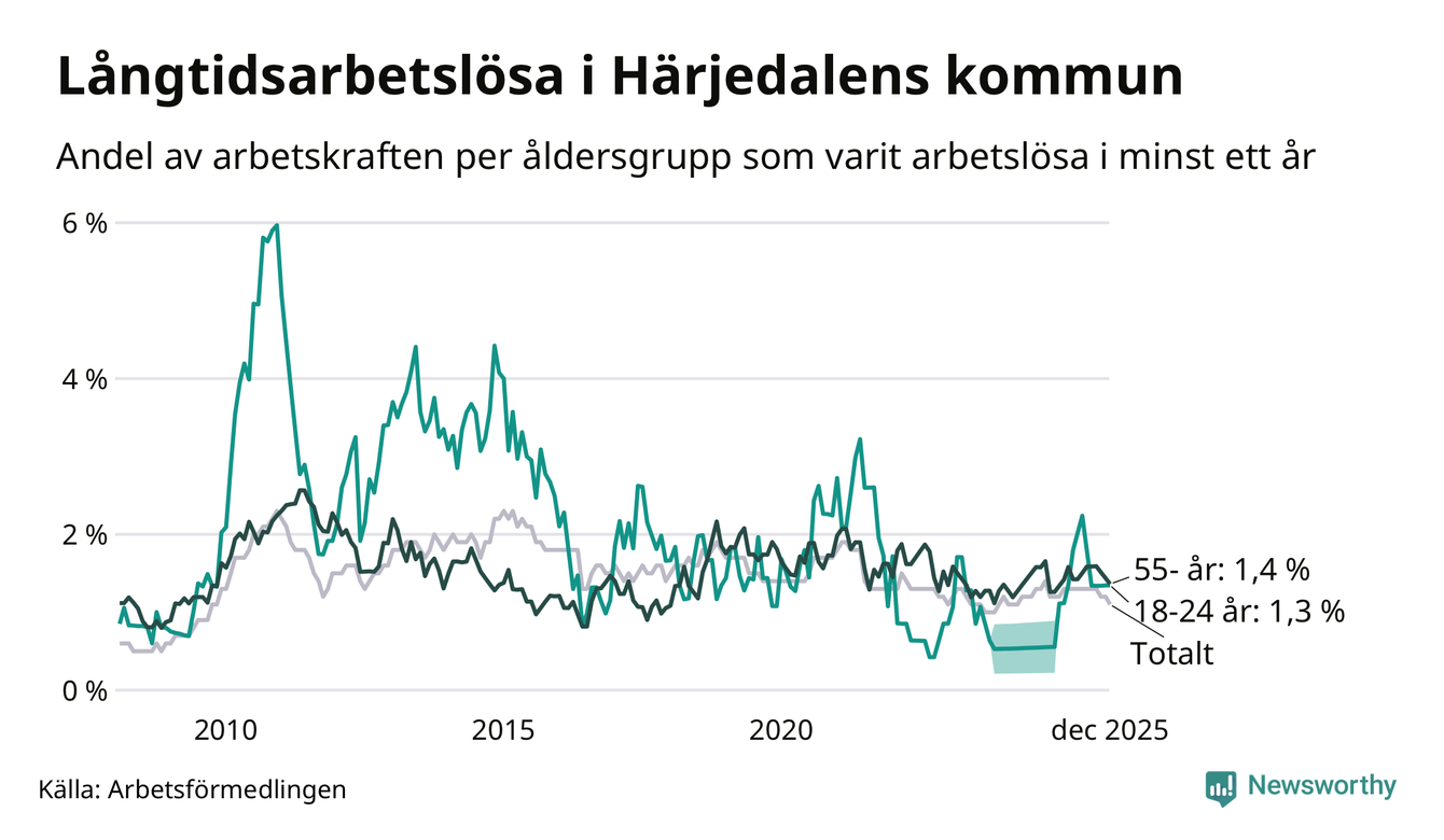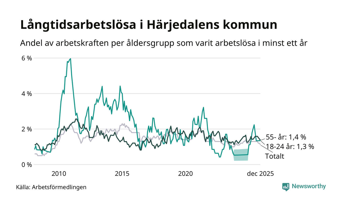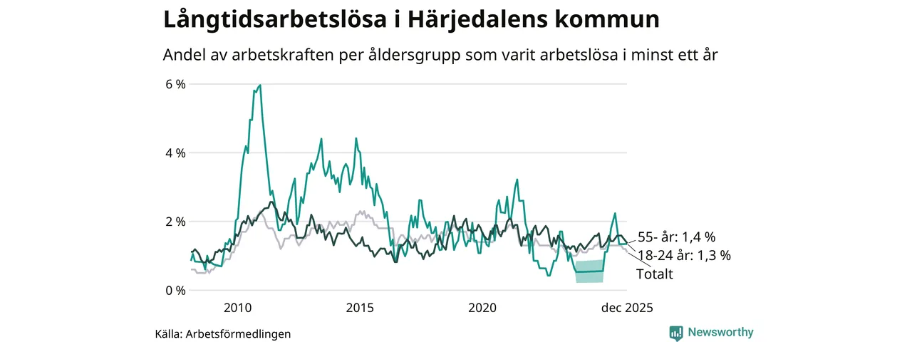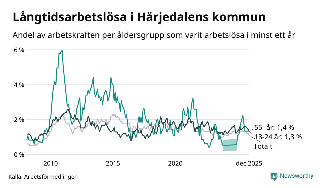 Av de 53 personerna som varit arbetslösa i mer än ett år i Härjedalens kommun är 17 personer mellan 55 och 651 år och sex är mellan 18 och 24 år. För den äldre gruppen är andelen arbetslösa 1,4 procent medan den i den yngre gruppen är 1,3 procent. Även i riket som helhet är långtidsarbetslösheten högre i gruppen äldre.