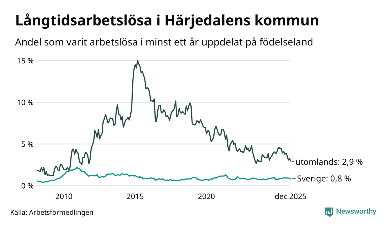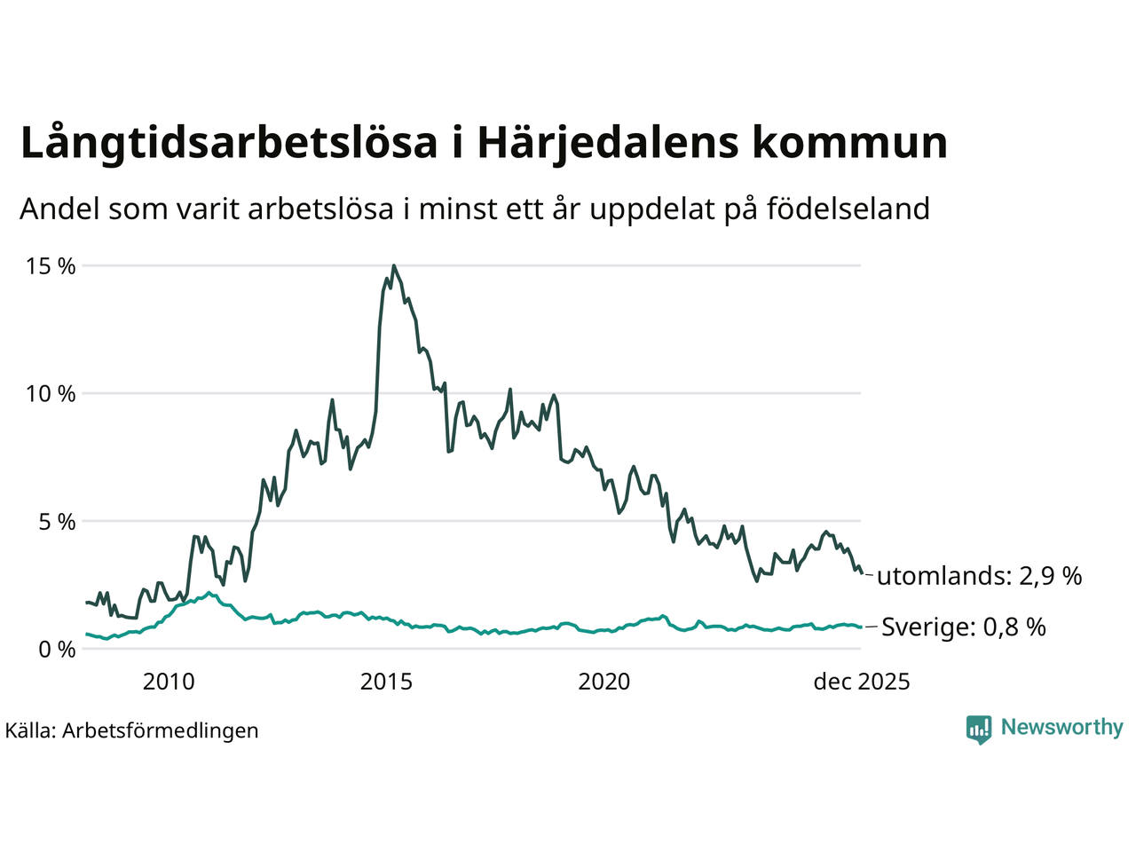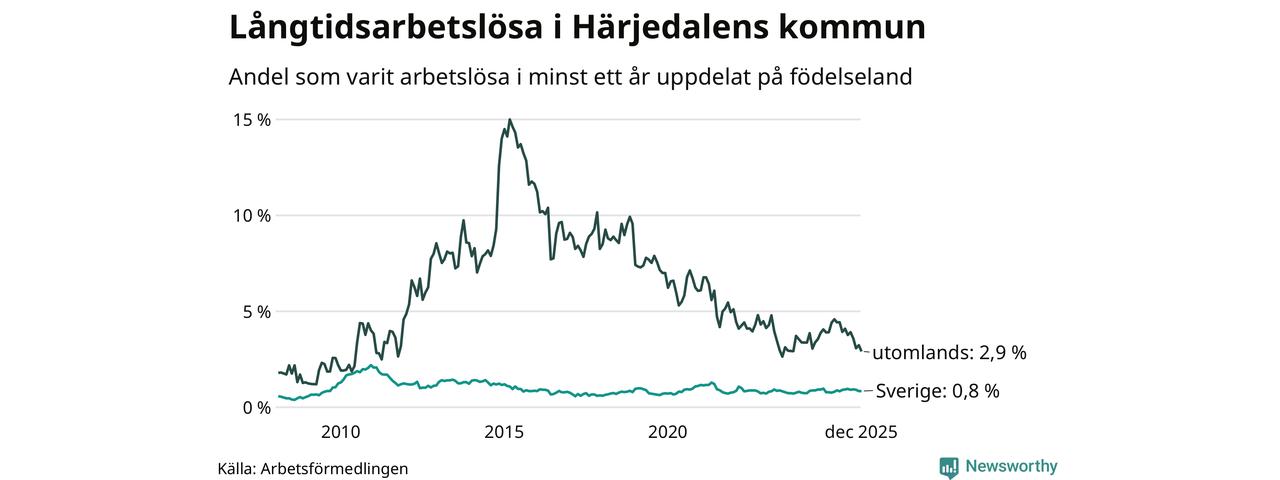 35 av de långtidsarbetslösa i Härjedalen är födda i Sverige, medan 18 är födda utomlands. Det innebär att långtidsarbetslösheten bland Sverigefödda är 0,8 procent, medan den är fyra gånger så hög – 2,9 procent – bland födda utomlands. Även i riket som helhet är arbetslösheten högre bland utrikesfödda.