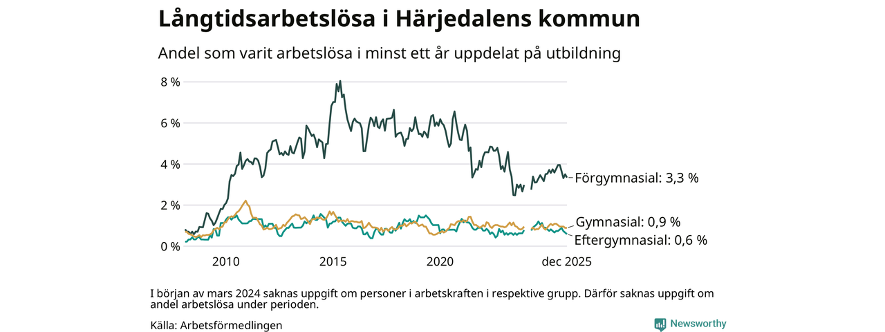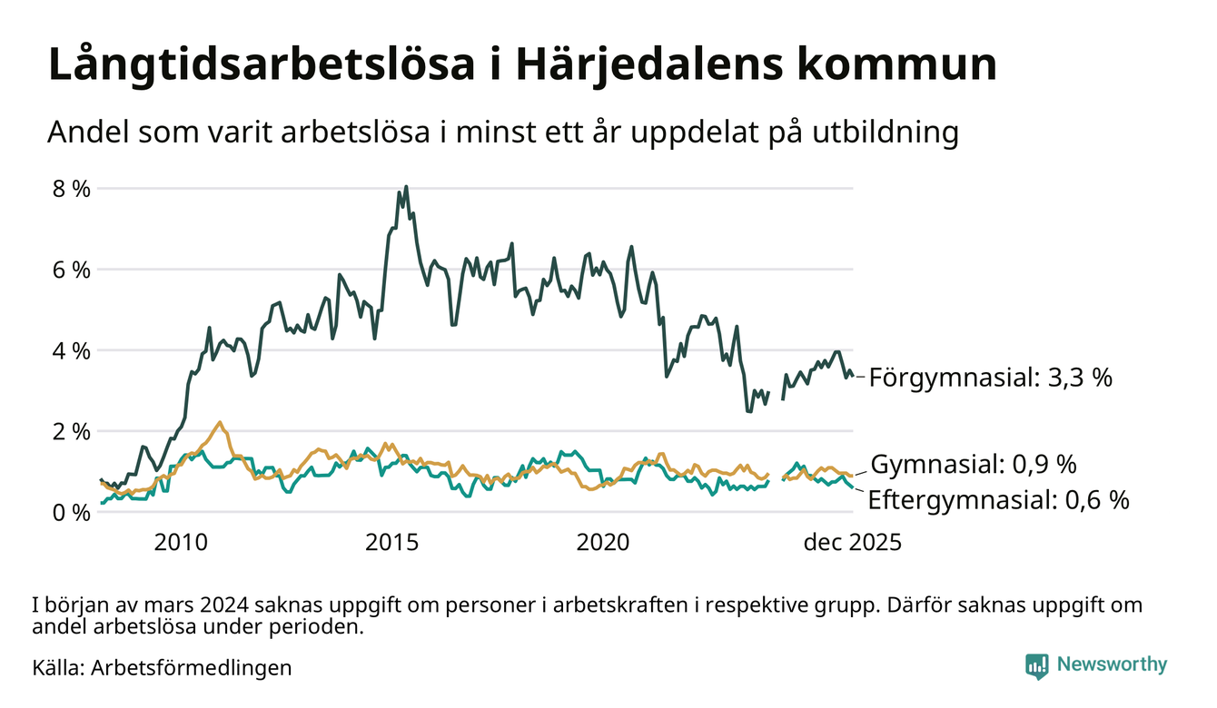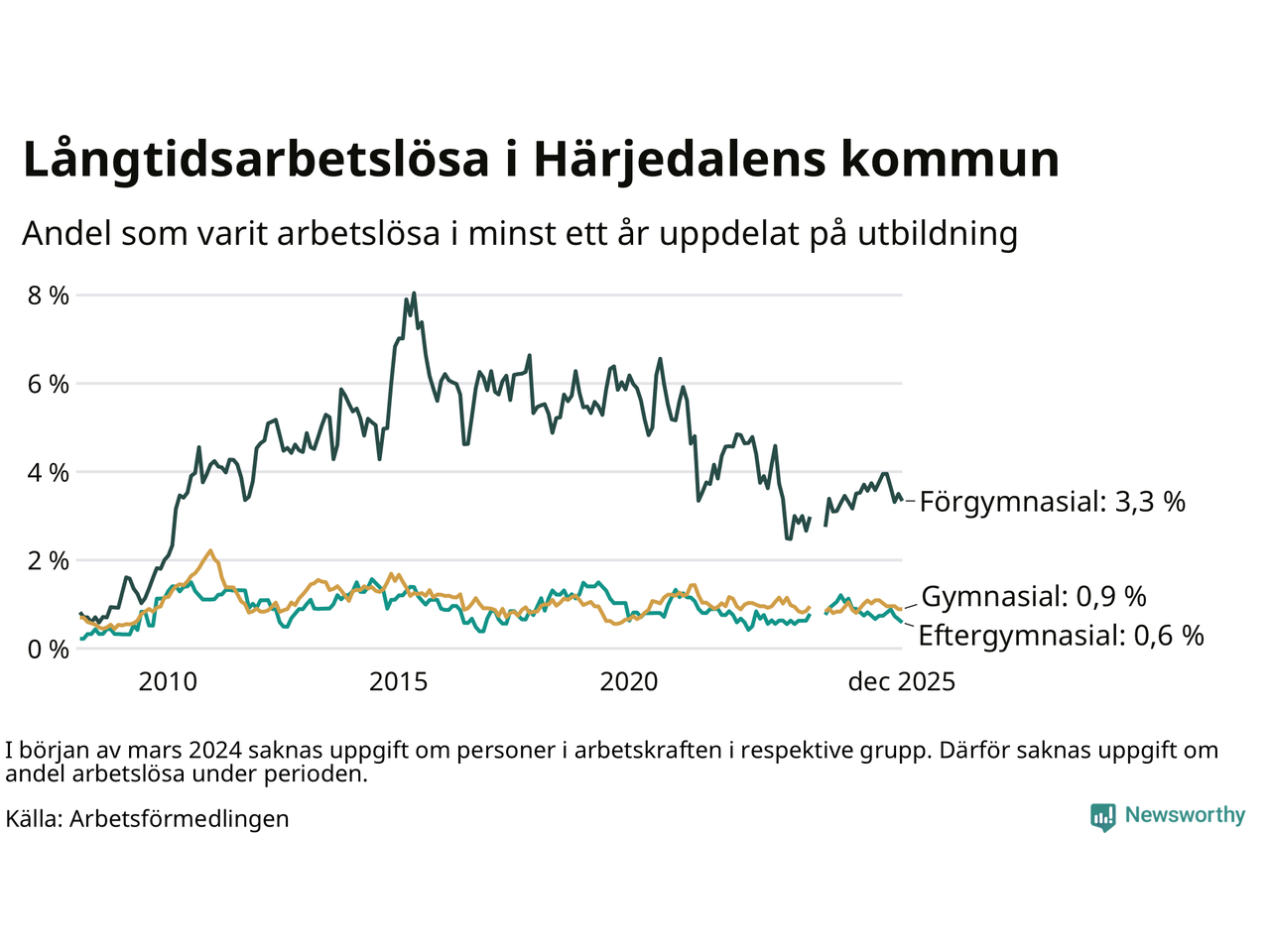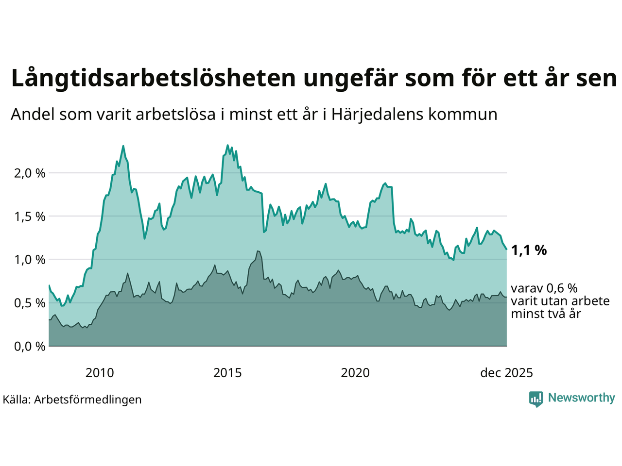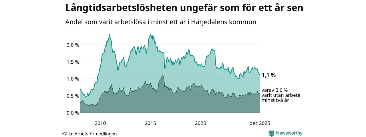I december hade 53 Härjedalsbor varit arbetslösa i minst ett år, vilket är två färre än månaden innan. Det är den sjätte månaden i rad med minskande antal långtidsarbetslösa. 53 personer motsvarar 1,1 procent av arbetskraften i kommunen – andelen långtidsarbetslösa är ungefär på samma nivå som för ett år sedan. Härjedalen tillhör de kommuner som har lägst andel långtidsarbetslösa i hela landet just nu.