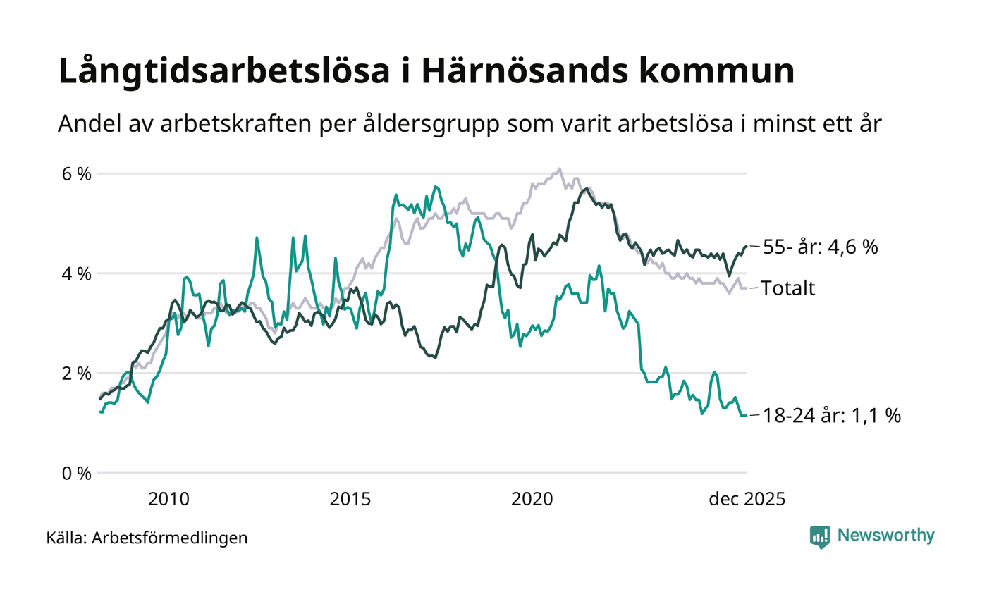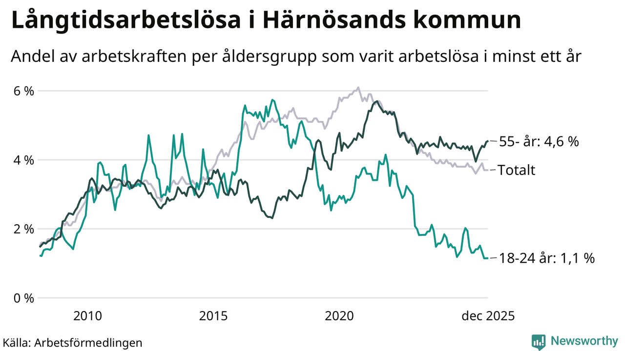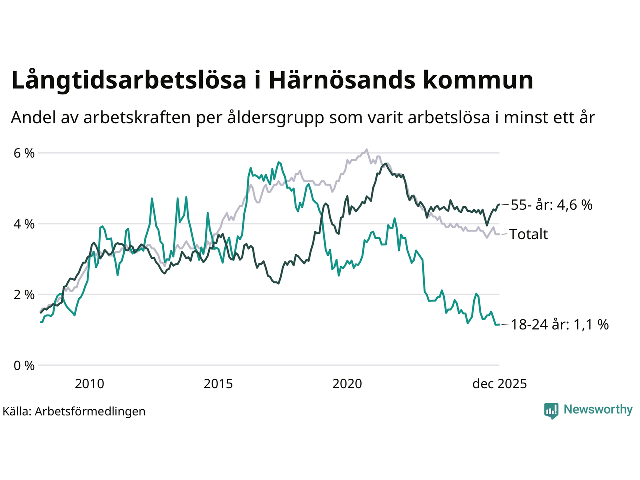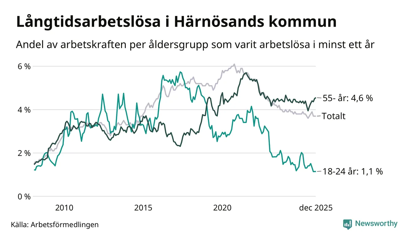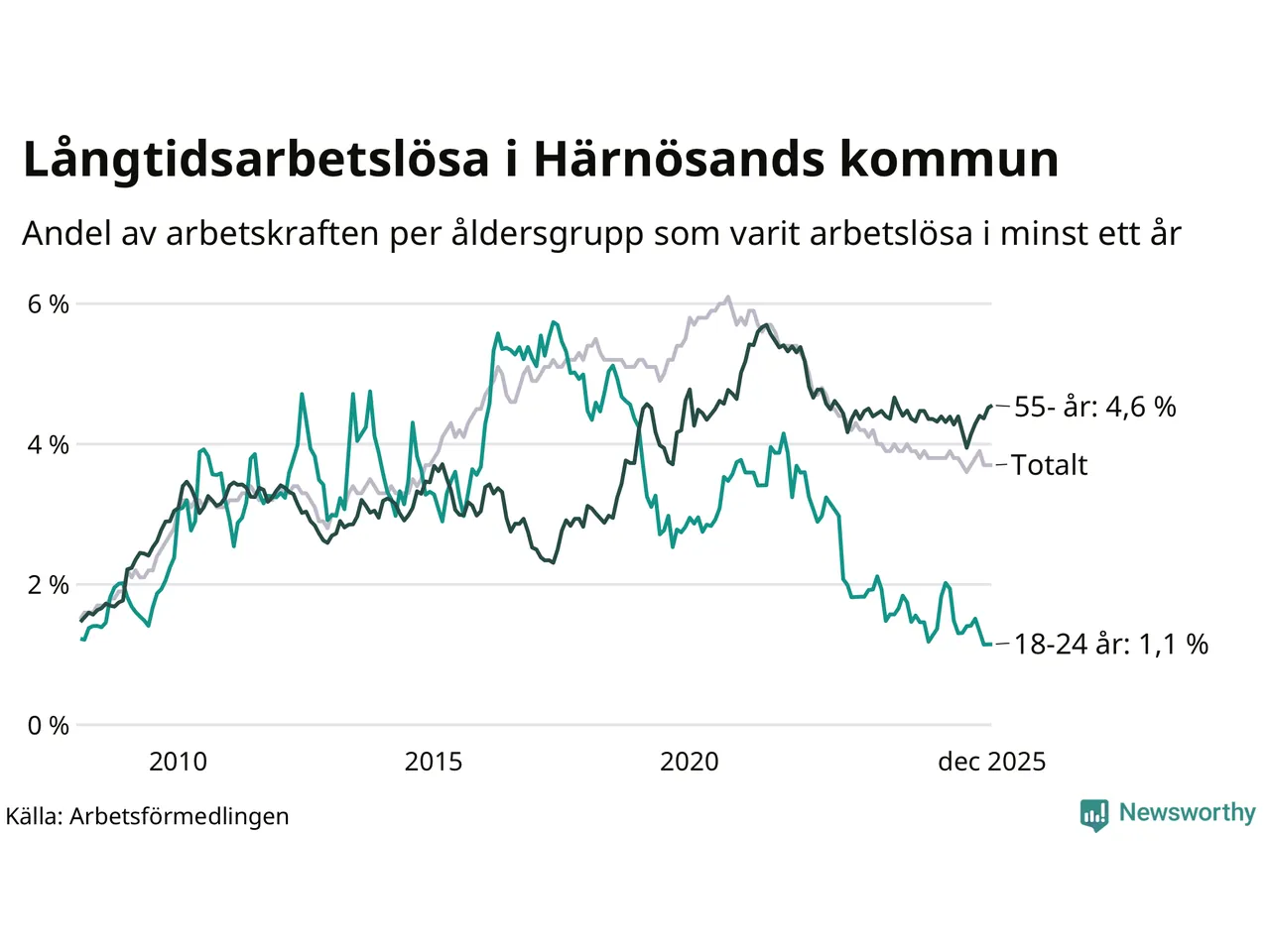 Av de 407 personerna som varit arbetslösa i mer än ett år i Härnösands kommun är 121 personer mellan 55 och 651 år och tolv är mellan 18 och 24 år. För den äldre gruppen är andelen arbetslösa 4,6 procent medan den i den yngre gruppen är 1,1 procent. Även i riket som helhet är långtidsarbetslösheten högre i gruppen äldre.