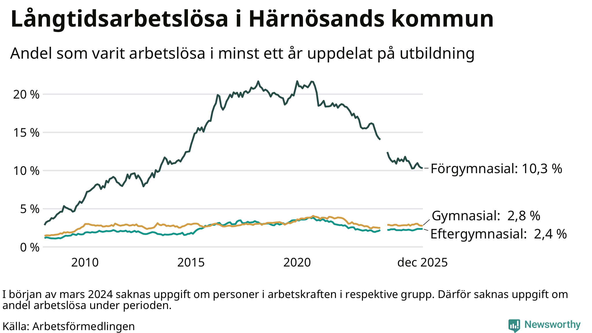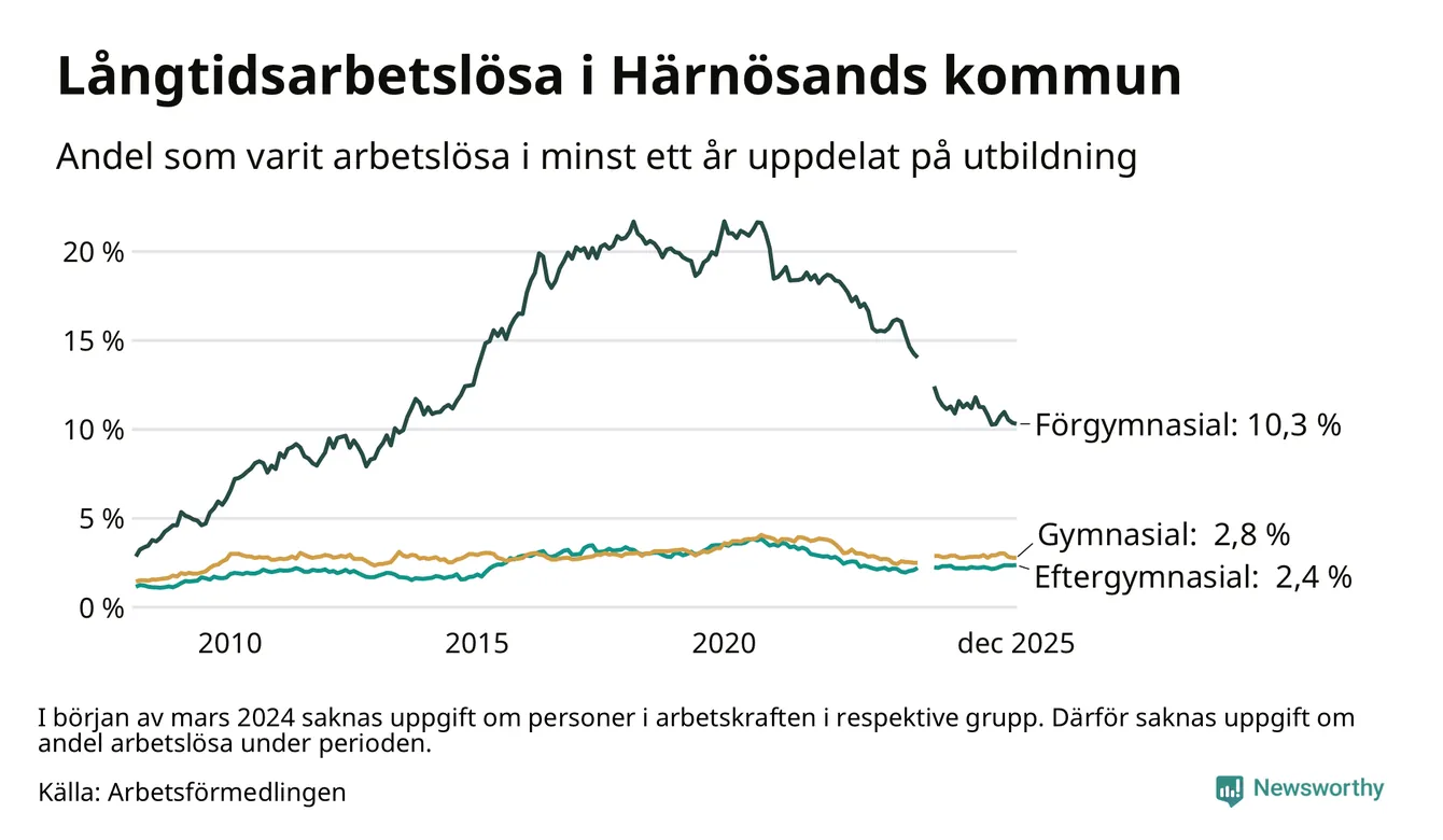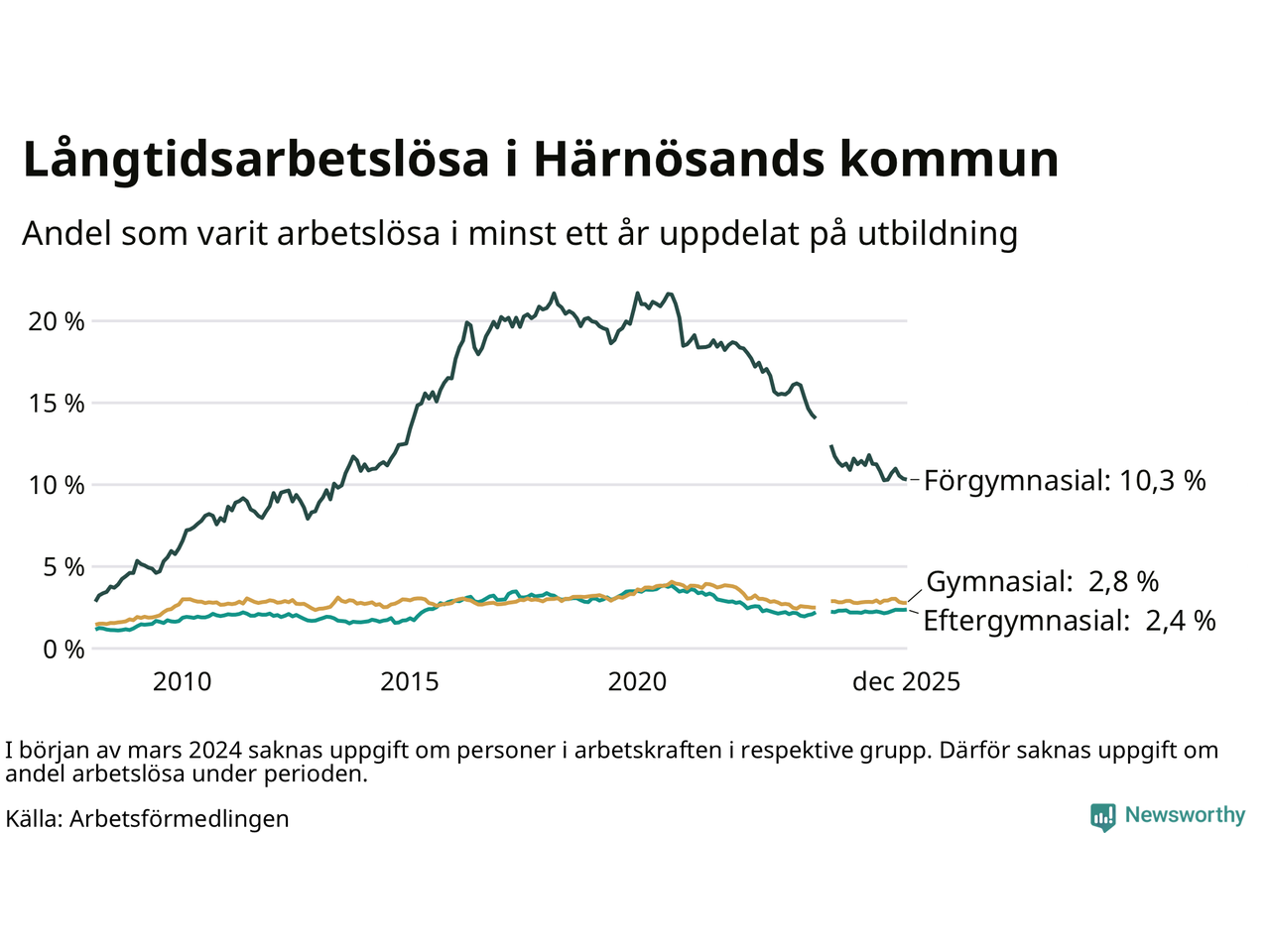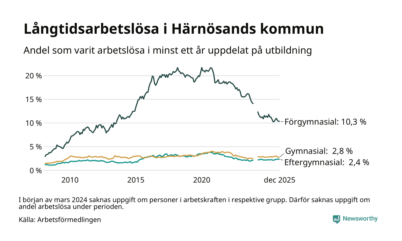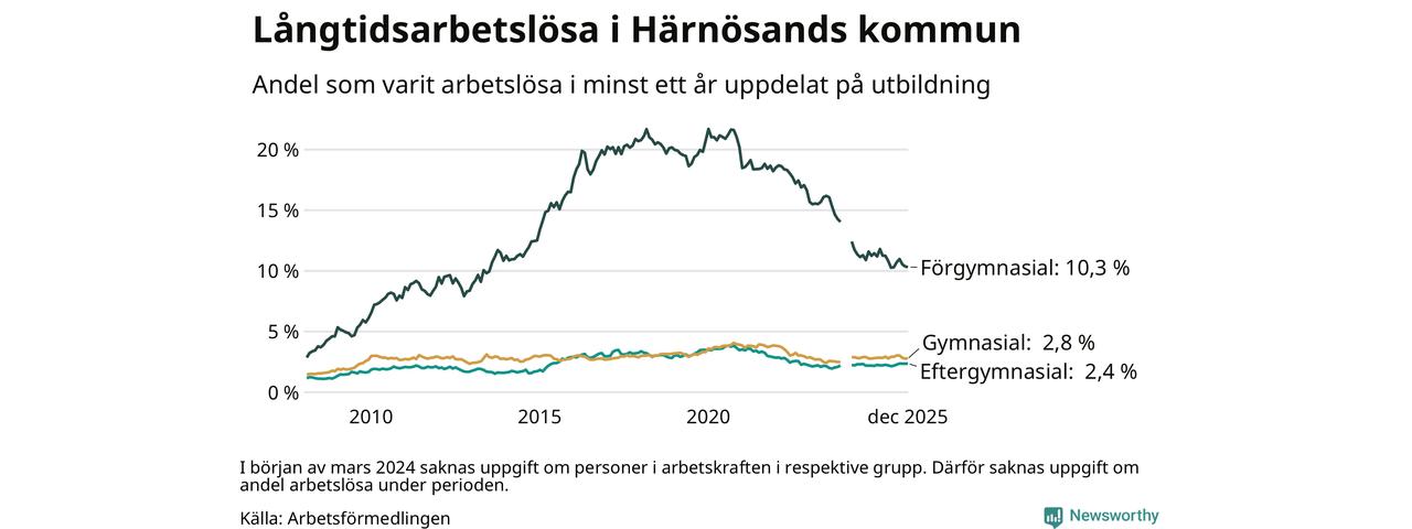 Av de 407 personerna som varit arbetslösa i mer än ett år i Härnösands kommun är 121 personer mellan 55 och 651 år och tolv är mellan 18 och 24 år. För den äldre gruppen är andelen arbetslösa 4,6 procent medan den i den yngre gruppen är 1,1 procent. Även i riket som helhet är långtidsarbetslösheten högre i gruppen äldre.
