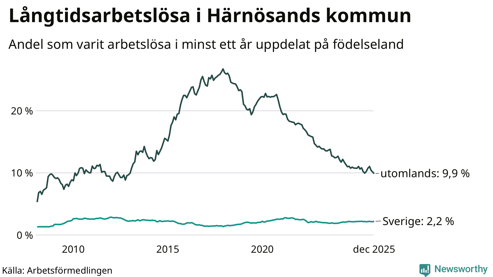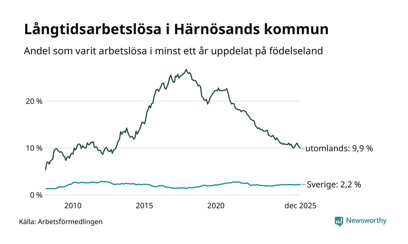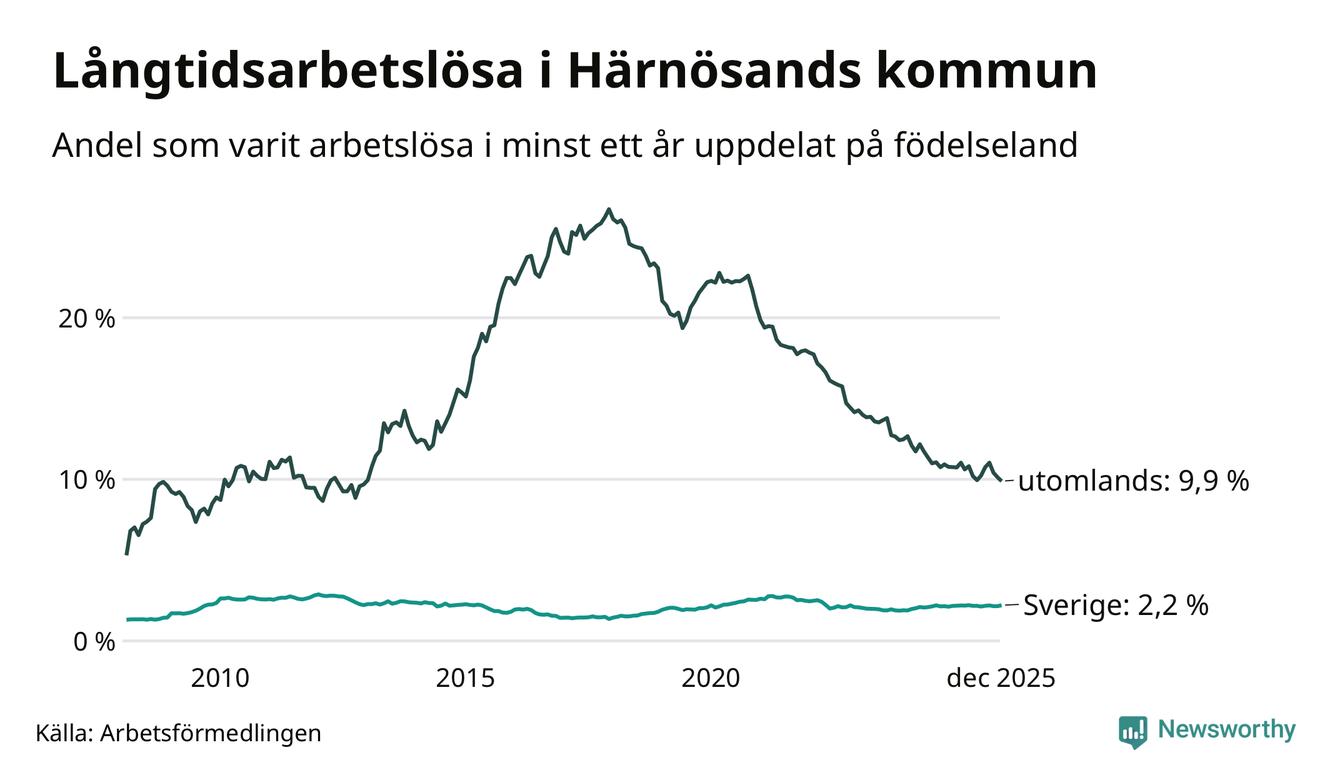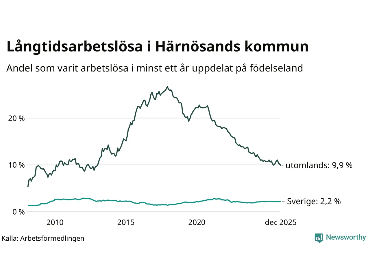 198 av de långtidsarbetslösa i Härnösand är födda i Sverige, medan 209 är födda utomlands. Det innebär att långtidsarbetslösheten bland Sverigefödda är 2,2 procent, medan den är fem gånger så hög – 9,9 procent – bland födda utomlands. Även i riket som helhet är arbetslösheten högre bland utrikesfödda.
