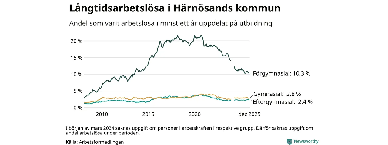 Andelen som varit utan arbete i minst ett år i Härnösand var ungefär lika stor i december jämfört med samma månad för ett år sedan. Det visar Arbetsfömedlingens senaste månadsstatistik.