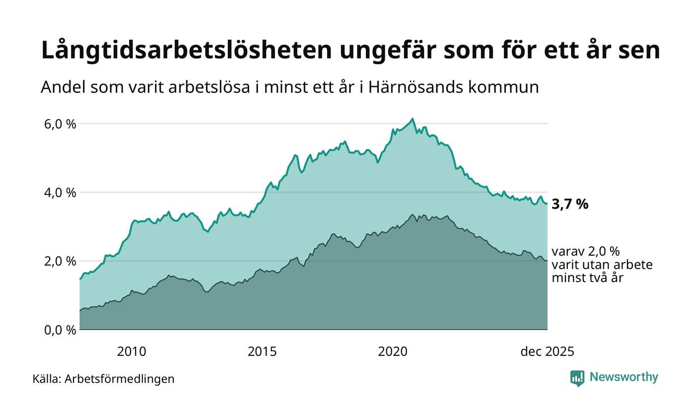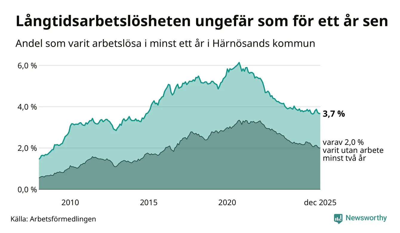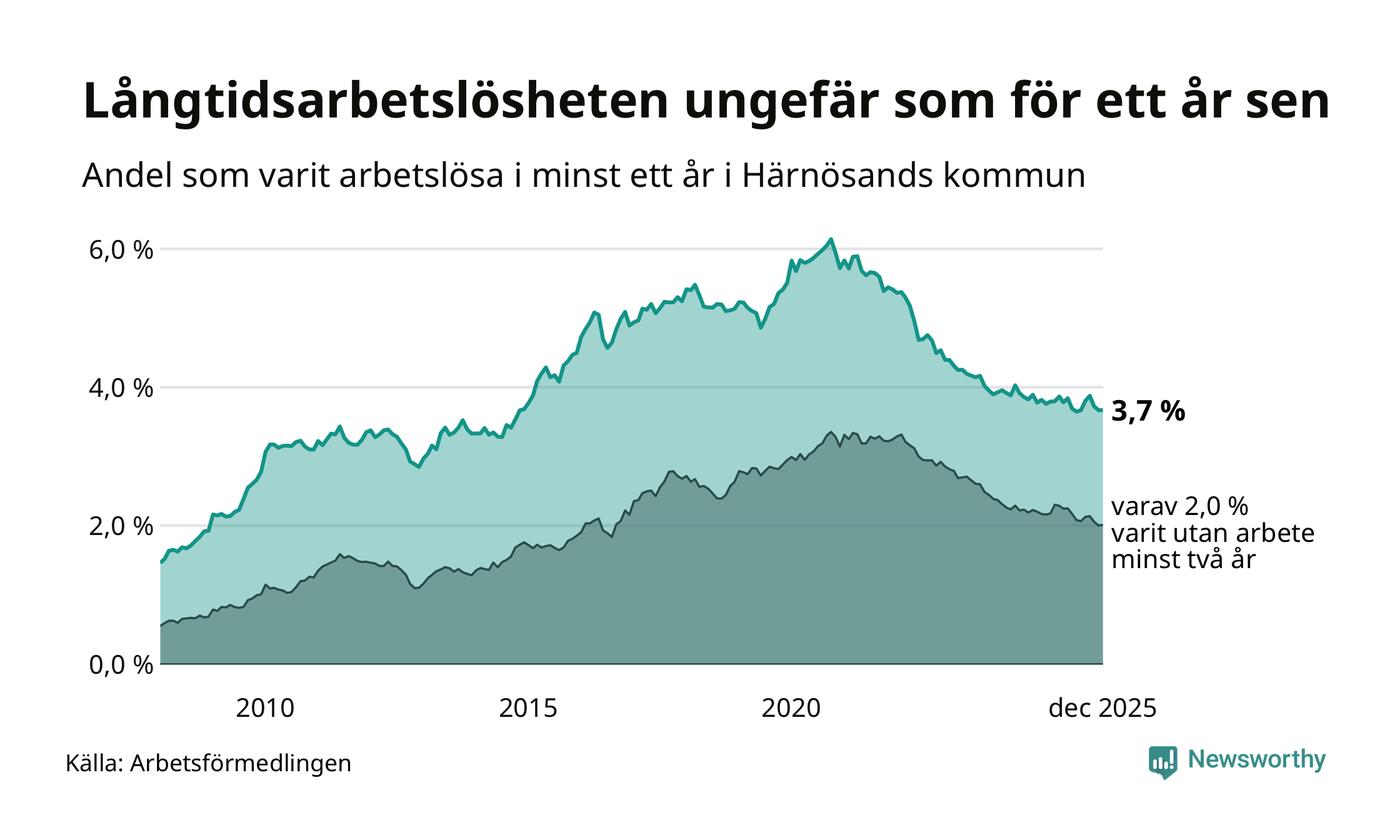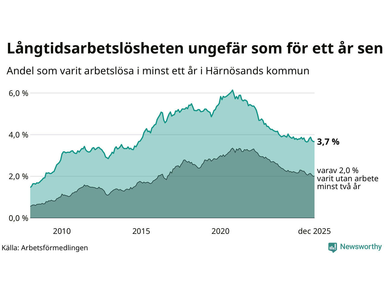 Andelen långtidsarbetslösa i Härnösand är den högsta i Västernorrlands län. I Ånge finns länets lägsta långtidsarbetslöshet, 1,8 procent. I Västernorrland som helhet hade 2 850 personer (2,5 procent) varit arbetslösa i minst ett år i december. Det är nio personer fler än månaden innan.