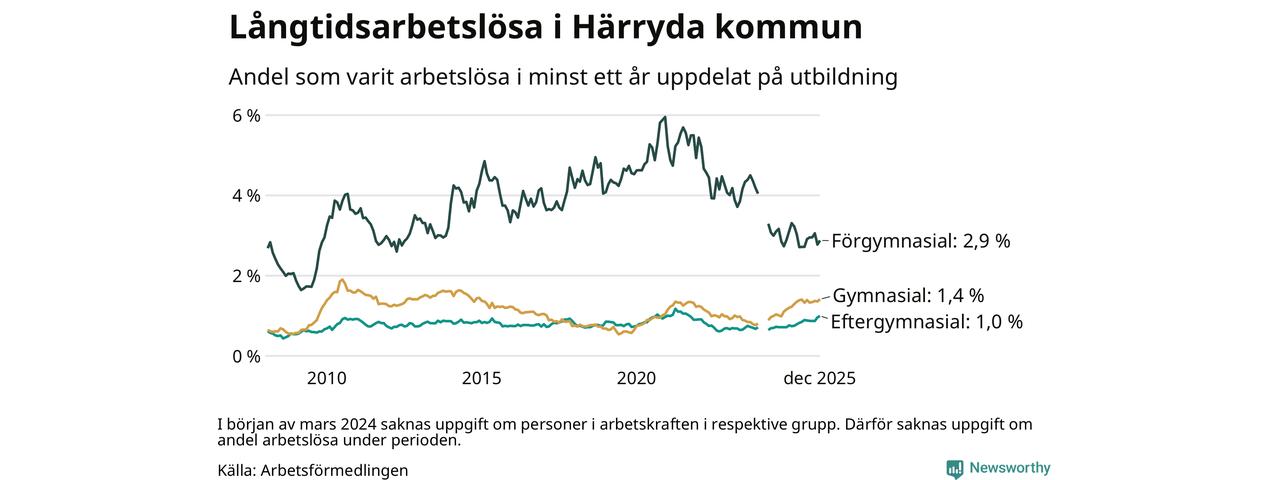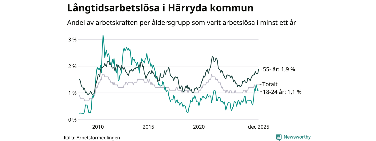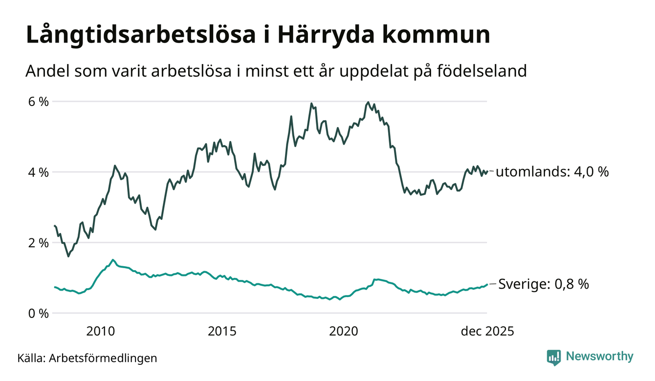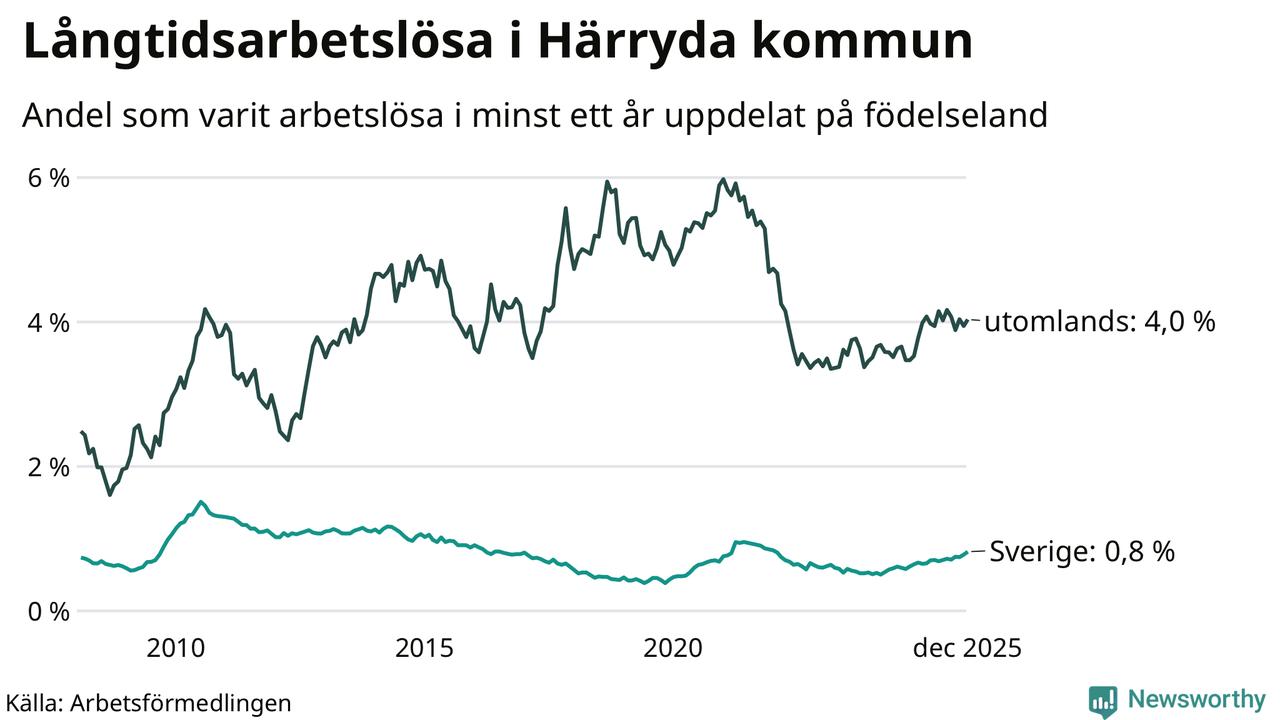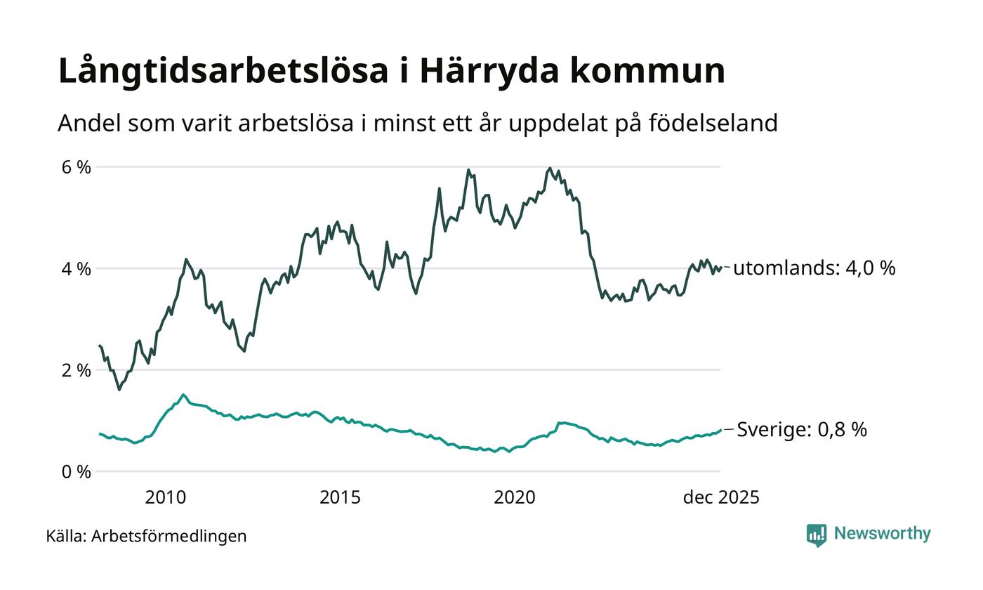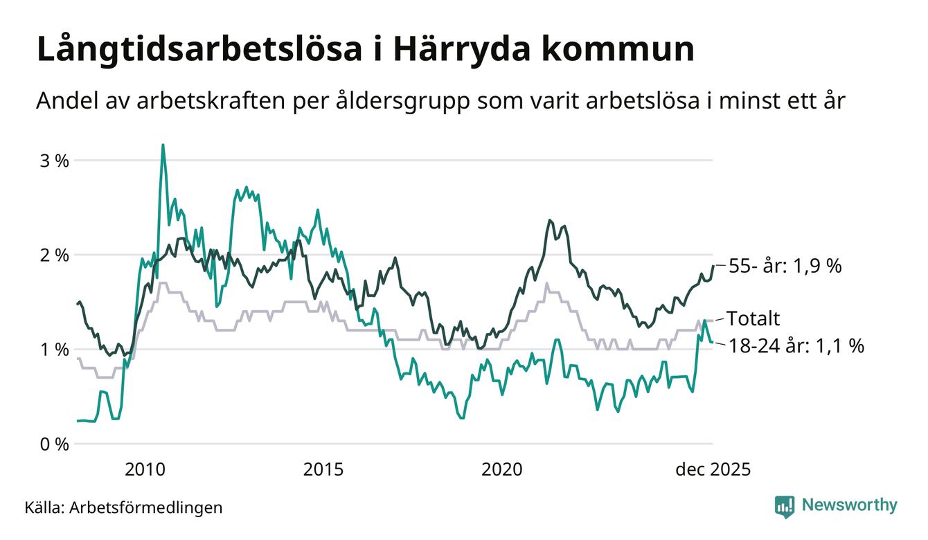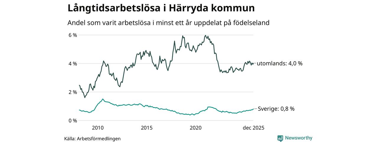I december hade 274 Härrydabor varit arbetslösa i minst ett år, vilket är tio fler än månaden innan. Det är den fjärde månaden i rad med ökande antal långtidsarbetslösa. 274 personer motsvarar 1,3 procent av arbetskraften i kommunen – andelen långtidsarbetslösa är ungefär på samma nivå som för ett år sedan.