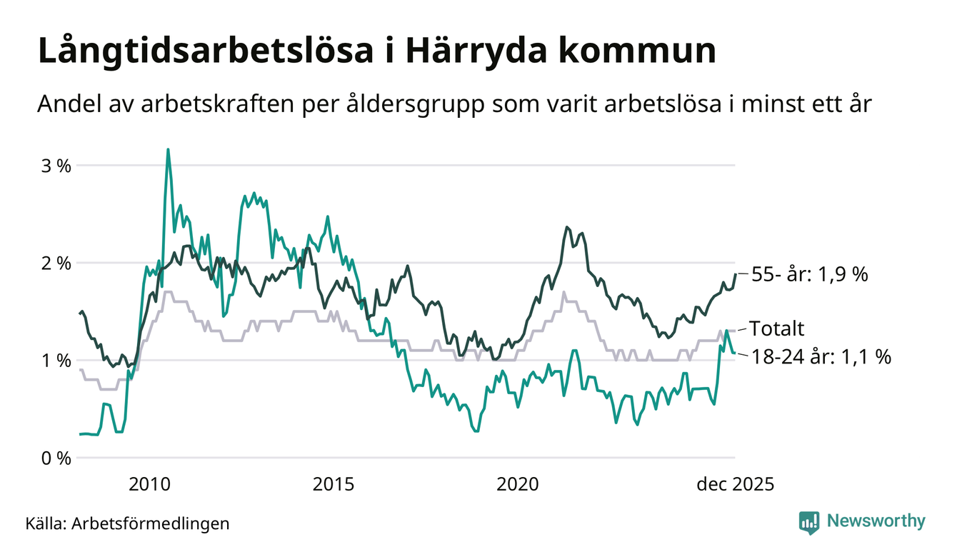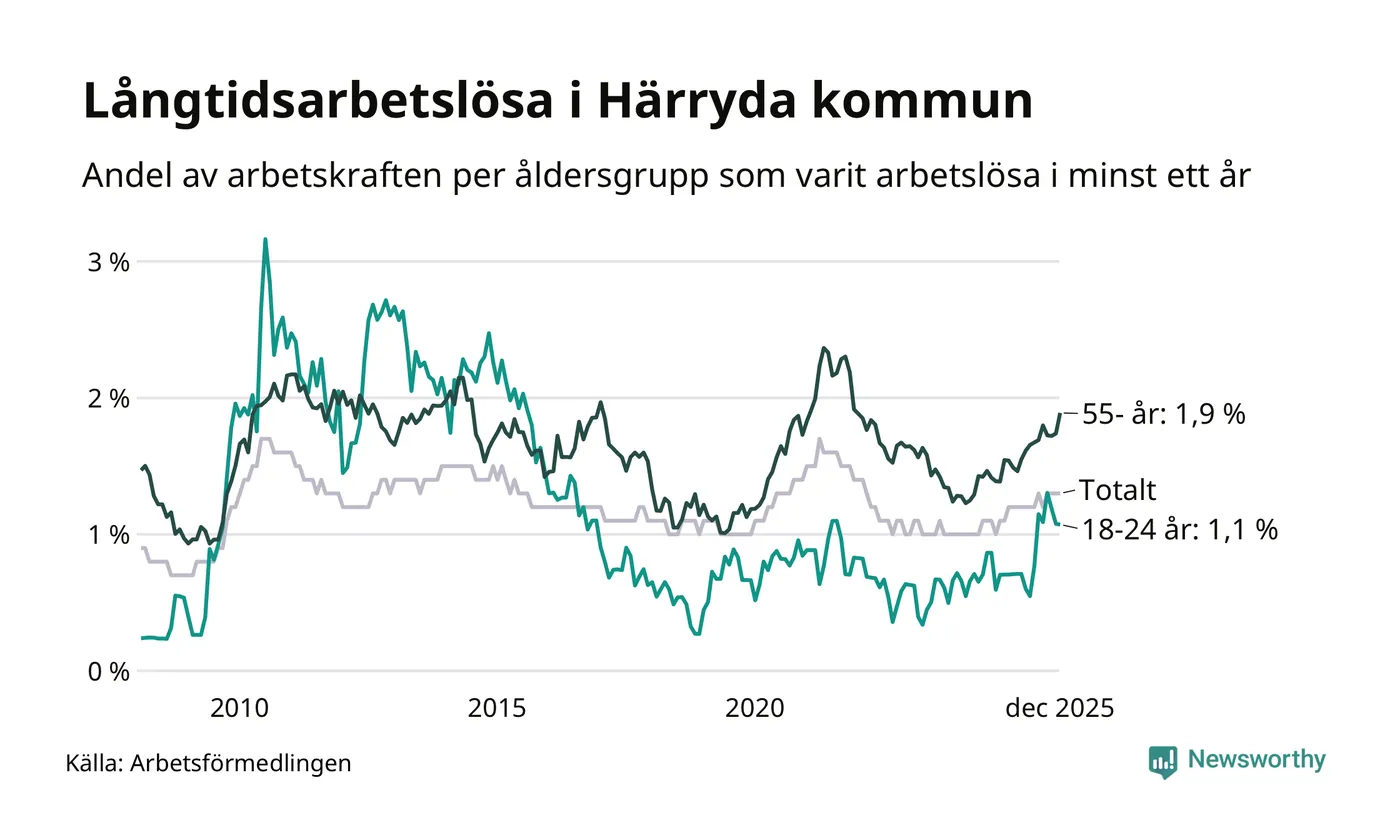 Av de 274 personerna som varit arbetslösa i mer än ett år i Härryda kommun är 85 personer mellan 55 och 651 år och 20 är mellan 18 och 24 år. För den äldre gruppen är andelen arbetslösa 1,9 procent medan den i den yngre gruppen är 1,1 procent. Även i riket som helhet är långtidsarbetslösheten högre i gruppen äldre.