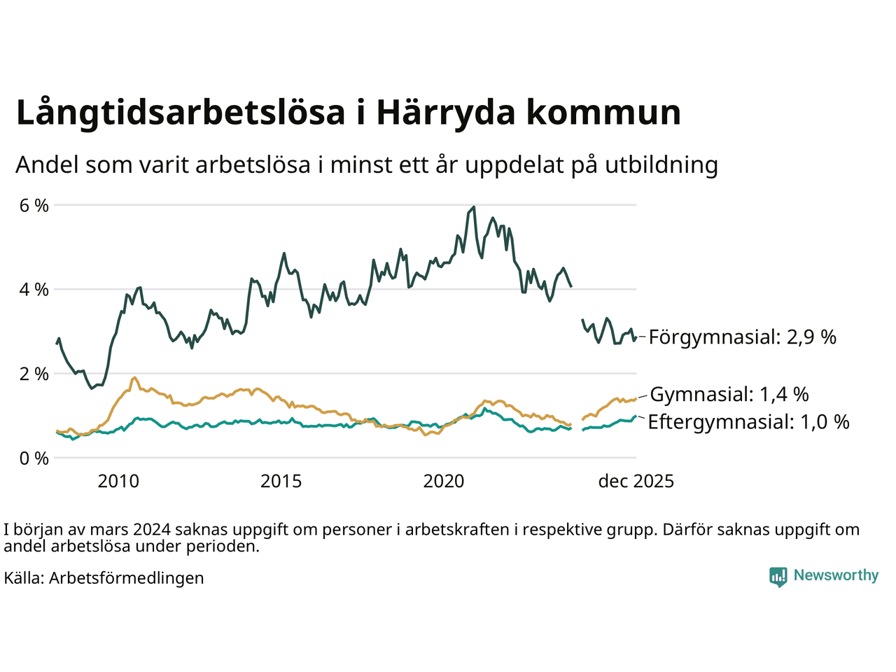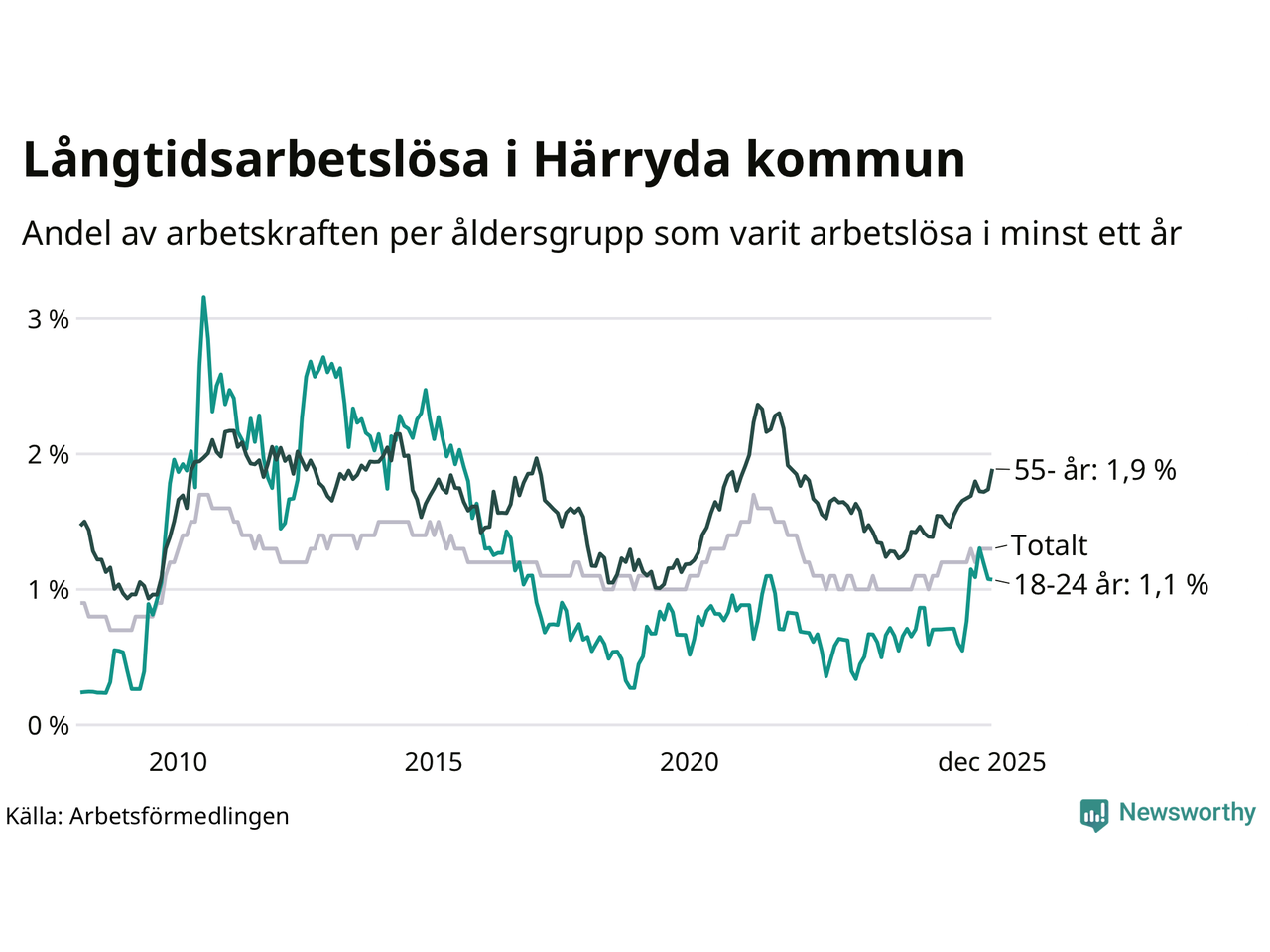 | Andel arbetslösa i minst ett år | 1,3 % | 2,5 % | 2,9 % |