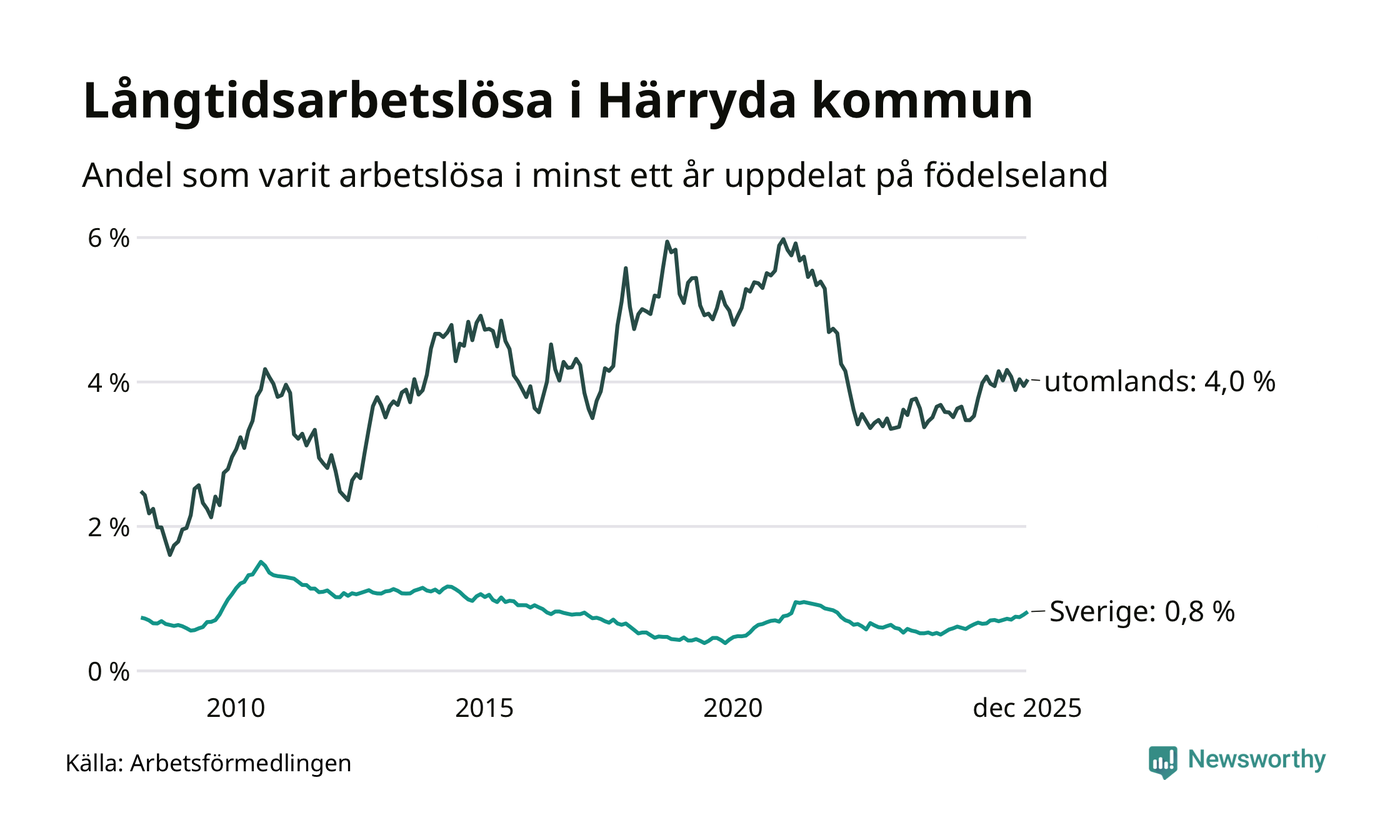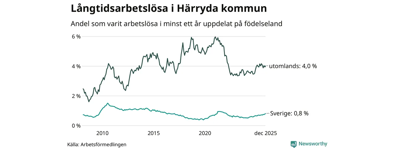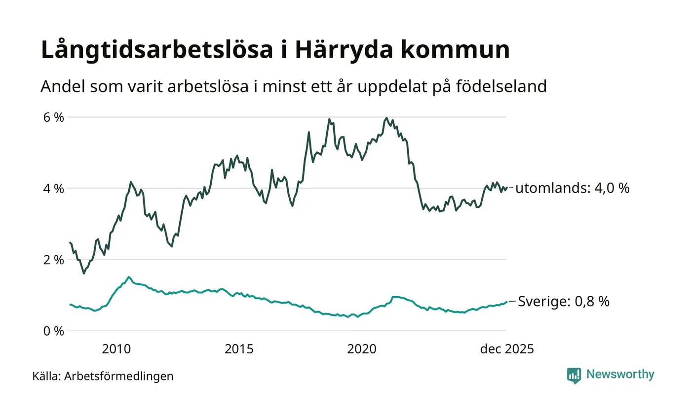 141 av de långtidsarbetslösa i Härryda är födda i Sverige, medan 133 är födda utomlands. Det innebär att långtidsarbetslösheten bland Sverigefödda är 0,8 procent, medan den är fem gånger så hög – 4,0 procent – bland födda utomlands. Även i riket som helhet är arbetslösheten högre bland utrikesfödda.