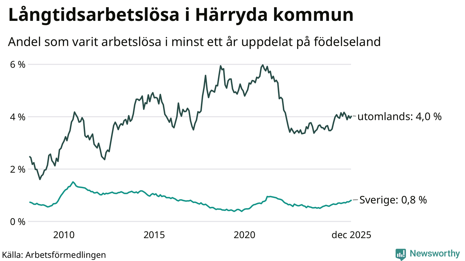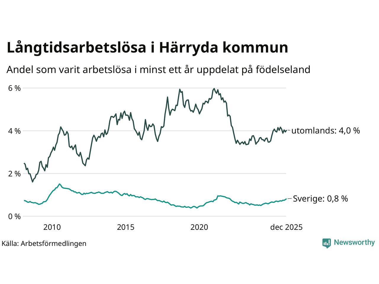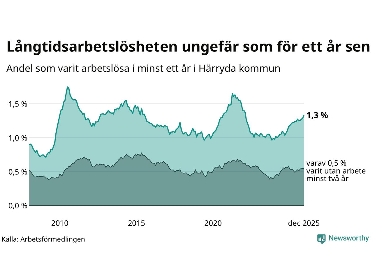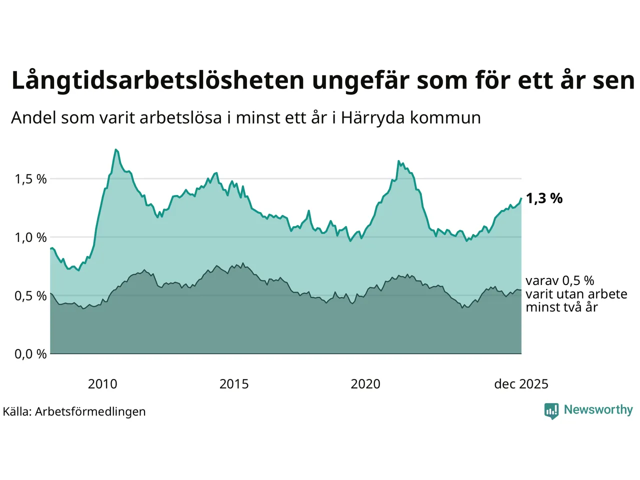 | Andel arbetslösa i minst två år | 0,5 % | 1,3 % | 1,5 % |