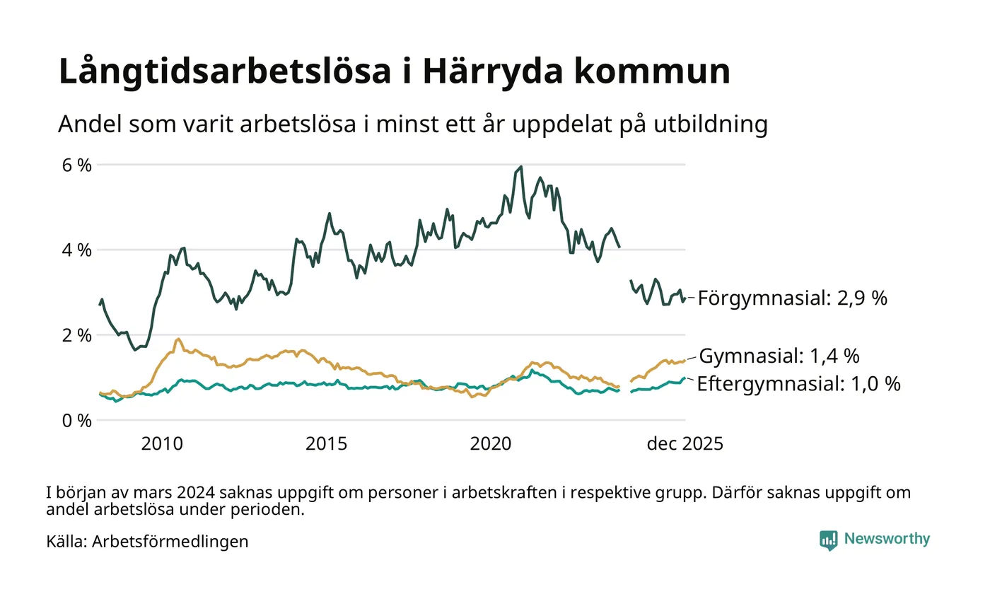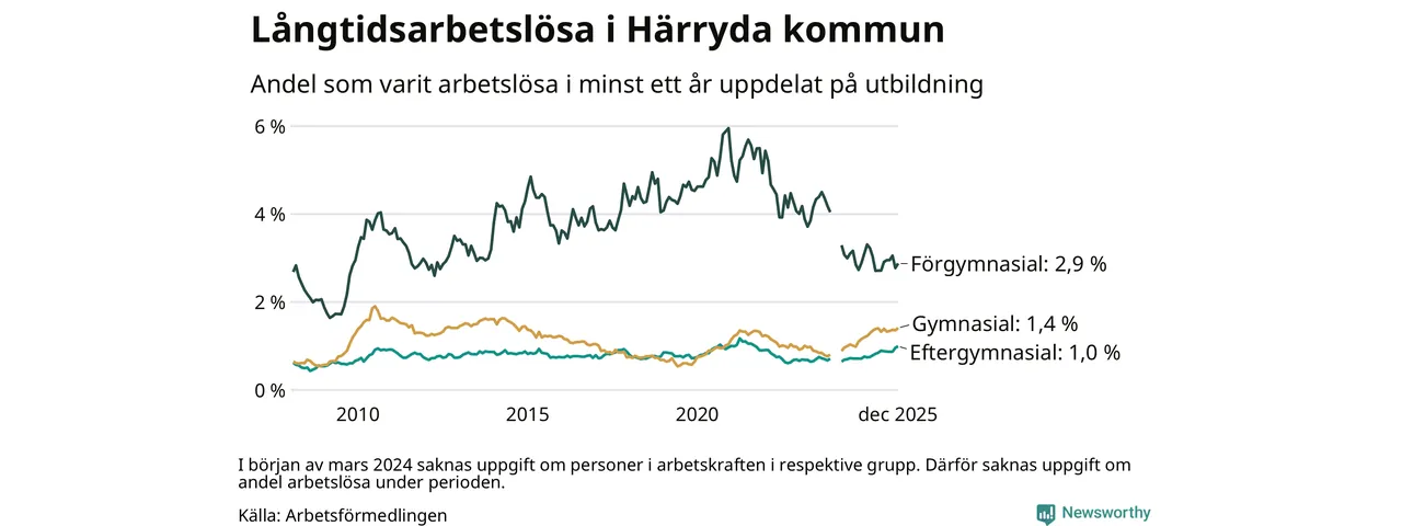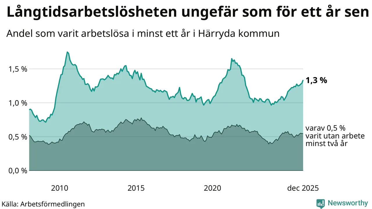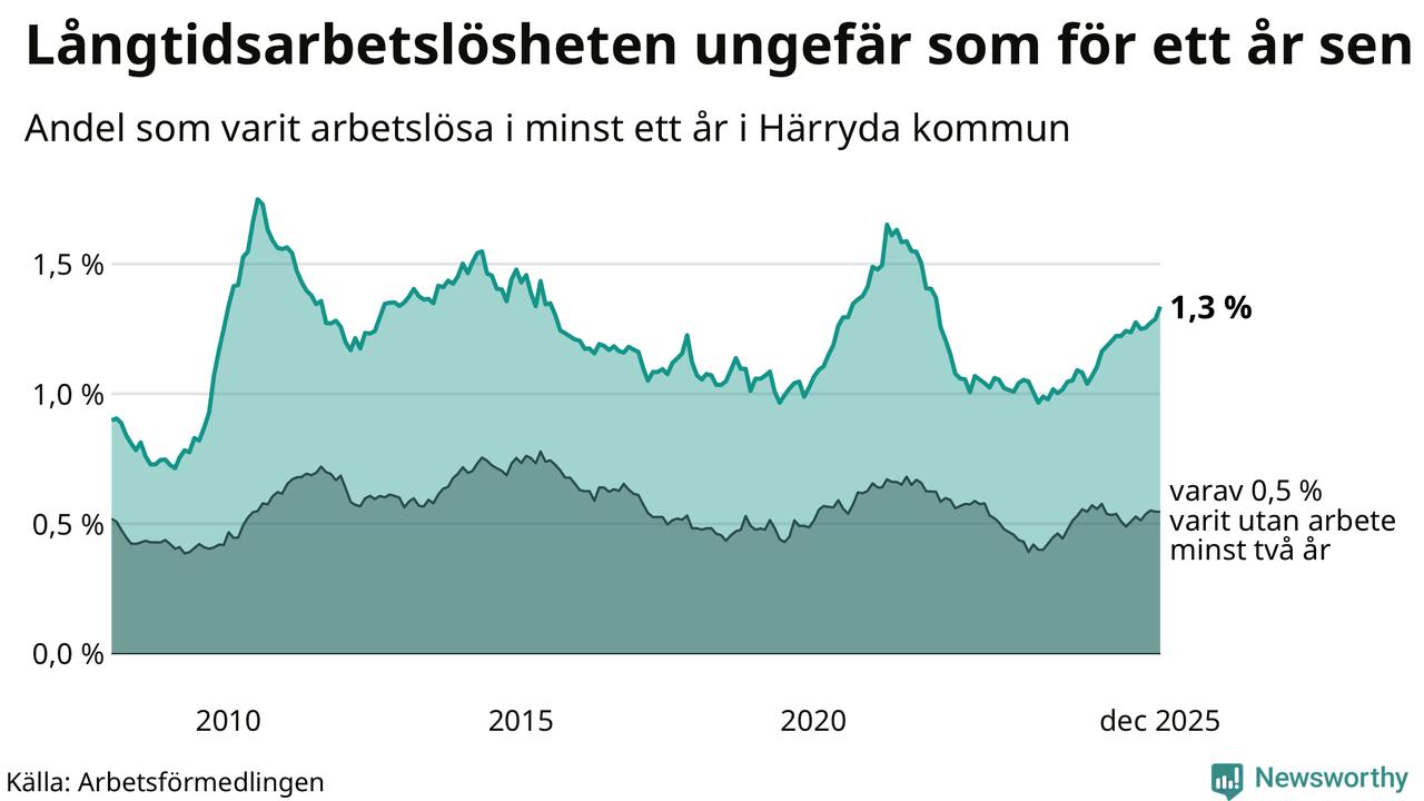 Andelen som varit utan arbete i minst ett år i Härryda var ungefär lika stor i december jämfört med samma månad för ett år sedan. Det visar Arbetsfömedlingens senaste månadsstatistik.