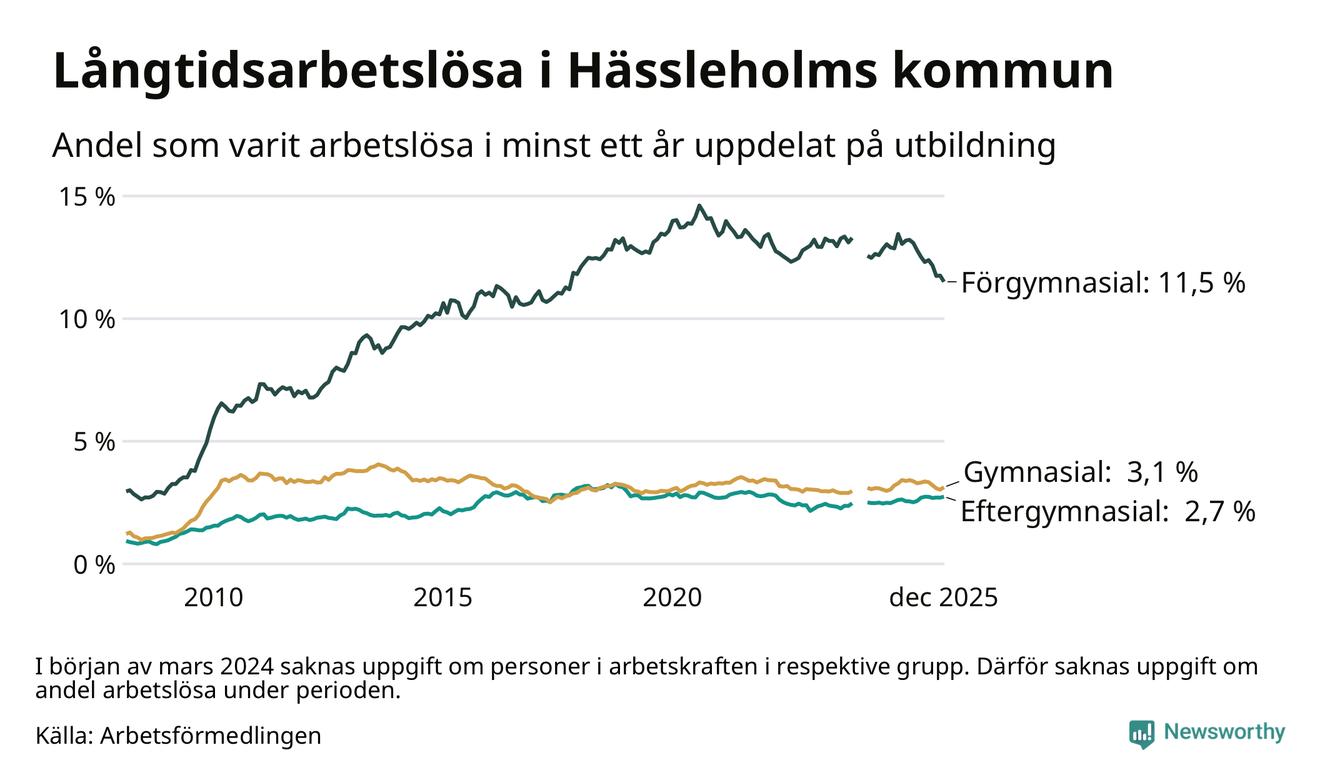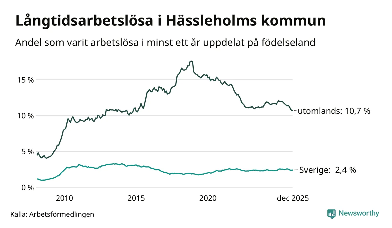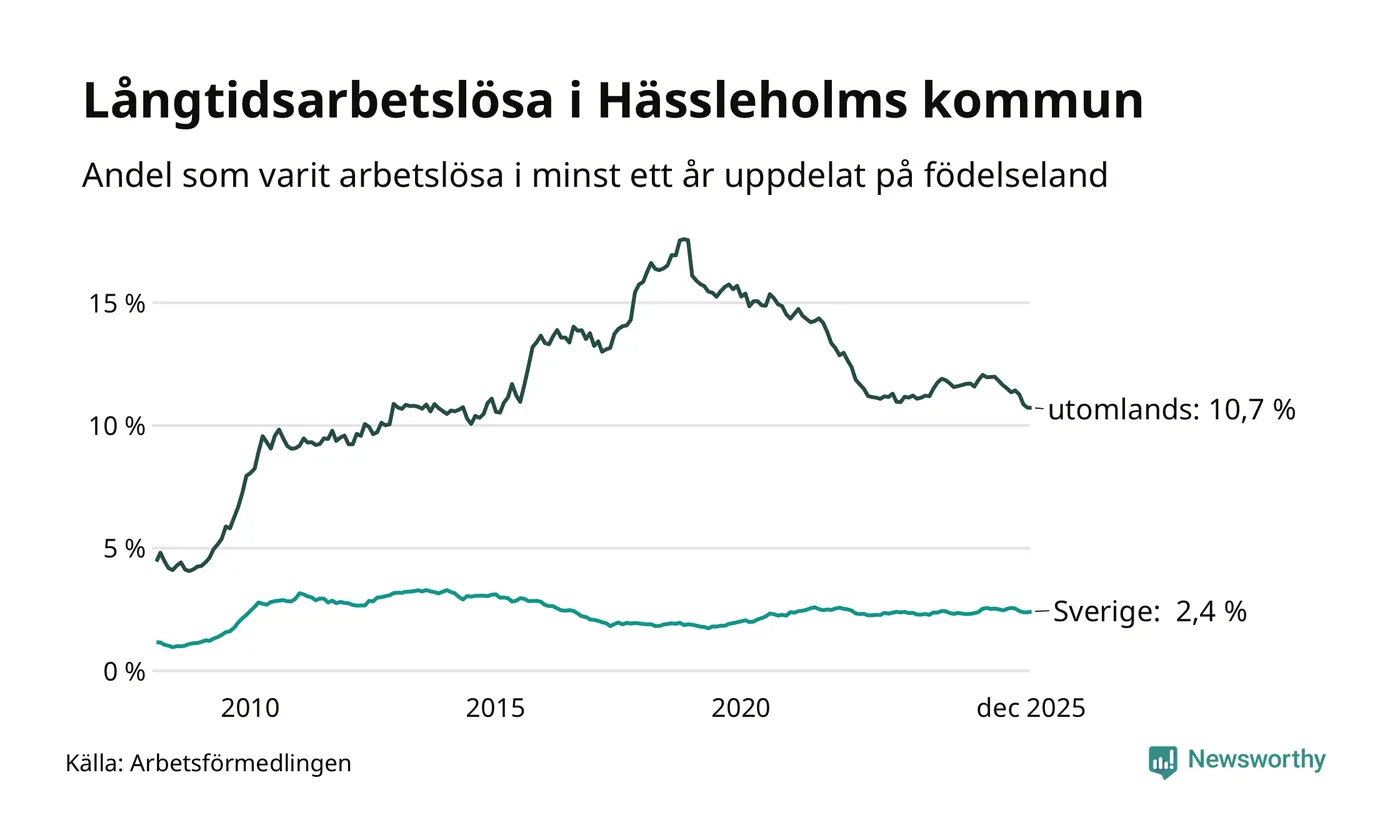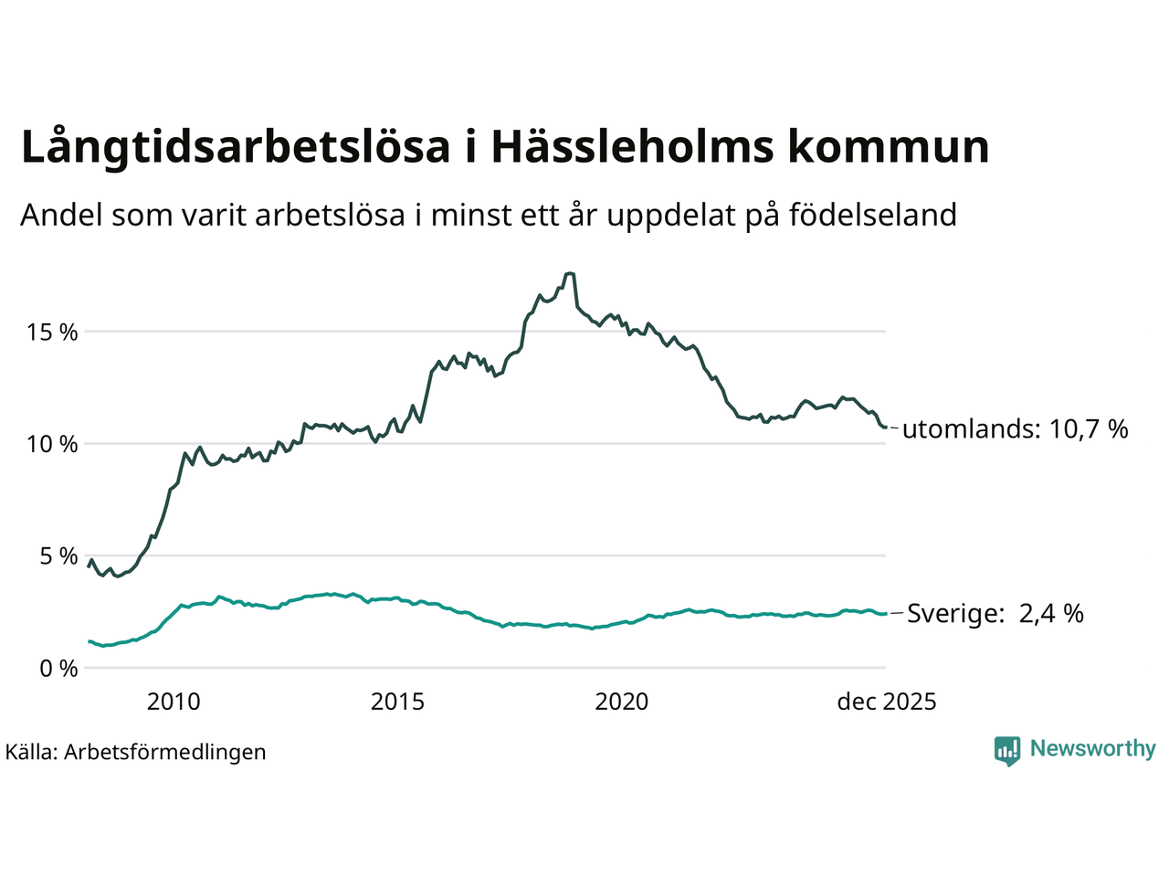 I december hade 1 042 Hässleholmsbor varit arbetslösa i minst ett år, vilket är sex fler än månaden innan. Det är den första månaden sedan juli 2025 som antalet arbetslösa ökar. 1 042 personer motsvarar 4,2 procent av arbetskraften i kommunen – andelen långtidsarbetslösa är 0,4 procentenheter lägre än samma månad för ett år sedan. Hässleholm tillhör de kommuner som har högst andel långtidsarbetslösa i hela landet just nu.