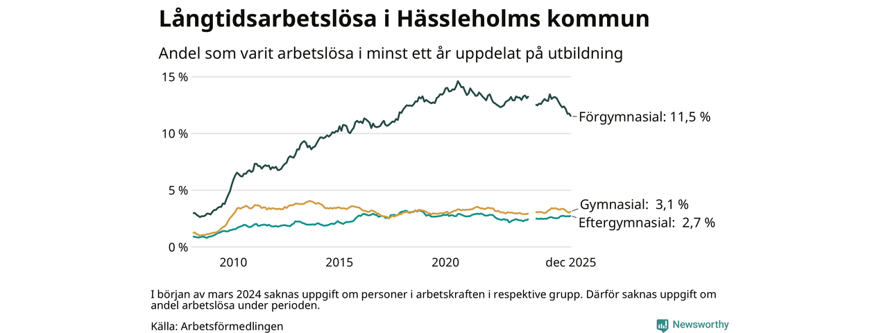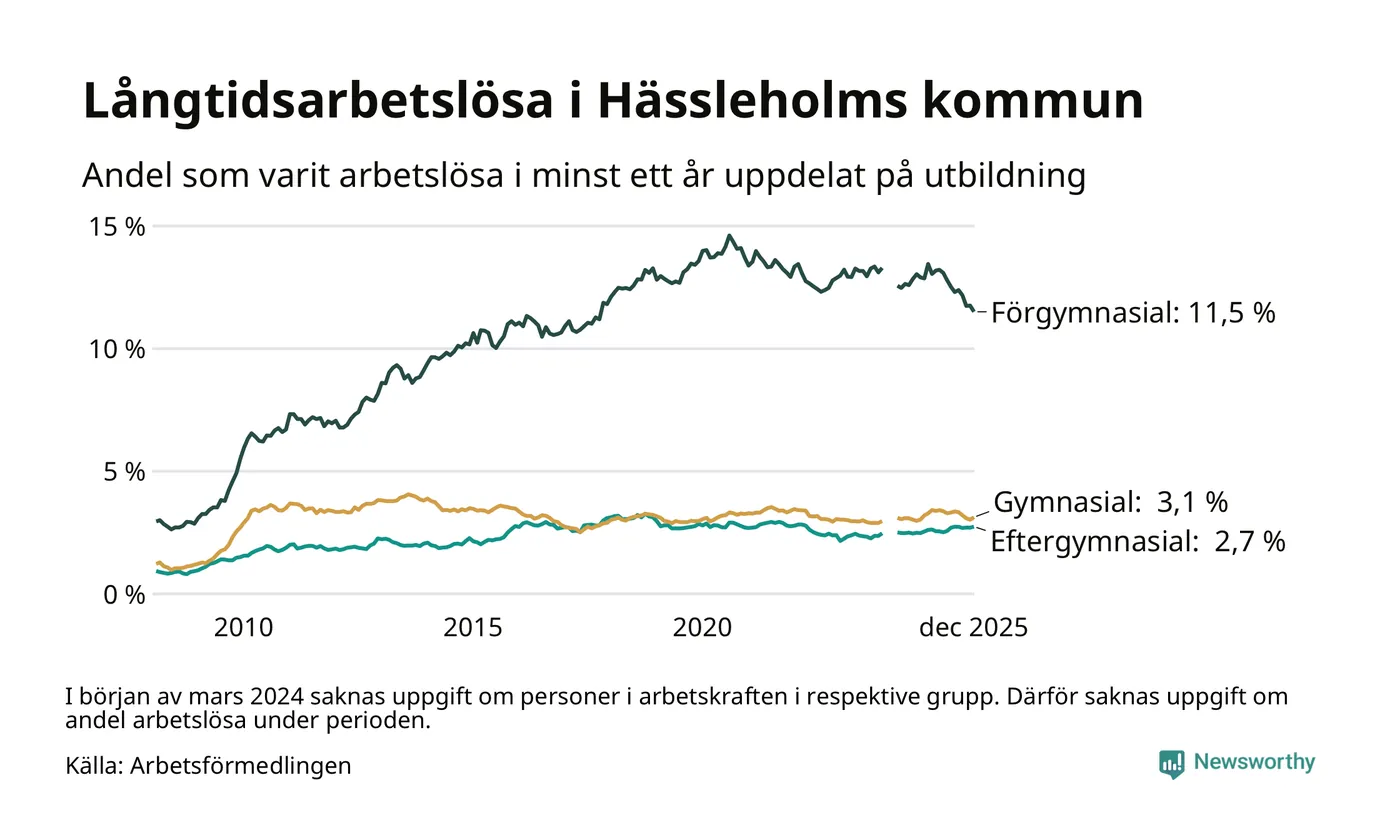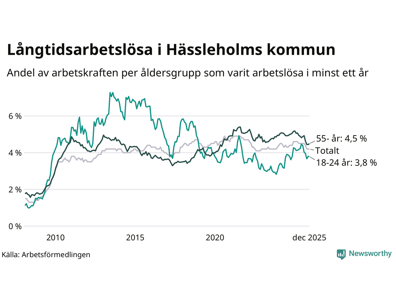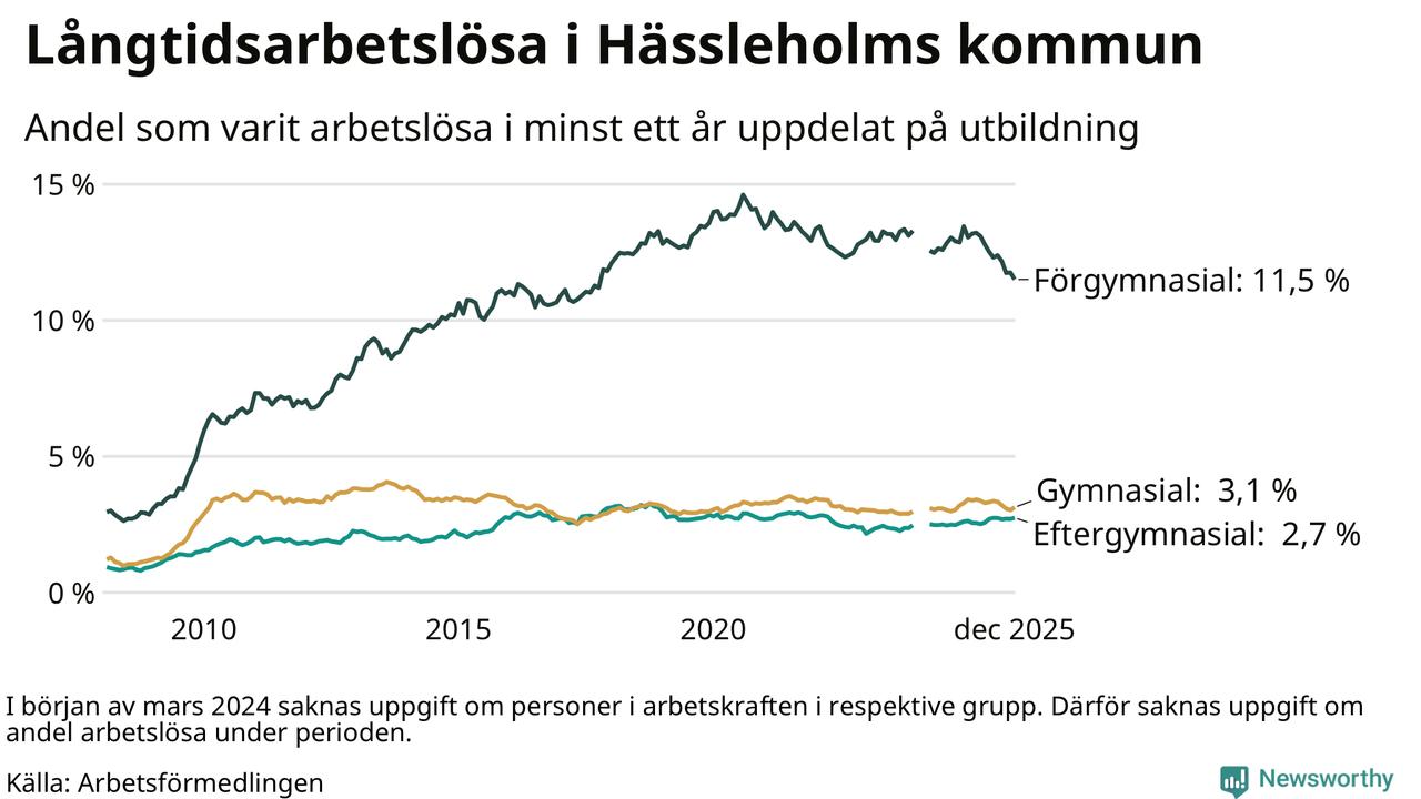 I december hade 1 042 Hässleholmsbor varit arbetslösa i minst ett år, vilket är sex fler än månaden innan. Det är den första månaden sedan juli 2025 som antalet arbetslösa ökar. 1 042 personer motsvarar 4,2 procent av arbetskraften i kommunen – andelen långtidsarbetslösa är 0,4 procentenheter lägre än samma månad för ett år sedan. Hässleholm tillhör de kommuner som har högst andel långtidsarbetslösa i hela landet just nu.