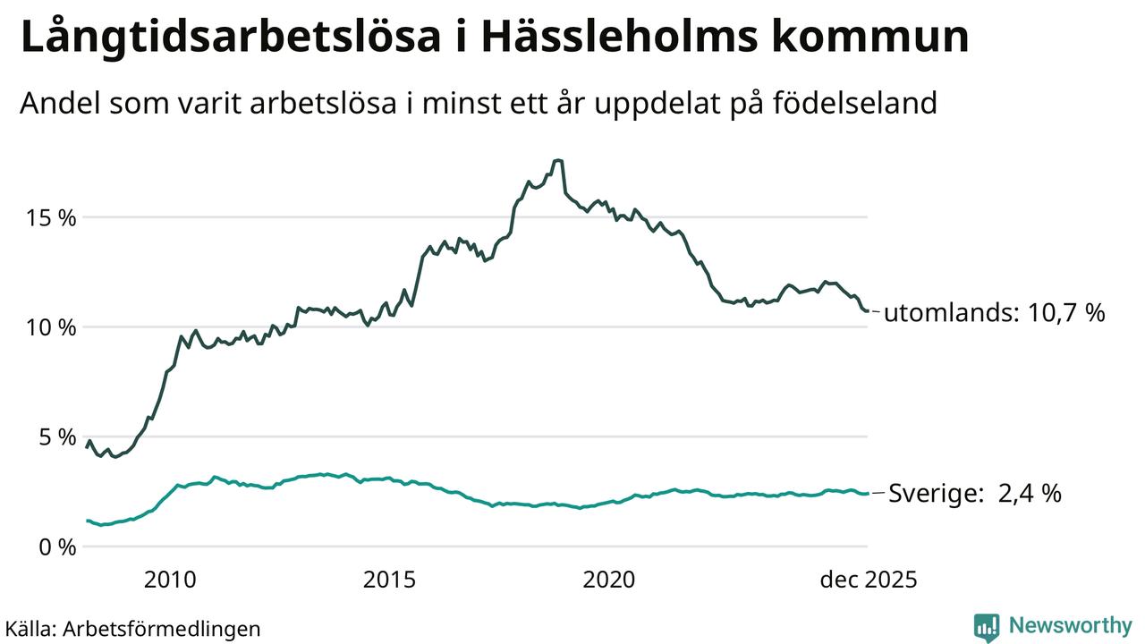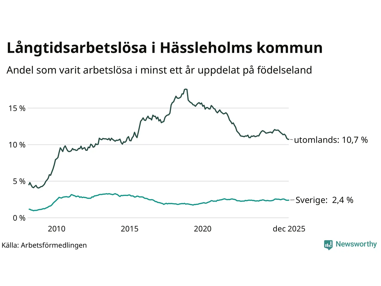 465 av de långtidsarbetslösa i Hässleholm är födda i Sverige, medan 577 är födda utomlands. Det innebär att långtidsarbetslösheten bland Sverigefödda är 2,4 procent, medan den är fyra gånger så hög – 10,7 procent – bland födda utomlands. Även i riket som helhet är arbetslösheten högre bland utrikesfödda.