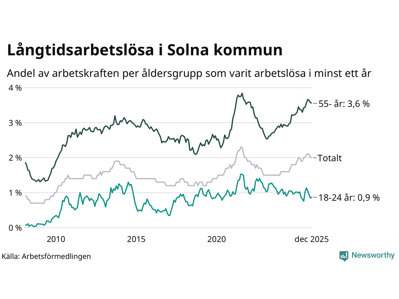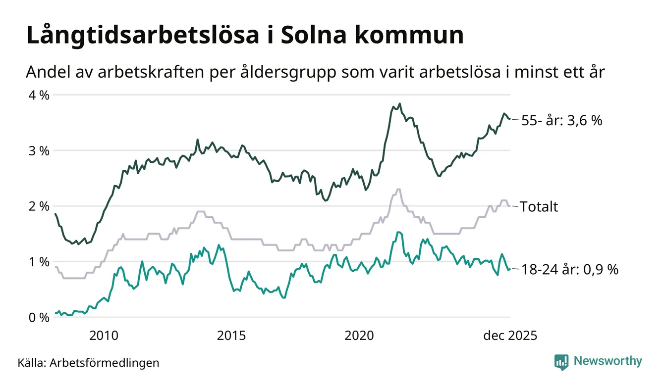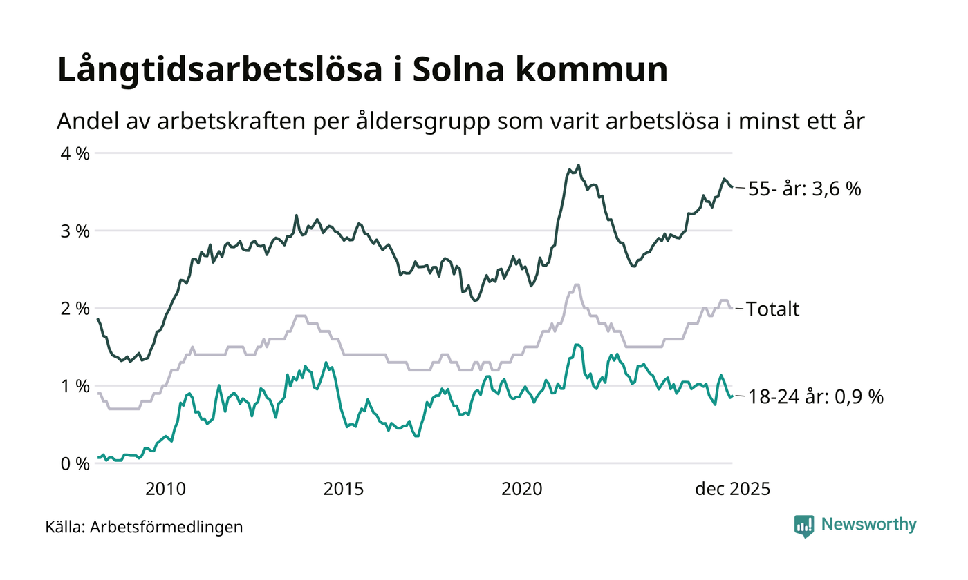 Av de 972 personerna som varit arbetslösa i mer än ett år i Solna kommun är 271 personer mellan 55 och 651 år och 30 är mellan 18 och 24 år. För den äldre gruppen är andelen arbetslösa 3,6 procent medan den i den yngre gruppen är 0,9 procent. Även i riket som helhet är långtidsarbetslösheten högre i gruppen äldre.